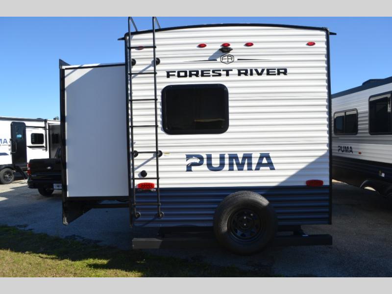 If you're looking for family-fun adventures, then you need one of these Forest River Puma travel trailers! They are built rugged, easy to tow, and jam packed with features. The Darco wrapped underbelly will help protect your unit, and the roof and side mount solar prep gives you the option to add off-grid power. Inside, the Congoleum linoleum will be easy to keep clean, and the night roller shades will provide privacy when it's time to turn in. You'll also enjoy an electric awning with an LED light strip plus an AM/FM/Bluetooth stereo and two outside speakers to keep the party going!