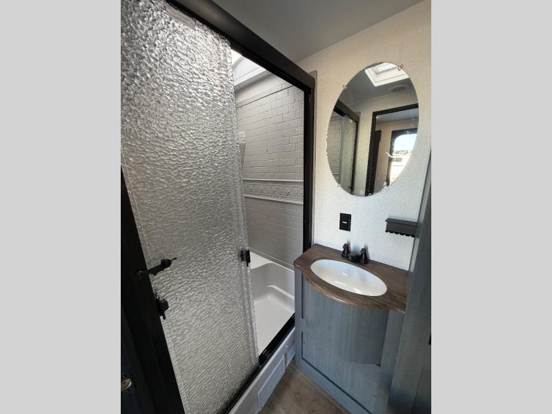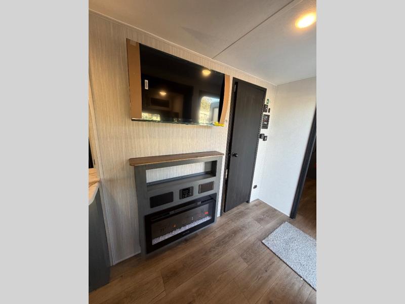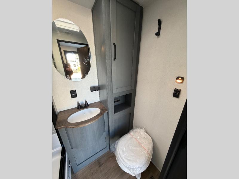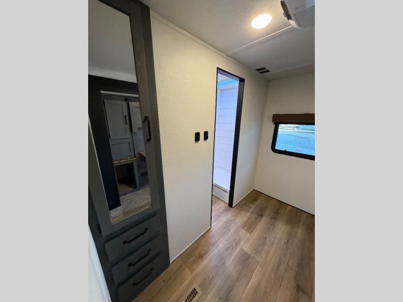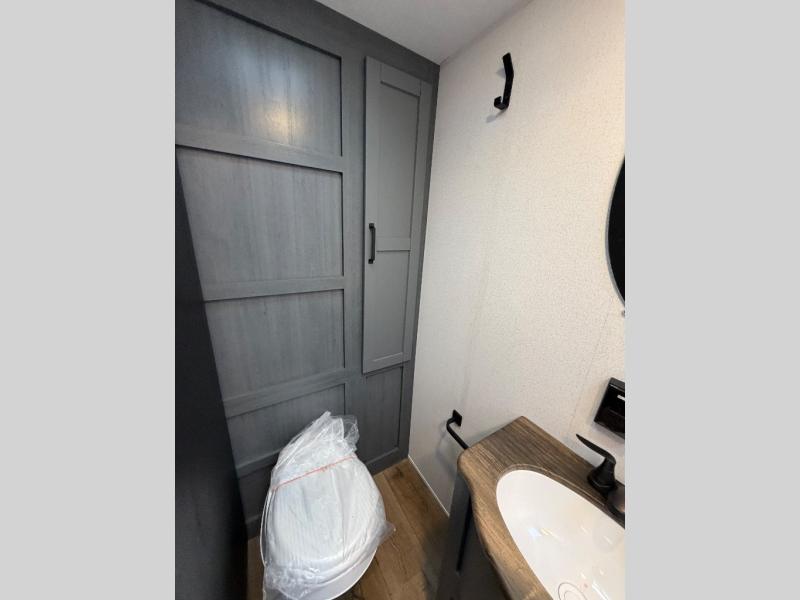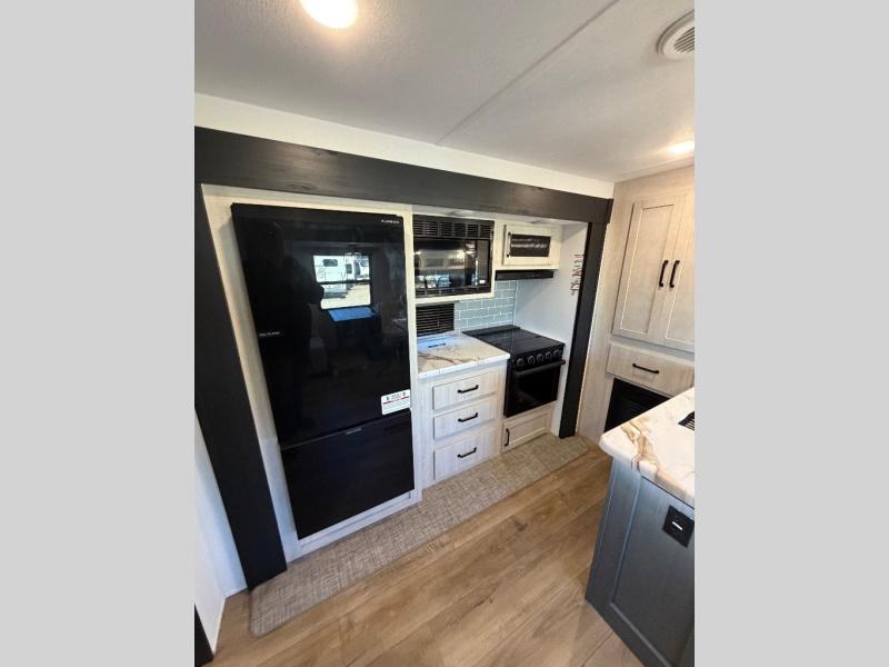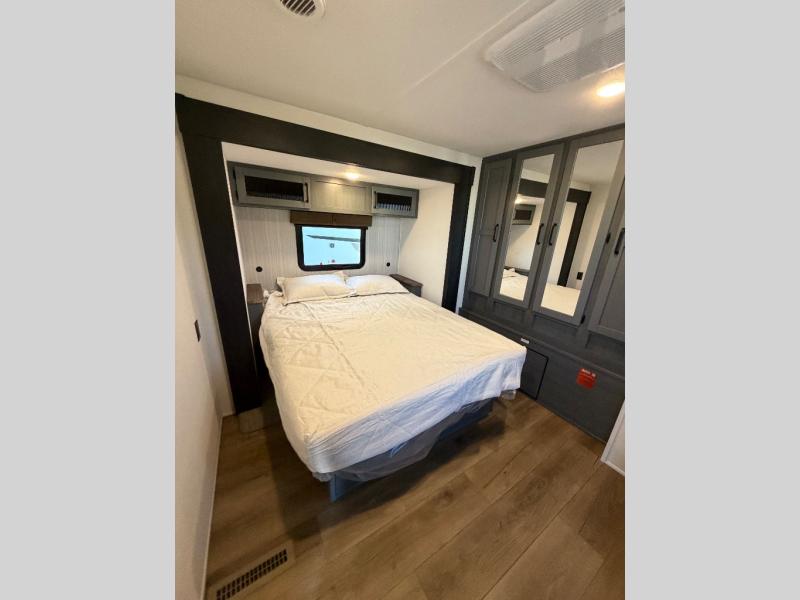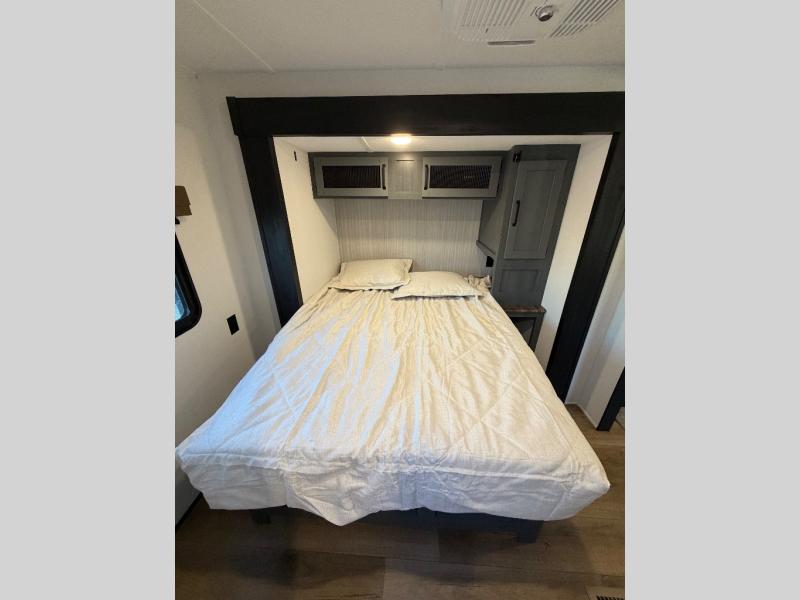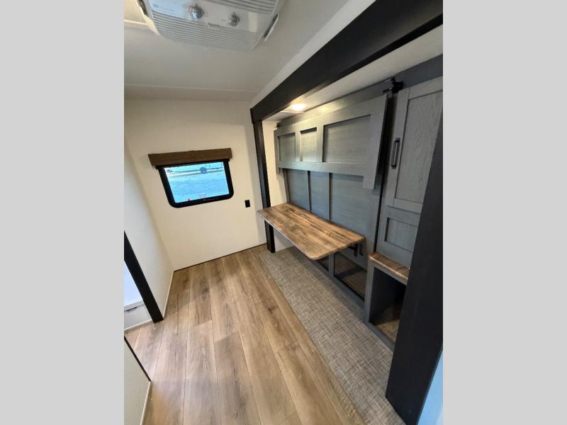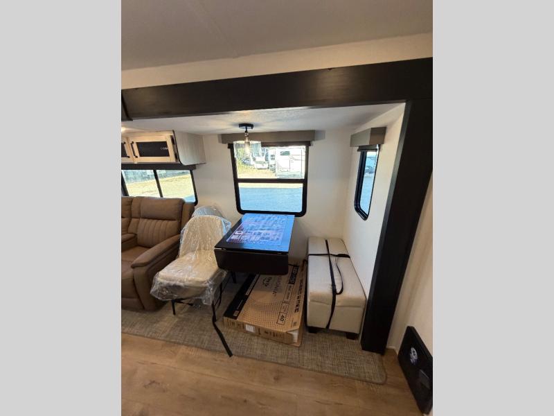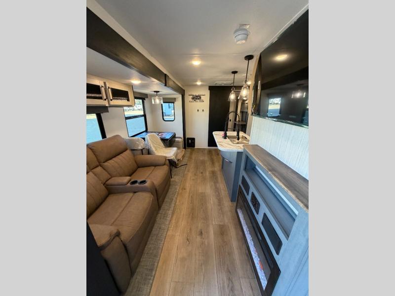 If you enjoy camping with friends or family, this travel trailer will be perfect for you! There are two bedrooms with queen bed slide outs and storage space, plus the rear bedroom includes its own full bath for added comfort. A bunkhouse suite option is also available if you choose the jiffy sofa with a bunk in place of the queen bed in the rear bedroom. Everyone can meet in the combined kitchen and living area that includes a counter peninsula, a spacious pantry, all the kitchen appliances to cook meals, plus a table with chairs and bench seating. There is also a sofa with overhead storage for more seating and sleeping space. Don't let this impressive travel trailer slip away!