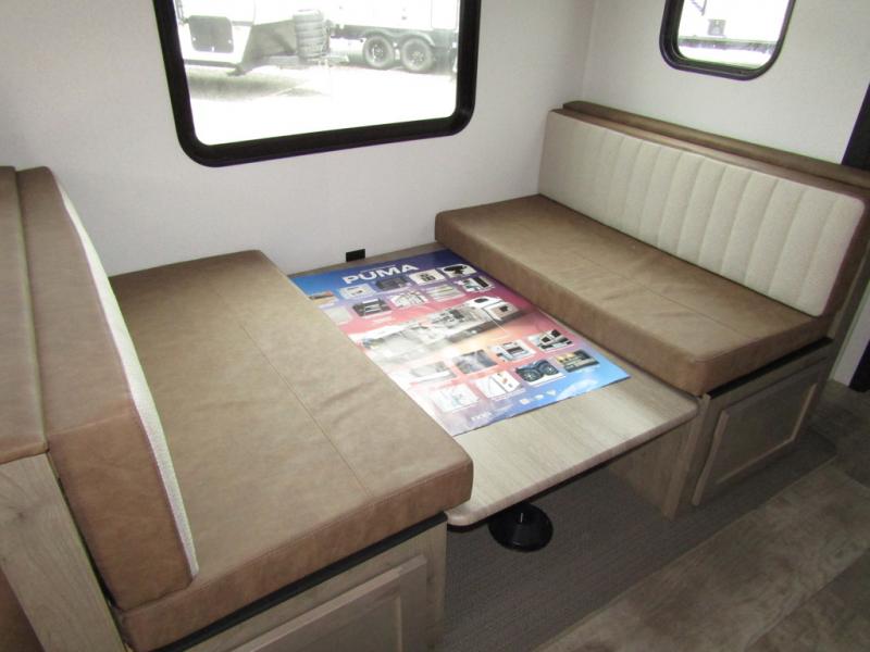 The ultimate travel trailer is found in this Puma! There is ample space to move about thanks to the large slide out and dual entry doors, plus there is a rear patio where you can entertain guests and relax in your camp chairs! The full bath includes a large linen closet to keep bath necessities stocked, and above this room is where you'll find the loft with two bunk mats. The loft looks out on the main living area and kitchen, where you can relax on the sofa, play a game at the booth dinette, and make dinner in the full kitchen. And a front private bedroom provides you with your own space at night!