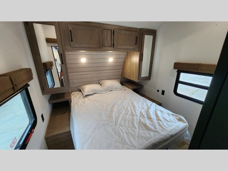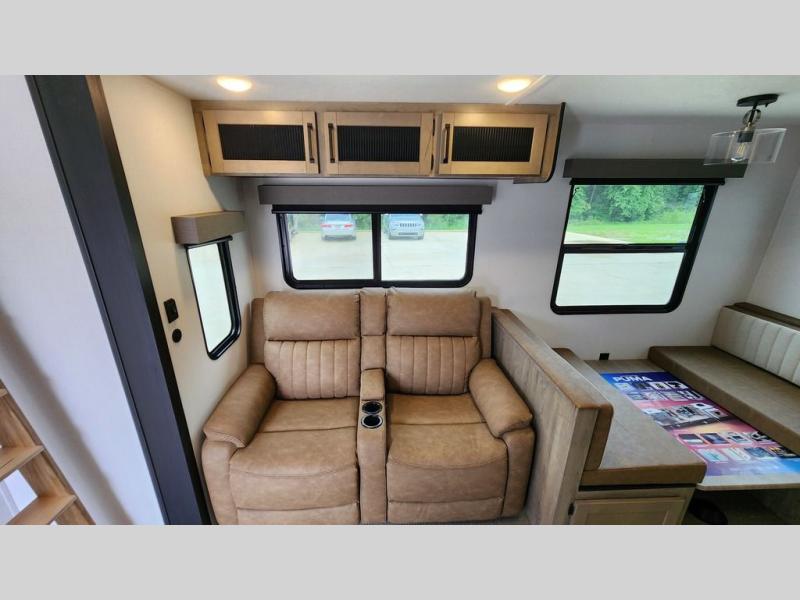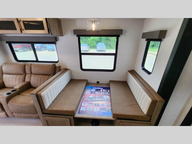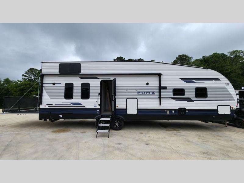 The ultimate travel trailer is found in this Puma! There is ample space to move about thanks to the large slide out and dual entry doors, plus there is a rear patio where you can entertain guests and relax in your camp chairs! The full bath includes a large linen closet to keep bath necessities stocked, and above this room is where you'll find the loft with two bunk mats. The loft looks out on the main living area and kitchen, where you can relax on the sofa, play a game at the booth dinette, and make dinner in the full kitchen. And a front private bedroom provides you with your own space at night!