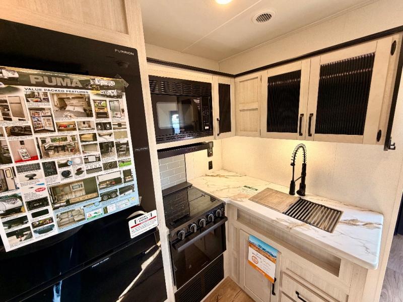 Each Puma Ambush toy hauler travel trailer by Forest River is constructed with a durable tub surround, super lube axles for smooth towing, and a rugged front diamond plate for added protection on the road. You will enjoy premium amenities, including a plush bedspread and pillows, LED lighting, and a bath skylight that brings in natural light. Cook like a five-star chef with the 21" oven and range hood and indulge in entertainment with the AM/FM/Bluetooth stereo and outside speakers, perfect for campsite hangouts. Plus, you will love the convenient night roller shades, the outside shower ideal for outdoor enthusiasts, and so much more. Whether hauling motorcycles, ATVs, or gear for your next outdoor escapade, these toy hauler travel trailers are your ultimate adventure companion—built for comfort, convenience, and unforgettable trips.