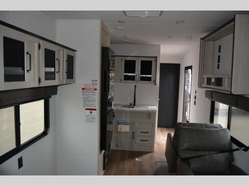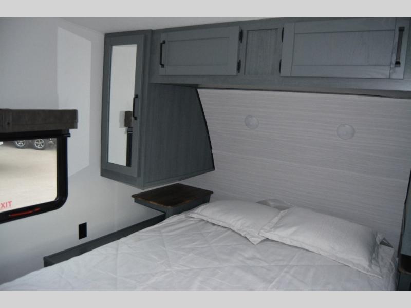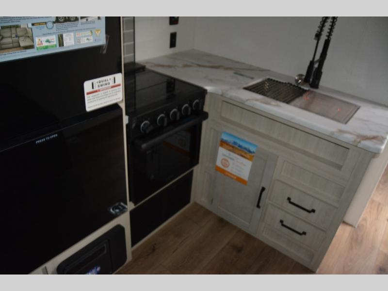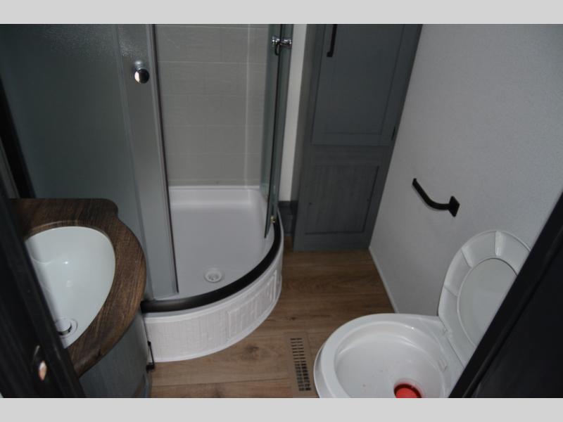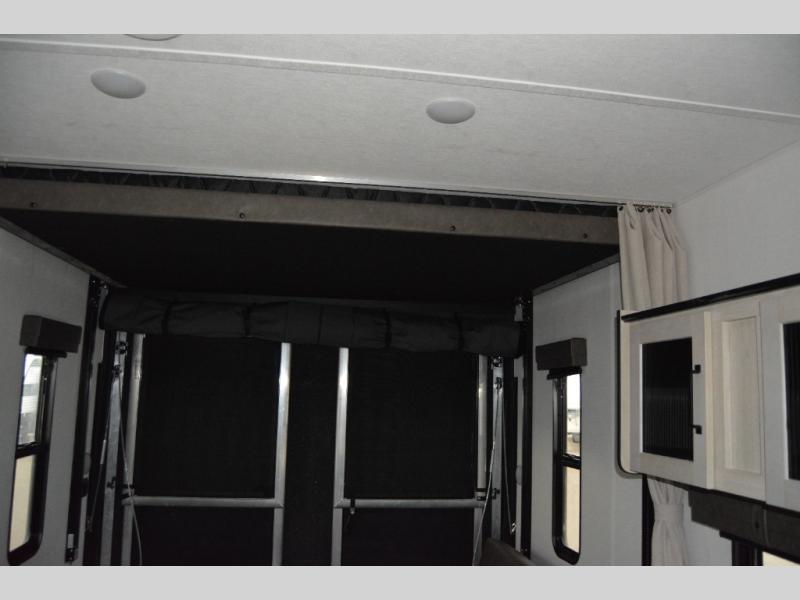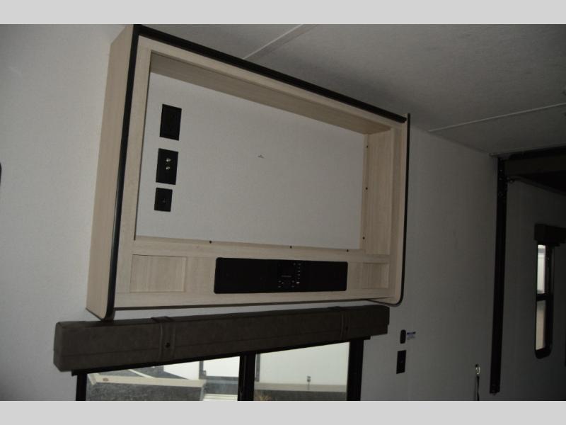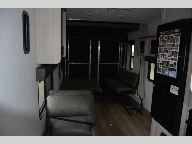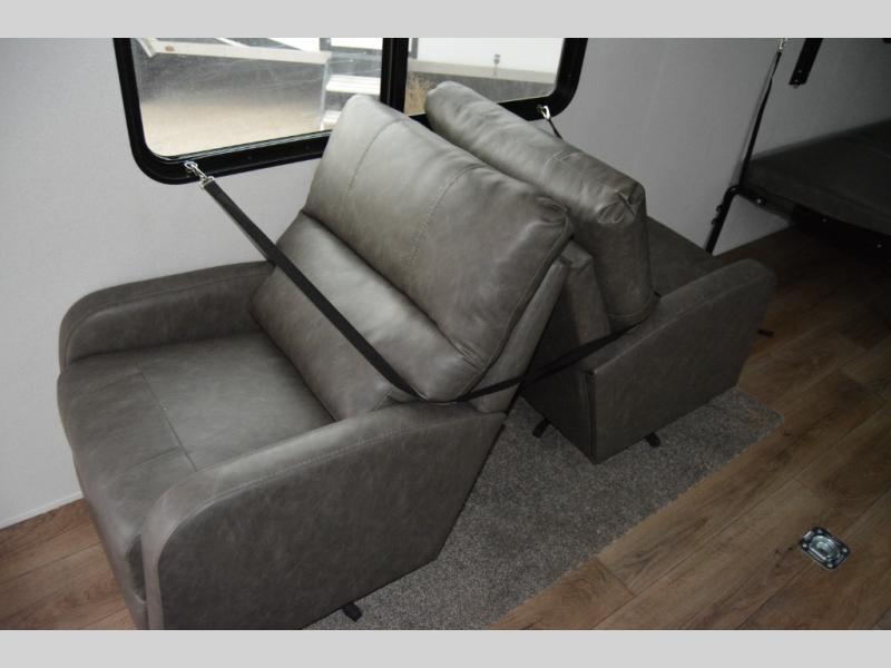 If space for toys is what you want, space is what you'll get in this toy hauler! There is an 11' garage with 15' 10" total garage space when you use the tie-downs in the kitchen. Your crew can get comfortable on the rollover sleeper sofas or on the dual lounge chairs. The full bath with a 34" x 34" radius shower will let everyone stay clean, and the front private bedroom will feel just like home with its RV queen bed and dual shirt closets. If you need additional sleeping space for guests, you can add the optional queen bed electric lift in the garage!