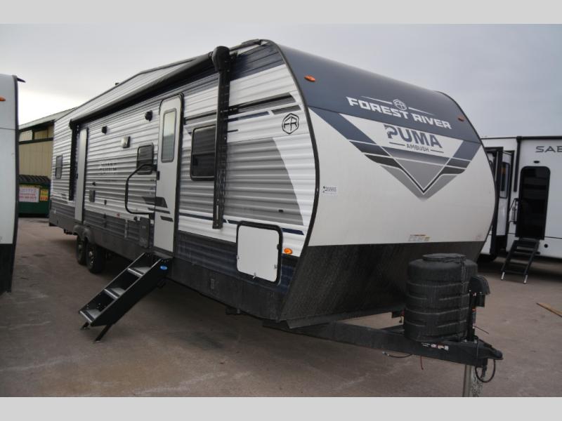 Each Puma Ambush toy hauler travel trailer by Forest River is constructed with a durable tub surround, super lube axles for smooth towing, and a rugged front diamond plate. You will enjoy premium amenities, including a plush bedspread and pillows, LED lighting, and a bath skylight. Cook like a five-star chef with the 21" oven and range hood and indulge in entertainment with the AM/FM/Bluetooth stereo and outside speakers. Plus, you will love the convenient night roller shades, the outside shower ideal for outdoor enthusiasts, and so much more! Whether hauling motorcycles, ATVs, or gear for your next outdoor escapade, these toy hauler travel trailers are your ultimate adventure companion.