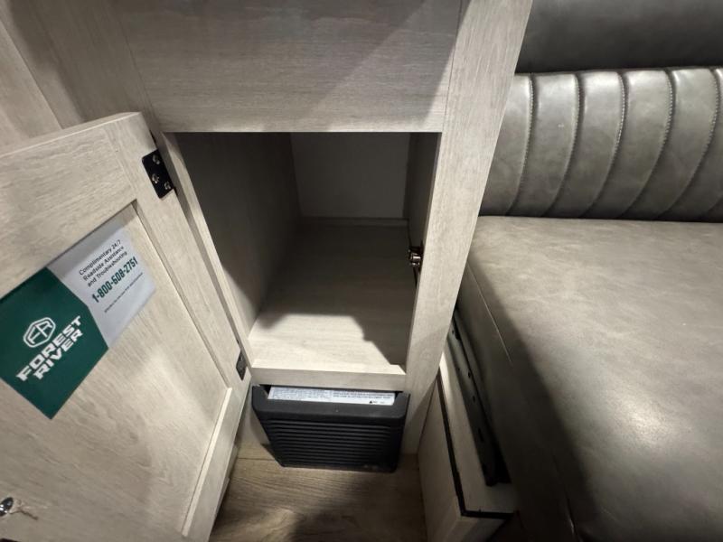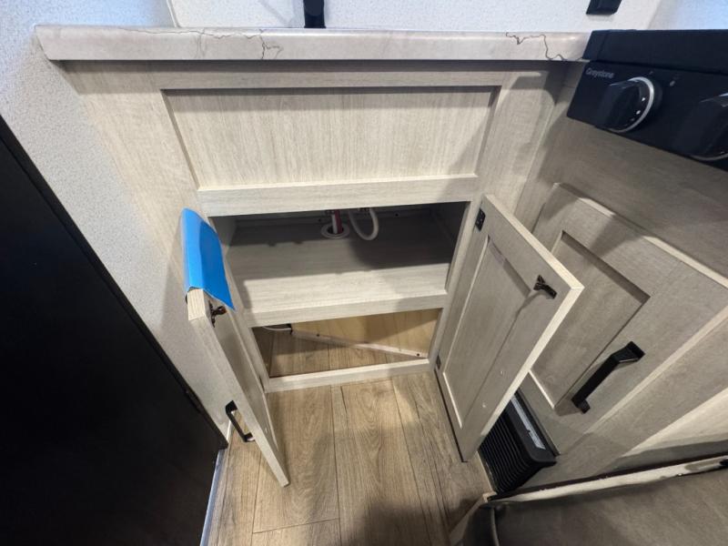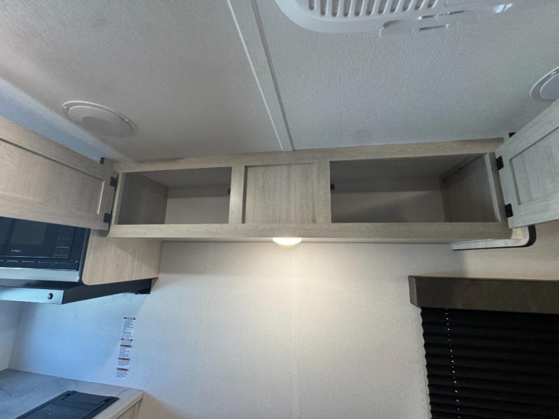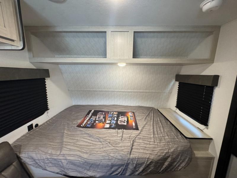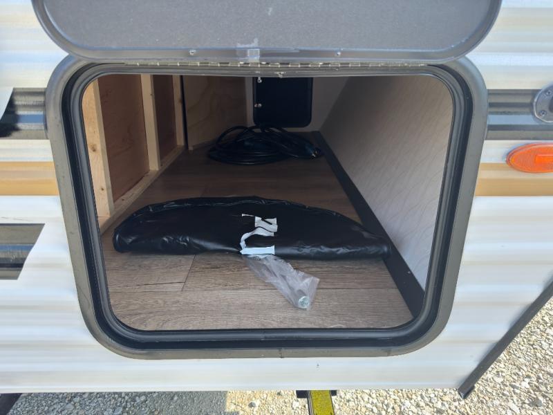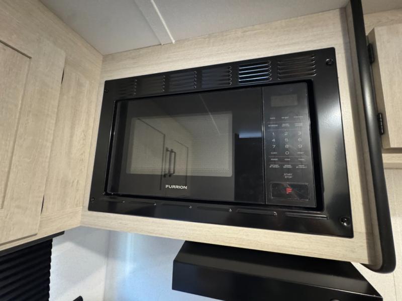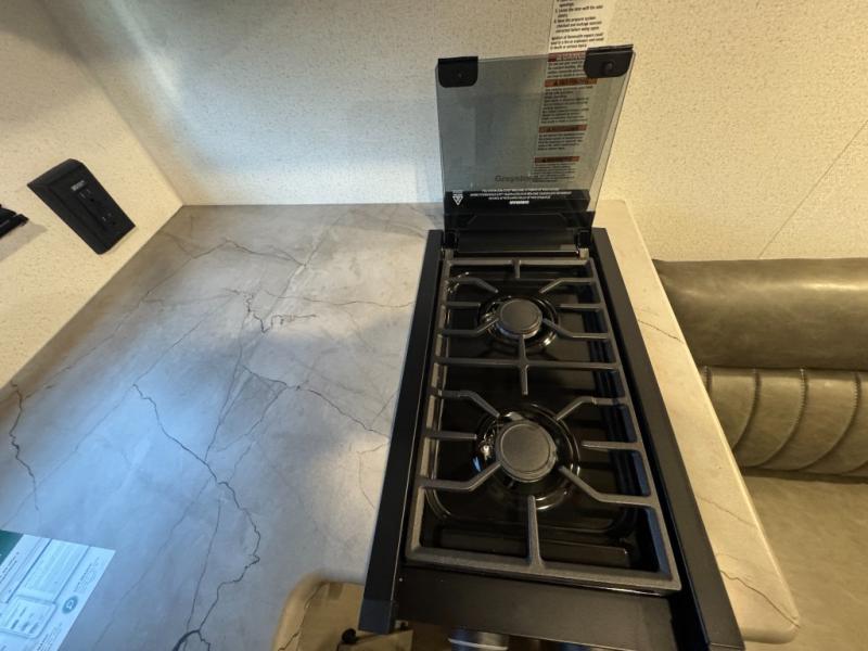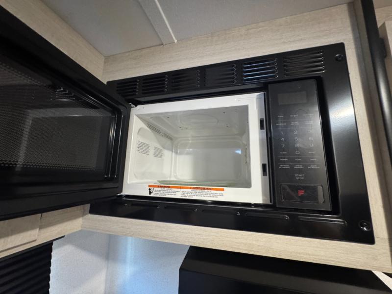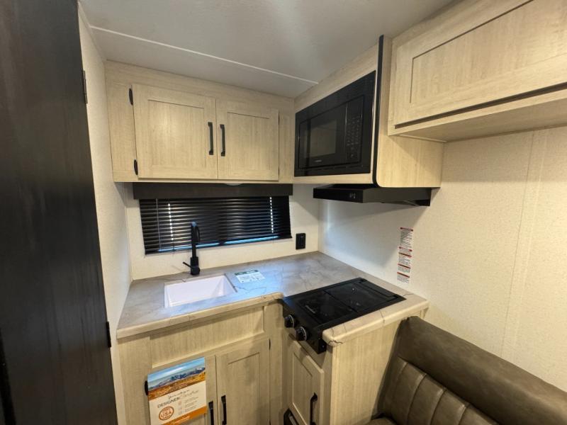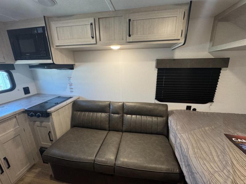 It will be so easy to enjoy camping trips in this single axle travel trailer! There is an RV queen bed up front with flip-up storage at the foot of the bed for your belongings, and any additional guests can sleep on the sofa. A full kitchen includes a stainless two burner cooktop and stainless microwave to cook meals each day, and the 4.3 cu. ft. 12V black glass refrigerator will keep your food fresh. And a private bath with a toilet and shower will let you freshen up without having to use the camp's facilities!