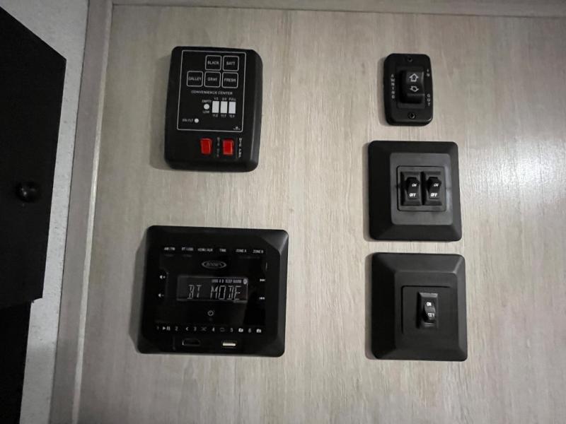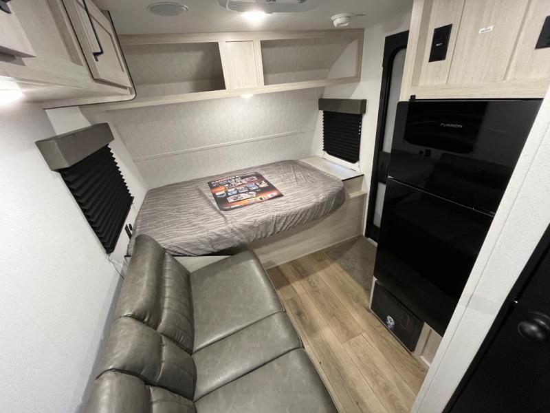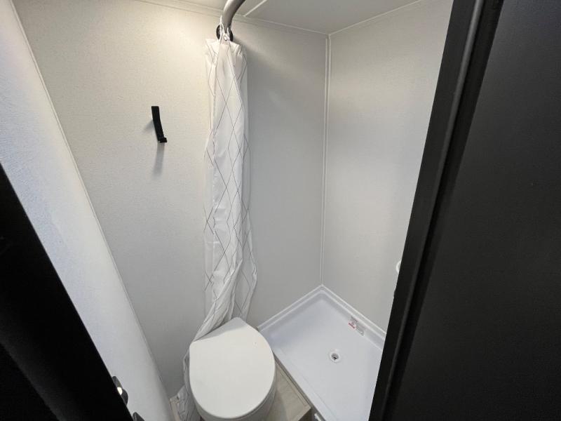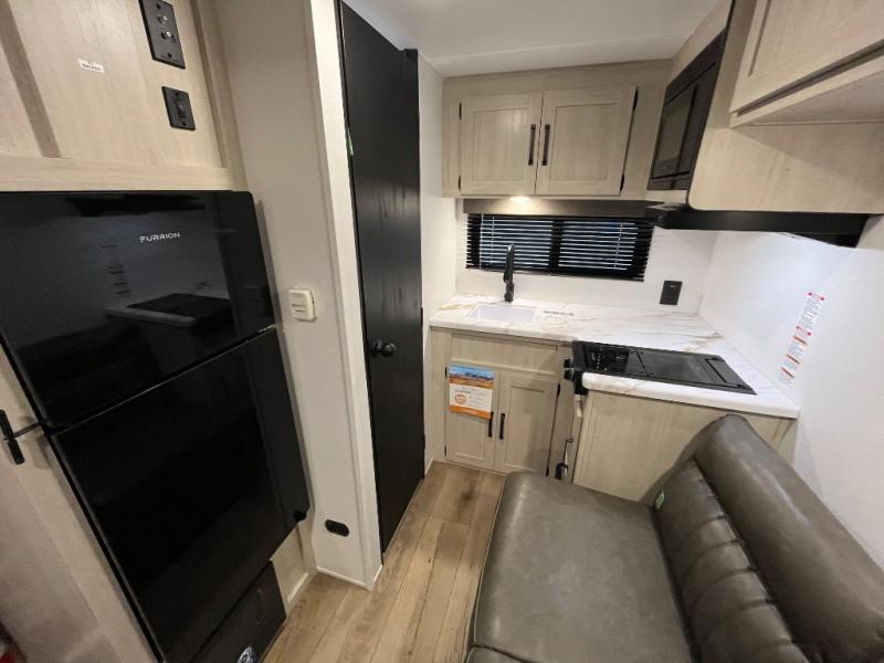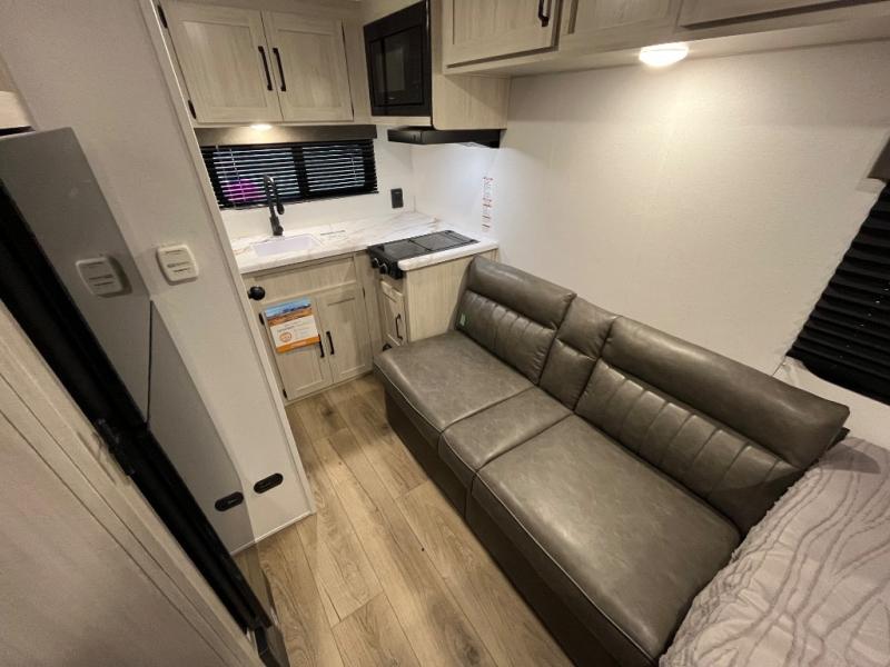 It will be so easy to enjoy camping trips in this single axle travel trailer! There is an RV queen bed up front with flip-up storage at the foot of the bed for your belongings, and any additional guests can sleep on the sofa. A full kitchen includes a stainless two burner cooktop and stainless microwave to cook meals each day, and the 4.3 cu. ft. 12V black glass refrigerator will keep your food fresh. And a private bath with a toilet and shower will let you freshen up without having to use the camp's facilities!