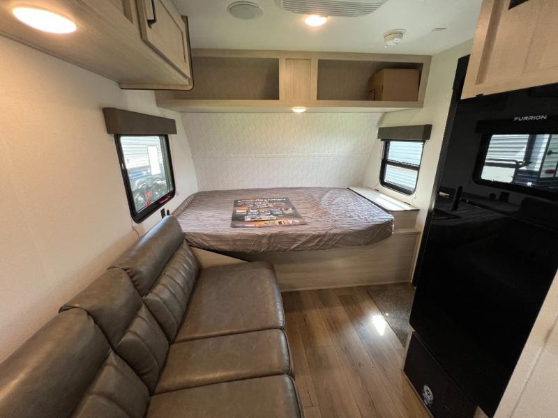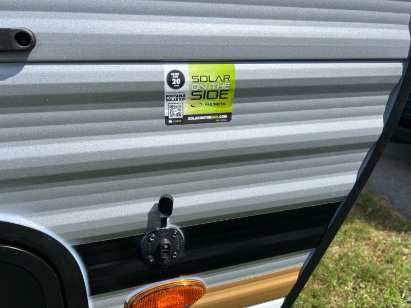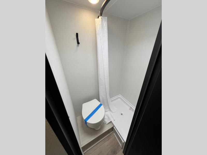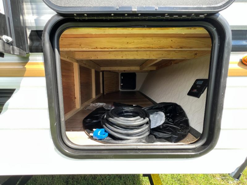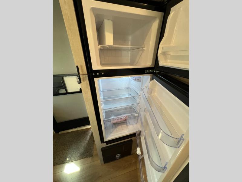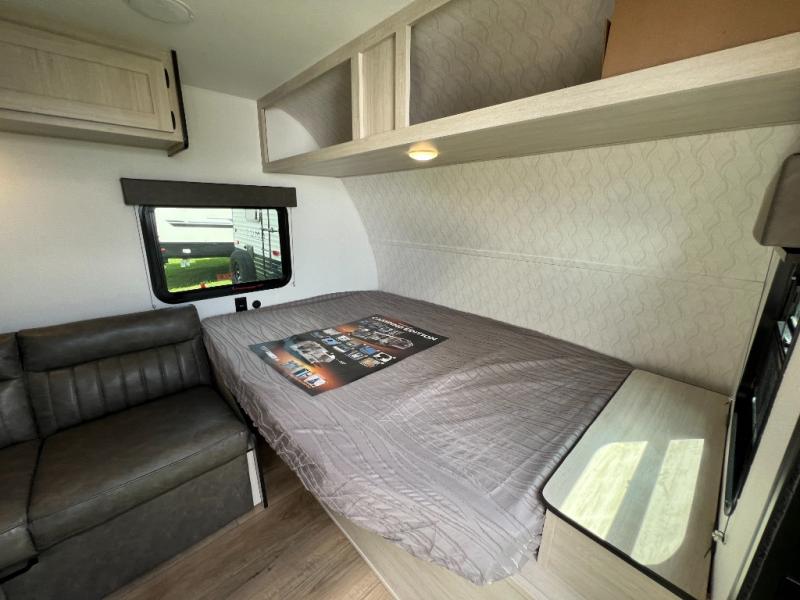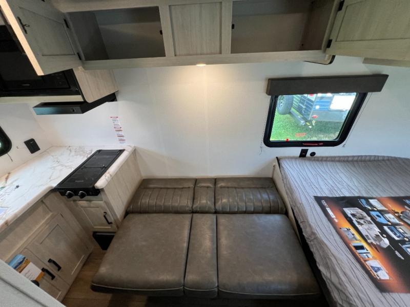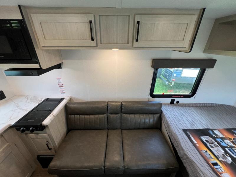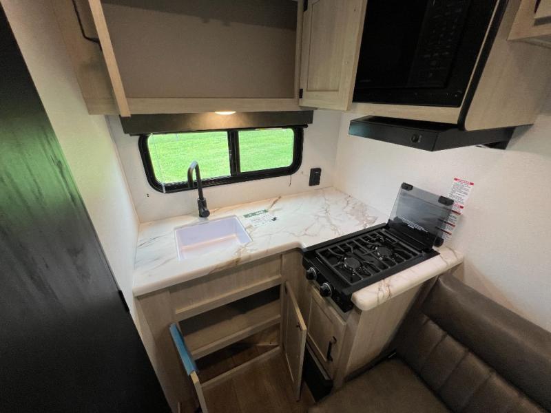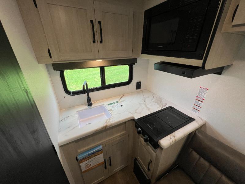 It will be so easy to enjoy camping trips in this single axle travel trailer! There is an RV queen bed up front with flip-up storage at the foot of the bed for your belongings, and any additional guests can sleep on the sofa. A full kitchen includes a stainless two burner cooktop and stainless microwave to cook meals each day, and the 4.3 cu. ft. 12V black glass refrigerator will keep your food fresh. And a private bath with a toilet and shower will let you freshen up without having to use the camp's facilities!