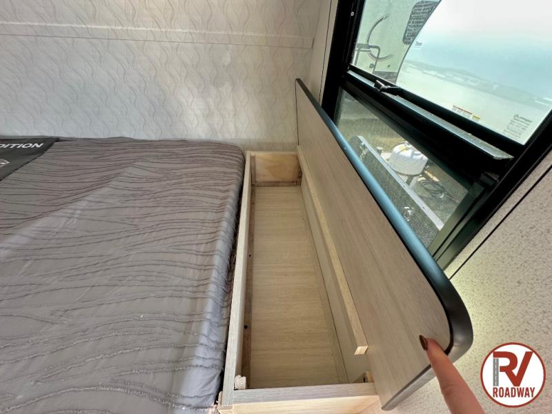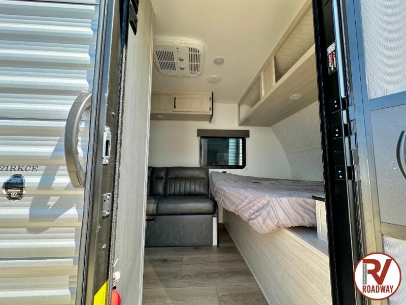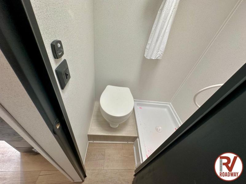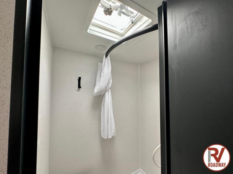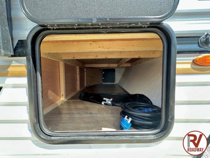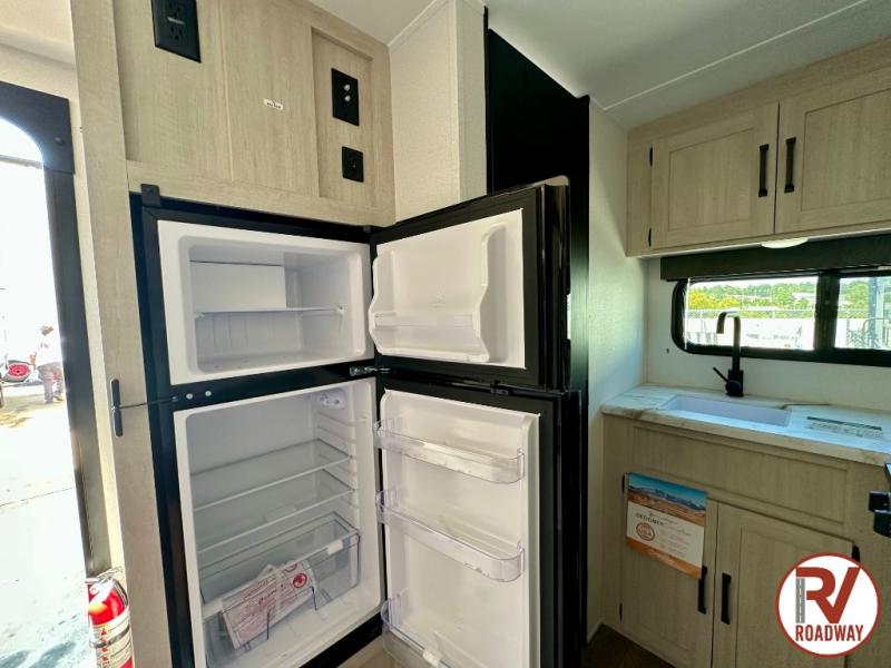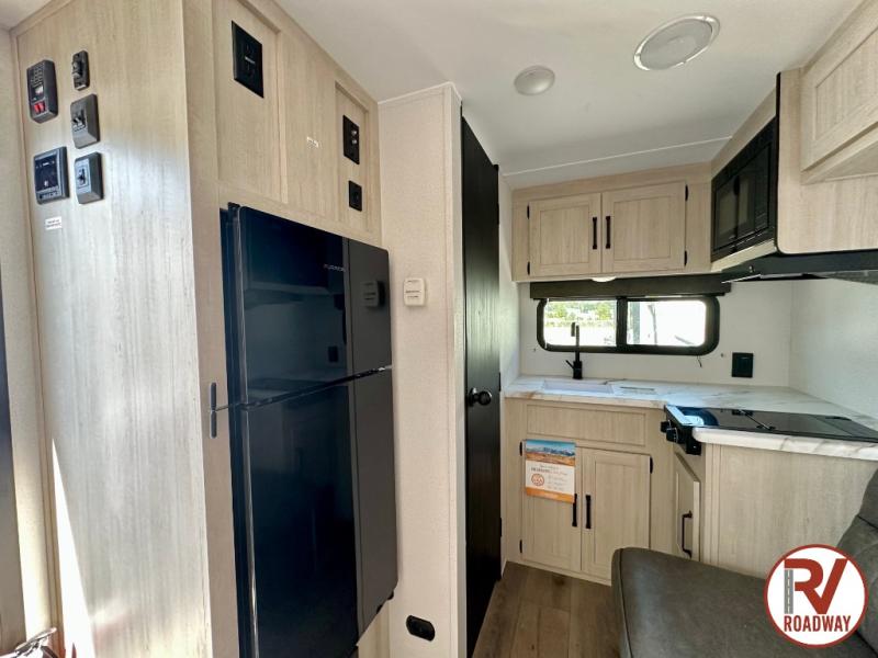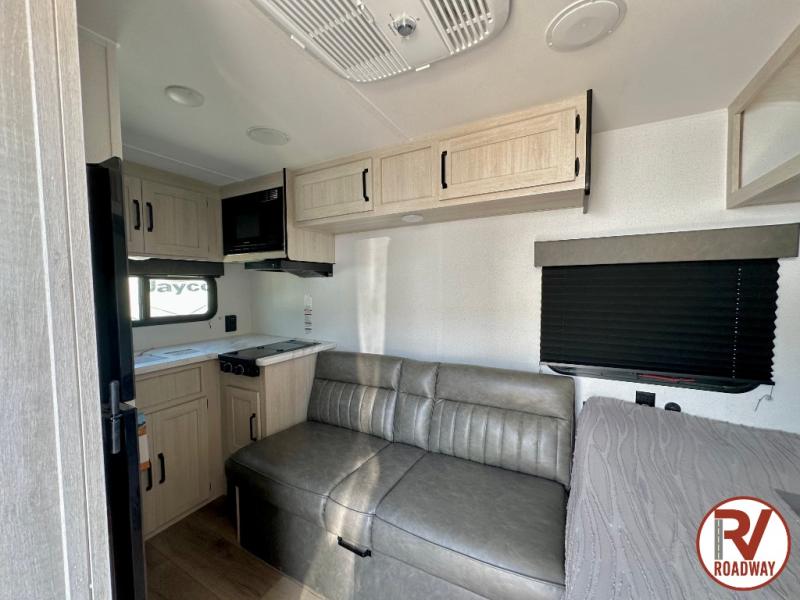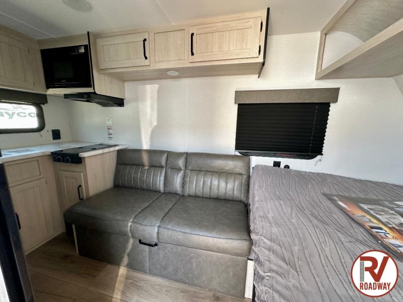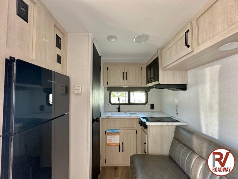 It will be so easy to enjoy camping trips in this single axle travel trailer! There is an RV queen bed up front with flip-up storage at the foot of the bed for your belongings, and any additional guests can sleep on the sofa. A full kitchen includes a stainless two burner cooktop and stainless microwave to cook meals each day, and the 4.3 cu. ft. 12V black glass refrigerator will keep your food fresh. And a private bath with a toilet and shower will let you freshen up without having to use the camp's facilities!