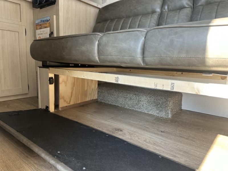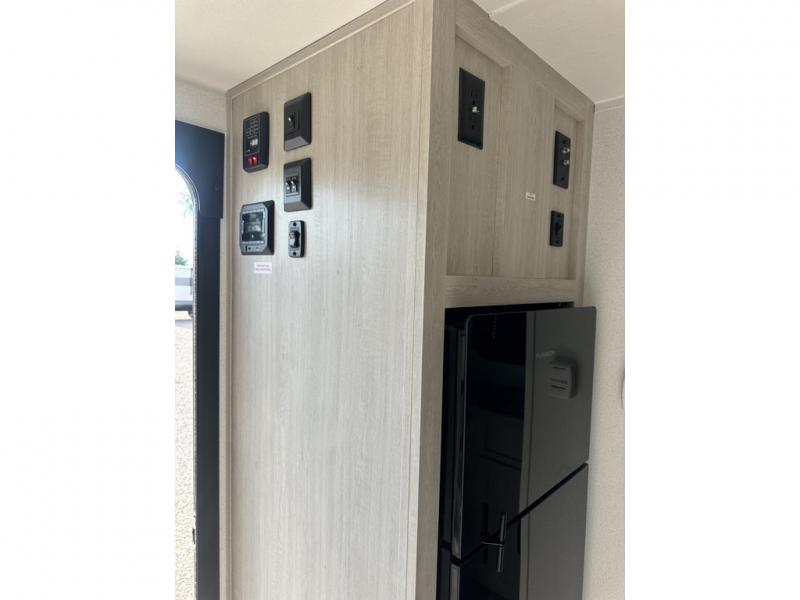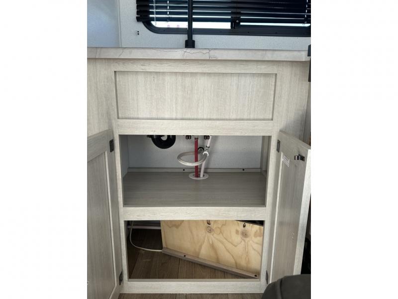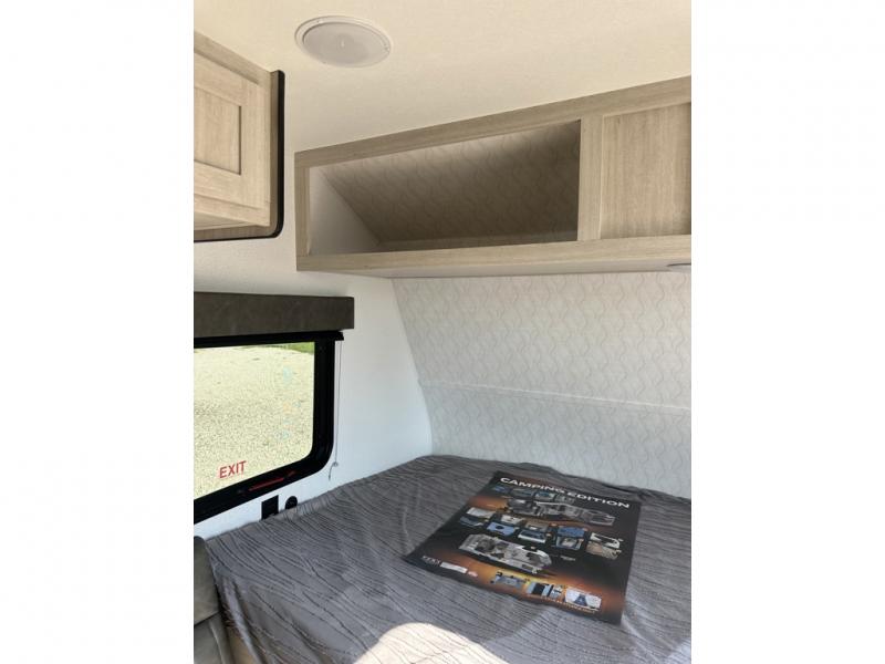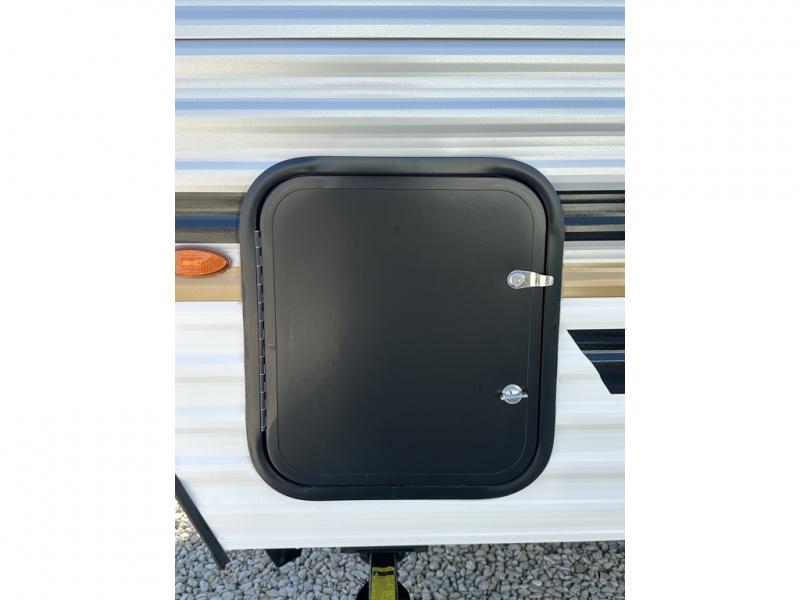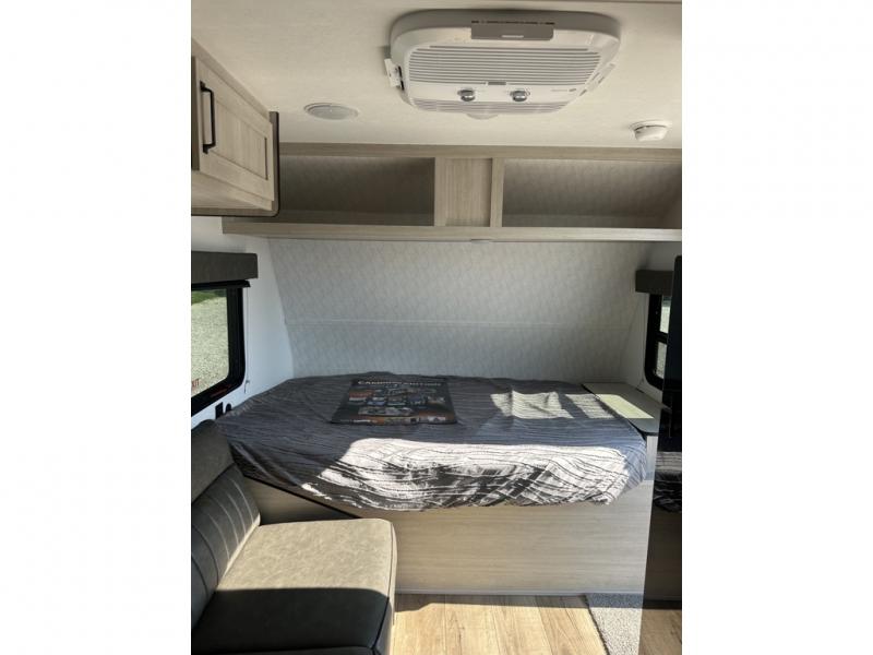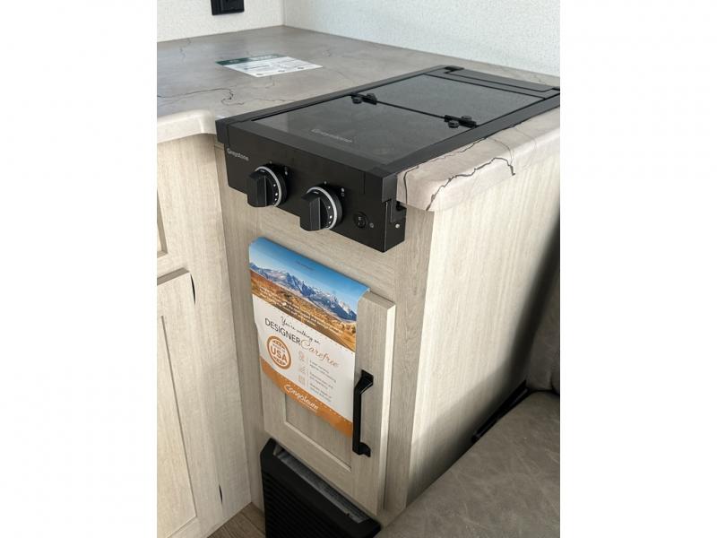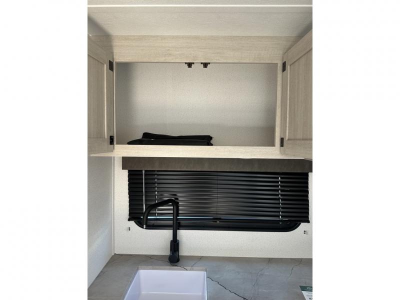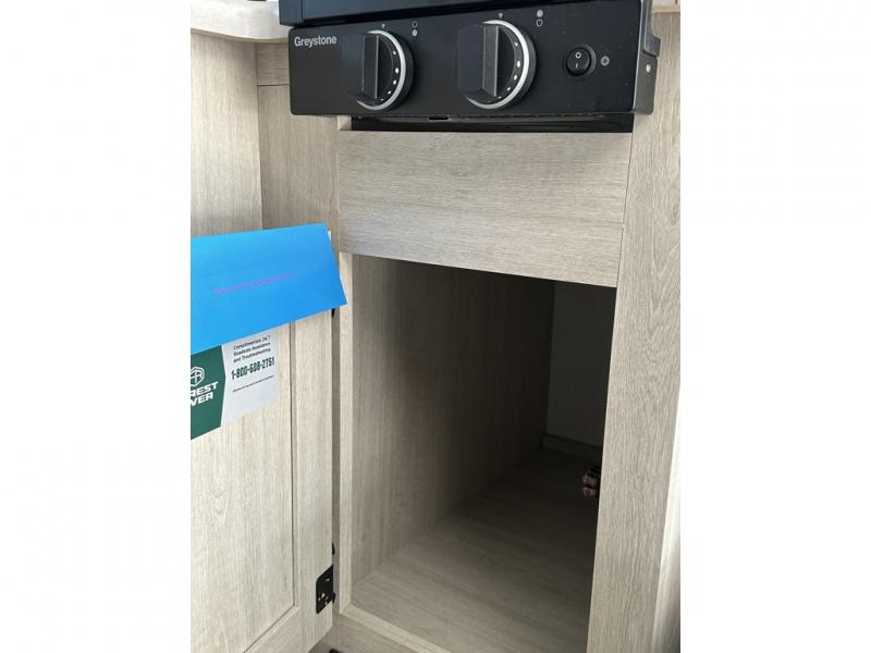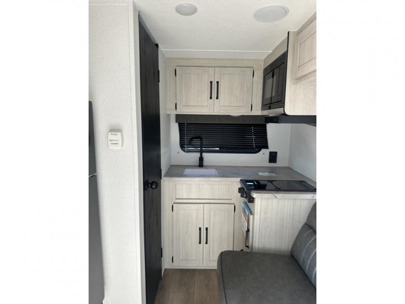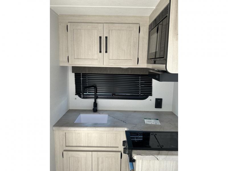 It will be so easy to enjoy camping trips in this single axle travel trailer! There is an RV queen bed up front with flip-up storage at the foot of the bed for your belongings, and any additional guests can sleep on the sofa. A full kitchen includes a two-burner cooktop and microwave to cook meals each day, and the 12V black glass refrigerator will keep your food fresh. And a private bath with a toilet and shower will let you freshen up without having to use the camp's facilities!