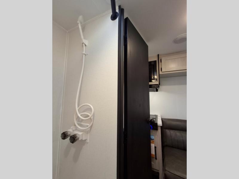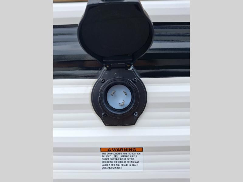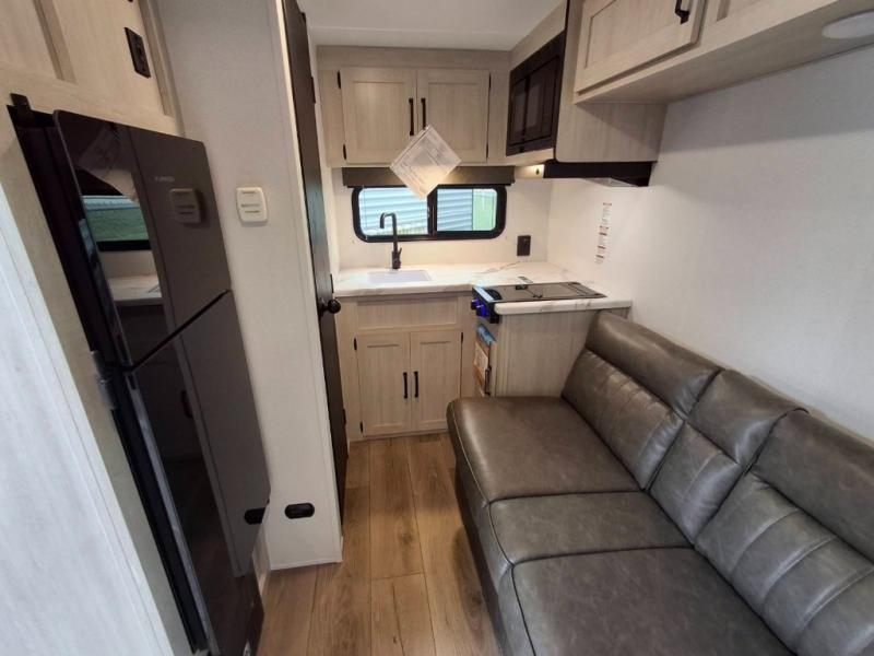 It will be so easy to enjoy camping trips in this single axle travel trailer! There is an RV queen bed up front with flip-up storage at the foot of the bed for your belongings, and any additional guests can sleep on the sofa. A full kitchen includes a two-burner cooktop and microwave to cook meals each day, and the 12V black glass refrigerator will keep your food fresh. And a private bath with a toilet and shower will let you freshen up without having to use the camp's facilities!