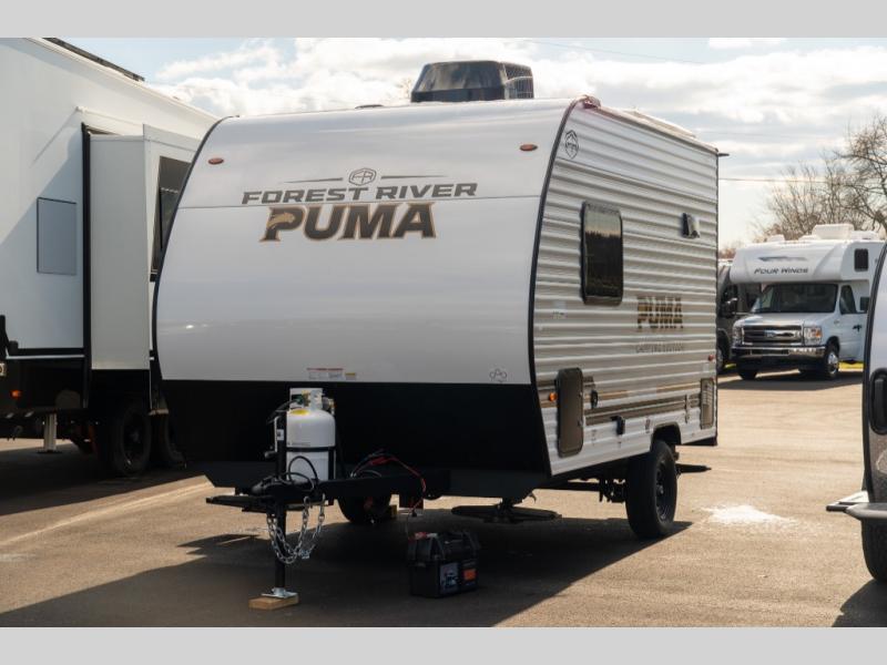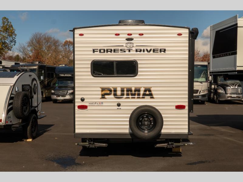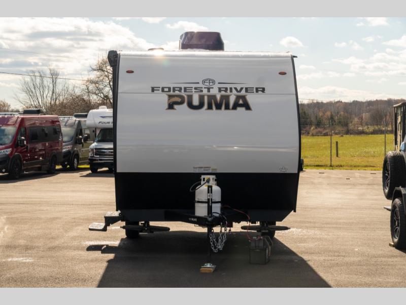 The Puma Camping Edition by Forest River offer an affordable travel trailer for rookie campers or seasoned RVers! They are built with 5/8" tongue and groove plywood flooring and a front diamond plate for added protection. There are also exterior magnetic baggage door latches, back up camera prep, a battery disconnect. Head inside to find Thermofoil countertops with a smooth drop edge, bedroom USB ports and outlets, and pleated shades in the living room.