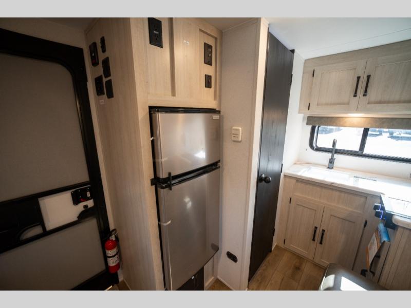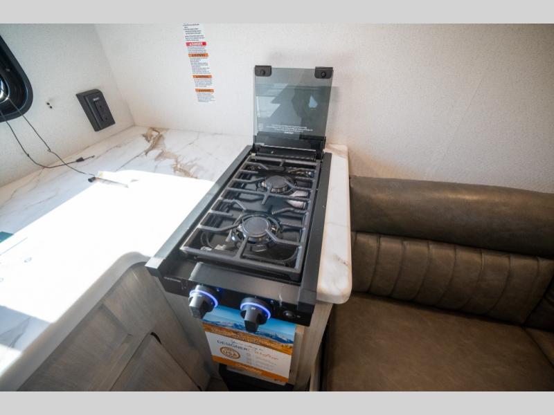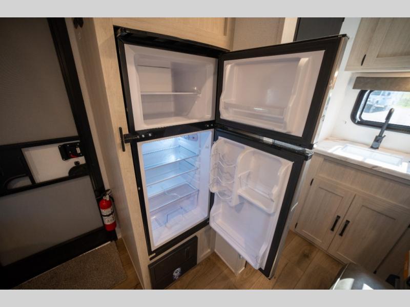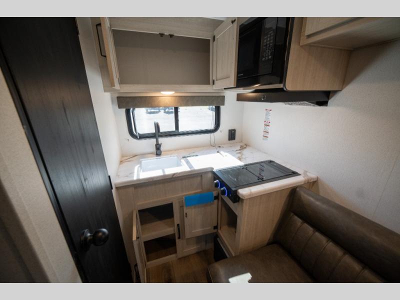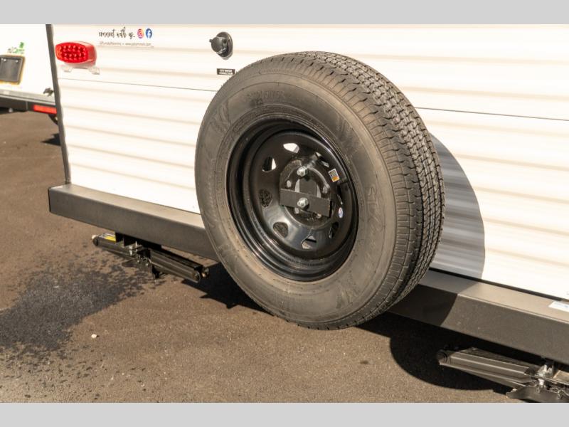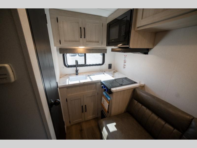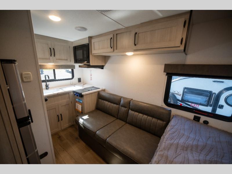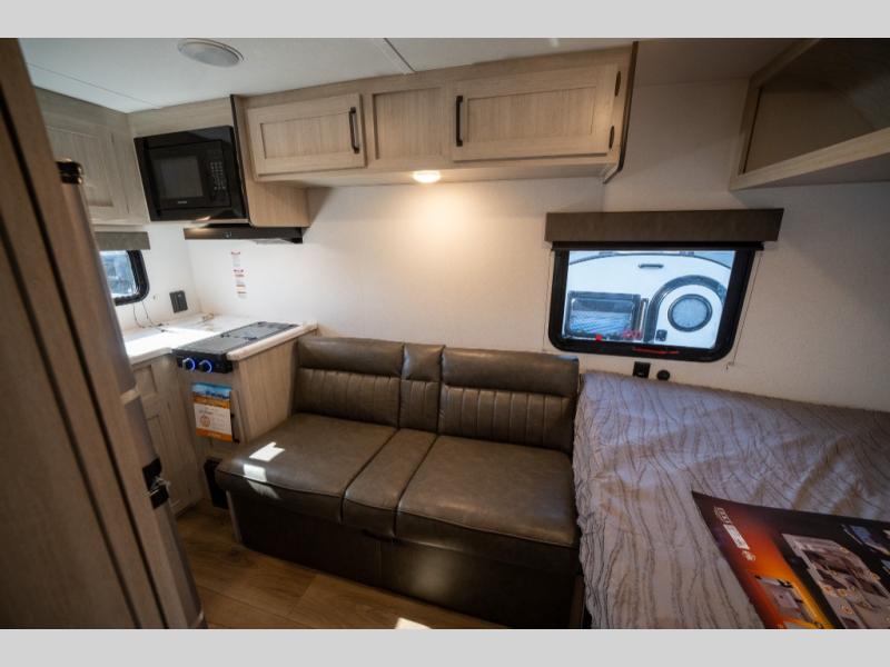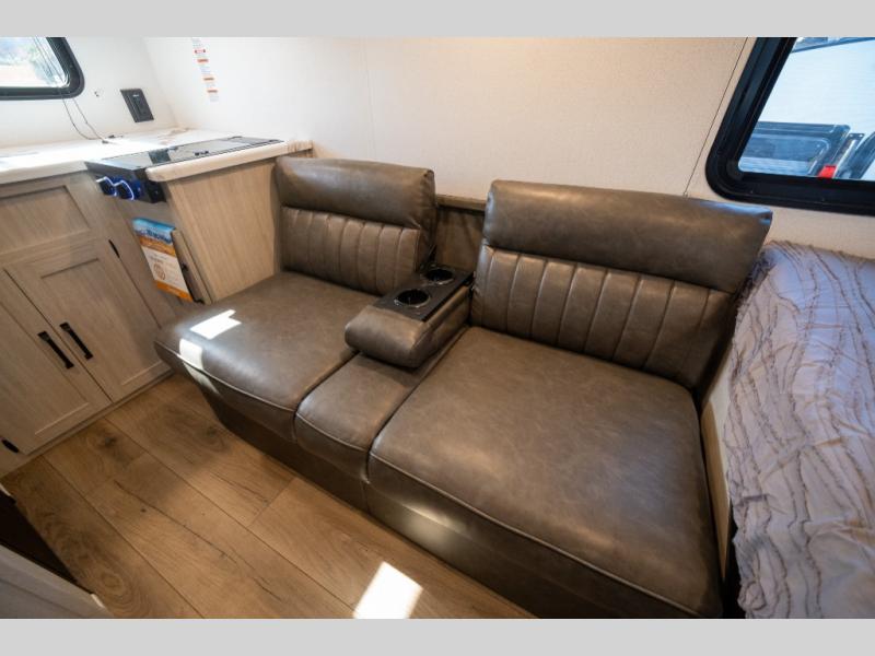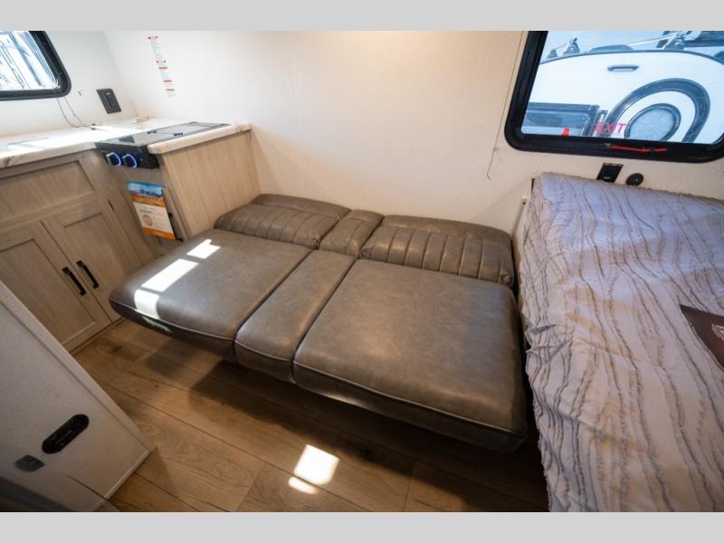It will be so easy to enjoy camping trips in this single axle travel trailer! There is an RV queen bed up front with flip-up storage at the foot of the bed for your belongings, and any additional guests can sleep on the sofa. A full kitchen includes a two-burner cooktop and microwave to cook meals each day, and the 12V black glass refrigerator will keep your food fresh. And a private bath with a toilet and shower will let you freshen up without having to use the camp's facilities!