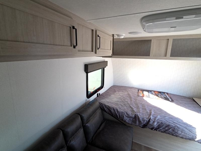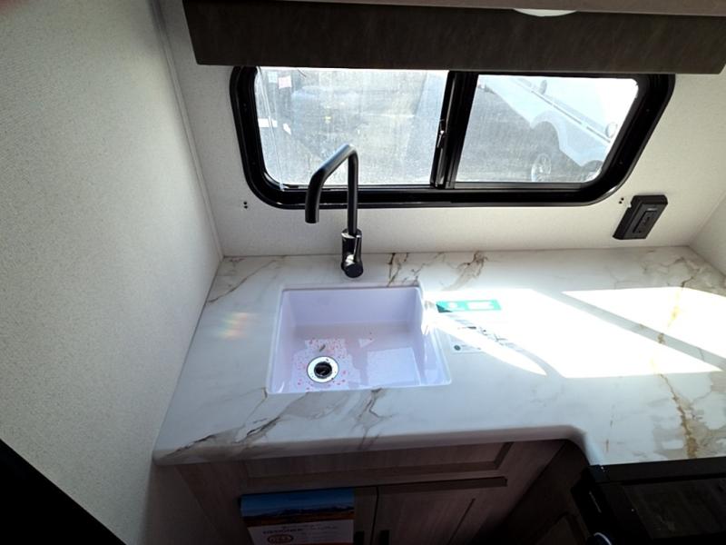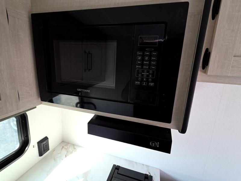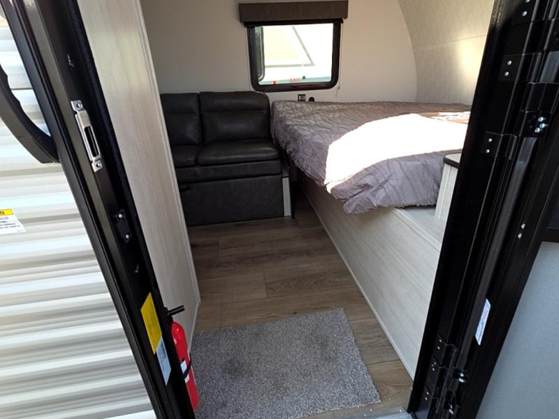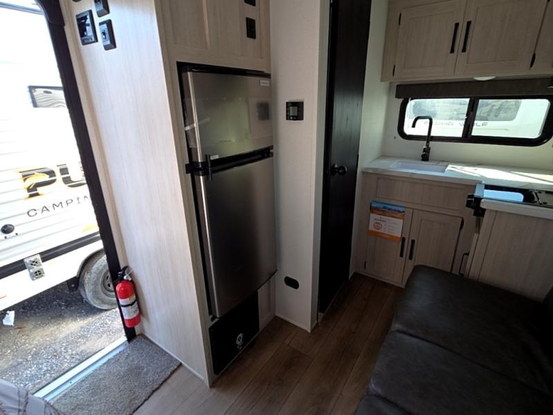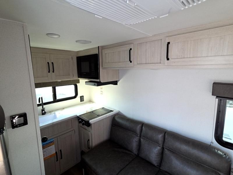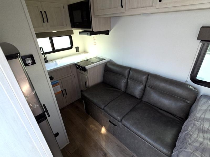 It will be so easy to enjoy camping trips in this single axle travel trailer! There is an RV queen bed up front with flip-up storage at the foot of the bed for your belongings, and any additional guests can sleep on the sofa. A full kitchen includes a two-burner cooktop and microwave to cook meals each day, and the 12V black glass refrigerator will keep your food fresh. And a private bath with a toilet and shower will let you freshen up without having to use the camp's facilities!