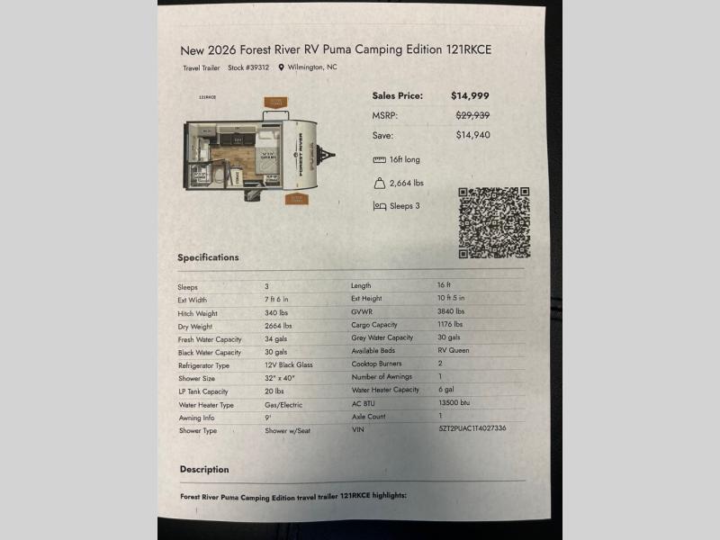 Forest River Puma Camping Edition travel trailer 121RKCE highlights: