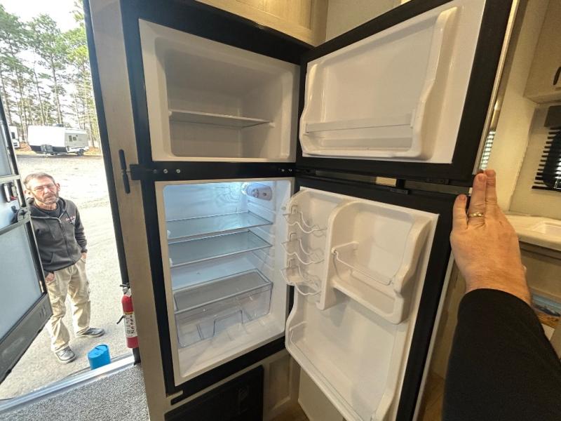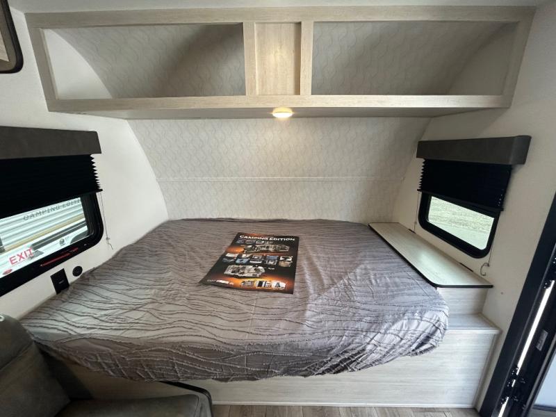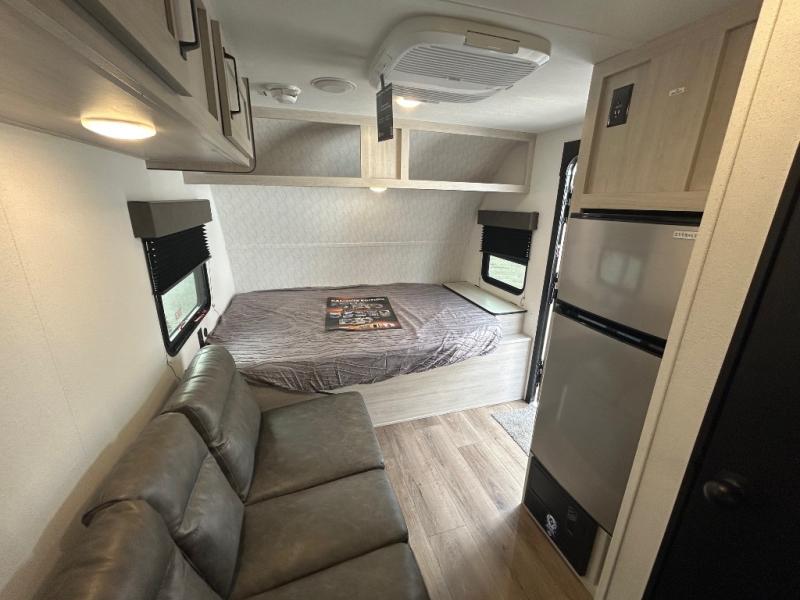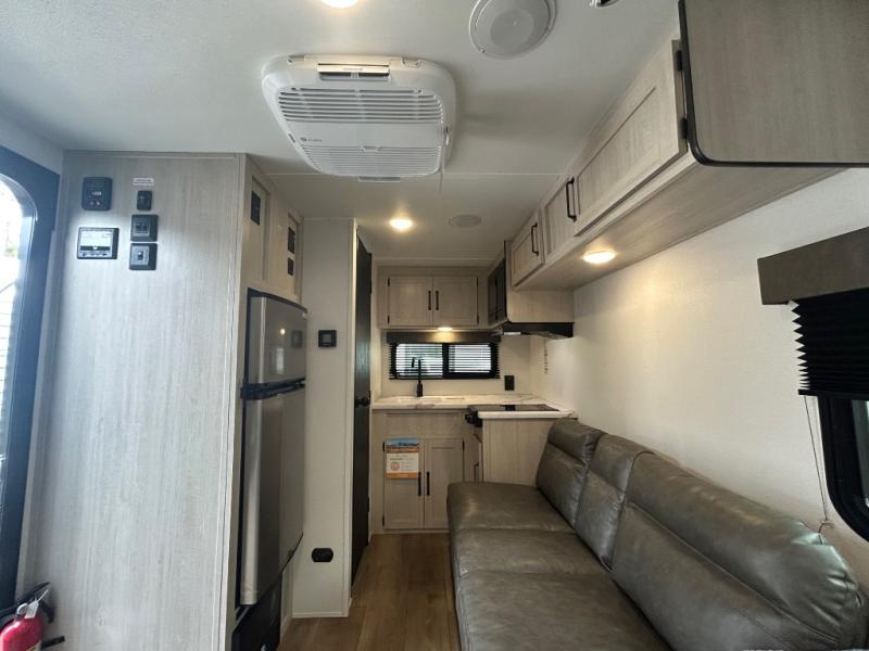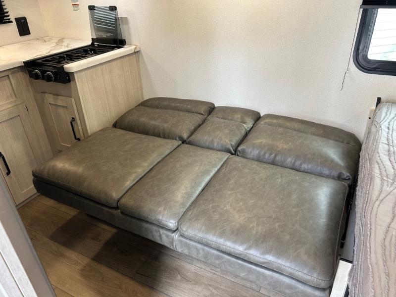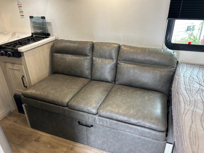It will be so easy to enjoy camping trips in this single axle travel trailer! There is an RV queen bed up front with flip-up storage at the foot of the bed for your belongings, and any additional guests can sleep on the sofa. A full kitchen includes a two-burner cooktop and microwave to cook meals each day, and the 12V black glass refrigerator will keep your food fresh. And a private bath with a toilet and shower will let you freshen up without having to use the camp's facilities!