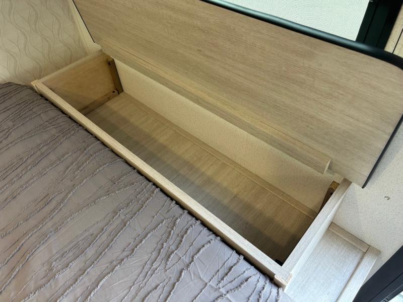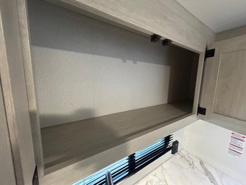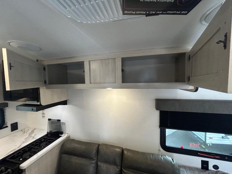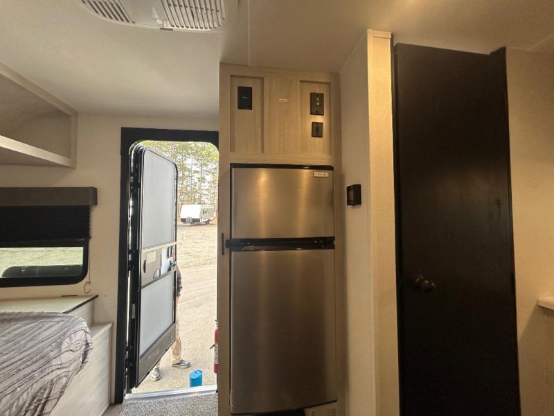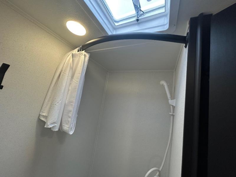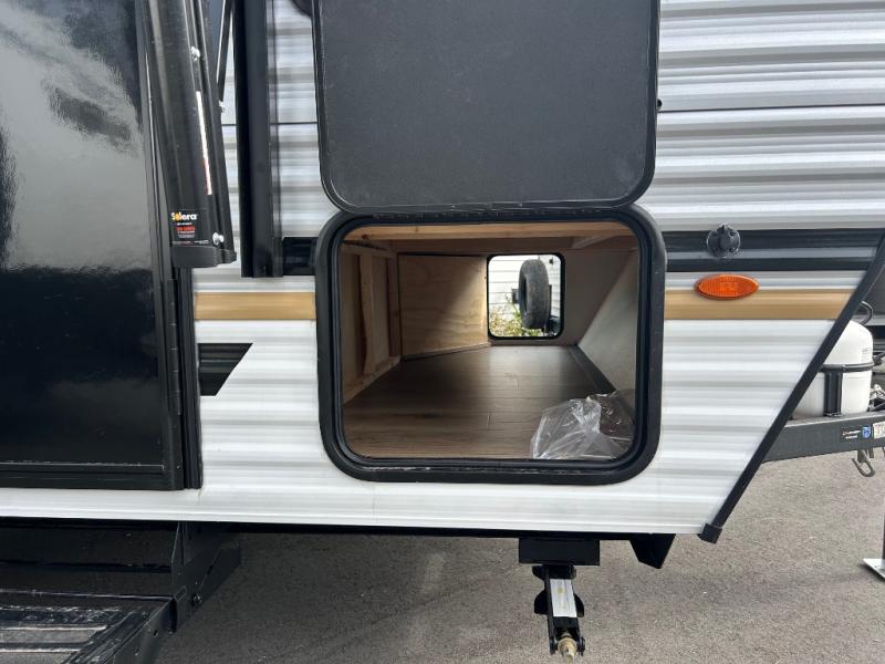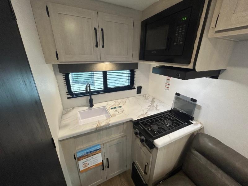 It will be so easy to enjoy camping trips in this single axle travel trailer! There is an RV queen bed up front with flip-up storage at the foot of the bed for your belongings, and any additional guests can sleep on the sofa. A full kitchen includes a two-burner cooktop and microwave to cook meals each day, and the 12V black glass refrigerator will keep your food fresh. And a private bath with a toilet and shower will let you freshen up without having to use the camp's facilities!