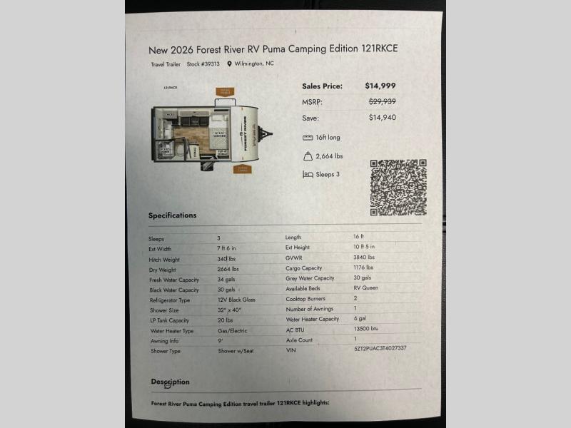 Forest River Puma Camping Edition travel trailer 121RKCE highlights: