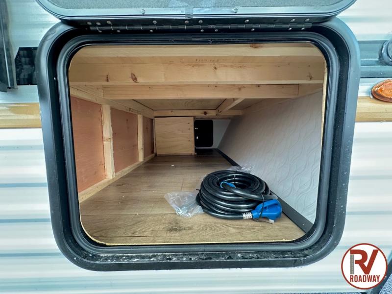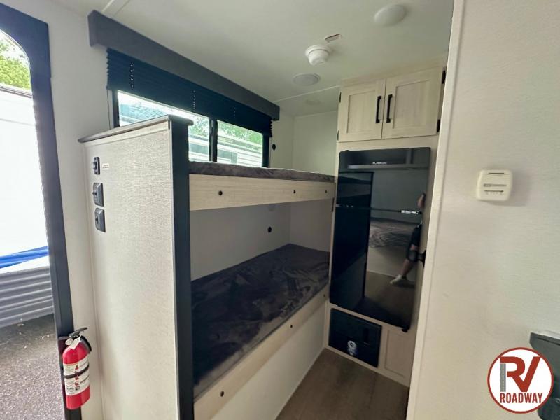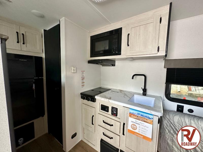 It will be so easy to enjoy camping trips in this single axle travel trailer! There is a front RV queen bed with flip-up storage at the foot of the bed for your belongings, and any additional guests can sleep on the 29" x 70" bunk beds. A full kitchen includes a stainless two burner cooktop and stainless microwave to cook meals each day, and the 4.3 cu. ft. 12V black glass refrigerator will keep your food fresh. And a private bath with a toilet and shower will let you freshen up without having to use the camp's facilities!