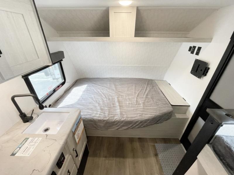 It will be so easy to enjoy camping trips in this single axle travel trailer! There is a front RV queen bed with flip-up storage at the foot of the bed for your belongings, and any additional guests can sleep on the 29" x 70" bunk beds. A full kitchen includes a stainless two burner cooktop and stainless microwave to cook meals each day, and the 4.3 cu. ft. 12V black glass refrigerator will keep your food fresh. And a private bath with a toilet and shower will let you freshen up without having to use the camp's facilities!
