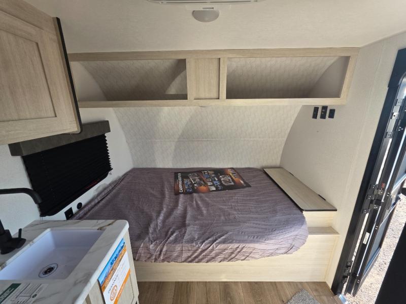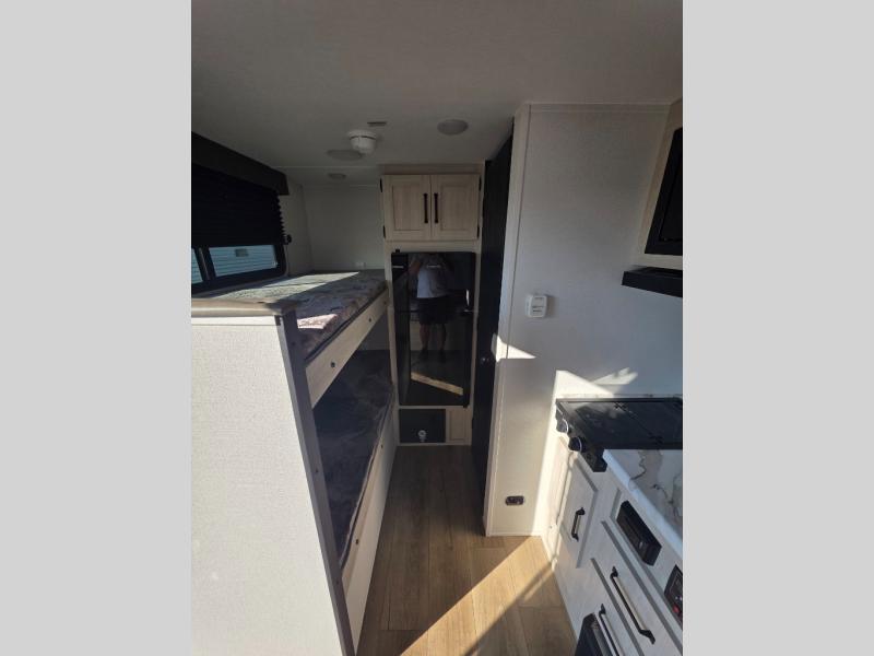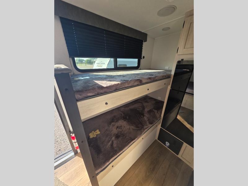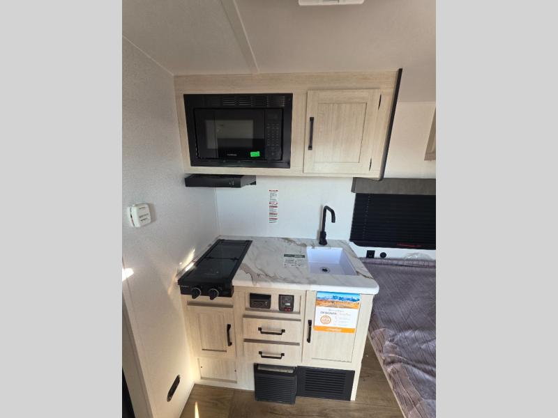 It will be so easy to enjoy camping trips in this single axle travel trailer! There is a front RV queen bed with flip-up storage at the foot of the bed for your belongings, and any additional guests can sleep on the 29" x 70" bunk beds. A full kitchen includes a stainless two burner cooktop and stainless microwave to cook meals each day, and the 4.3 cu. ft. 12V black glass refrigerator will keep your food fresh. And a private bath with a toilet and shower will let you freshen up without having to use the camp's facilities!