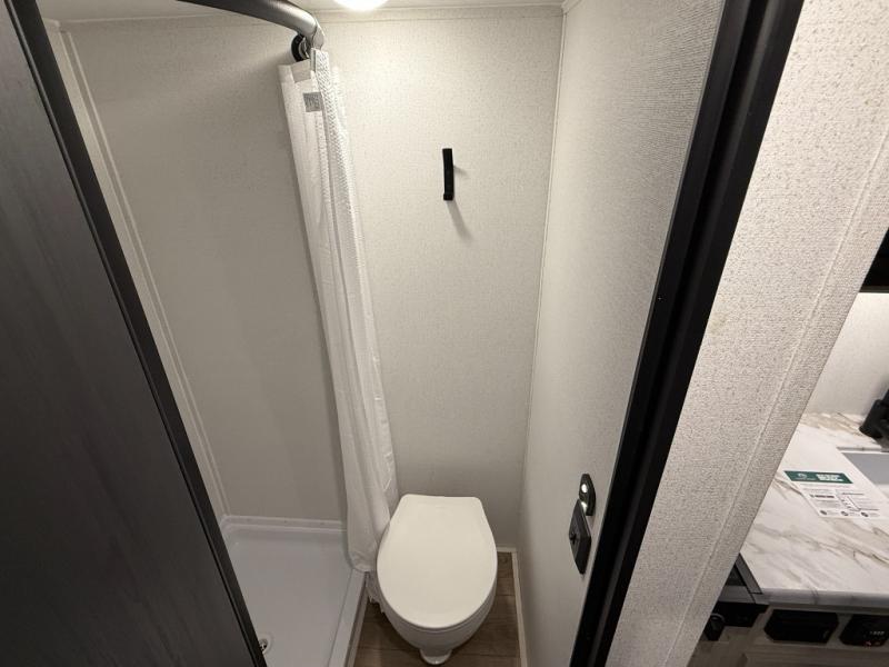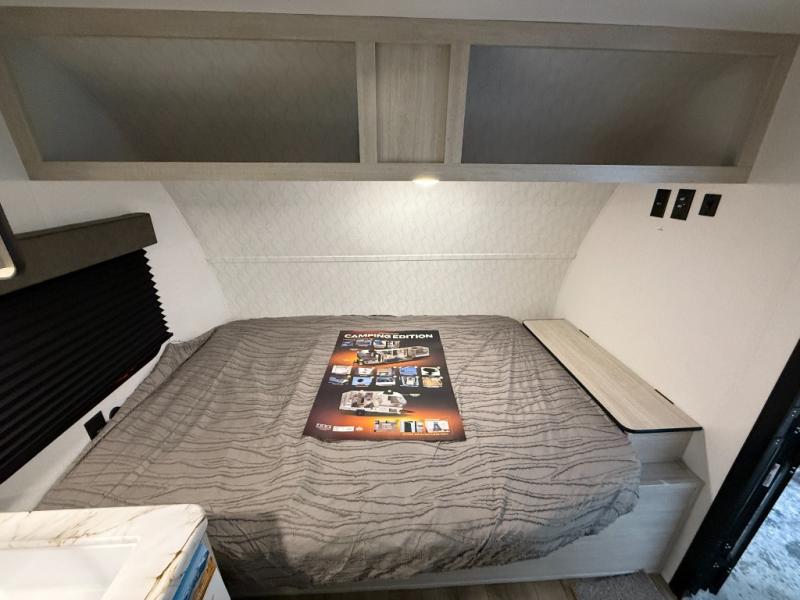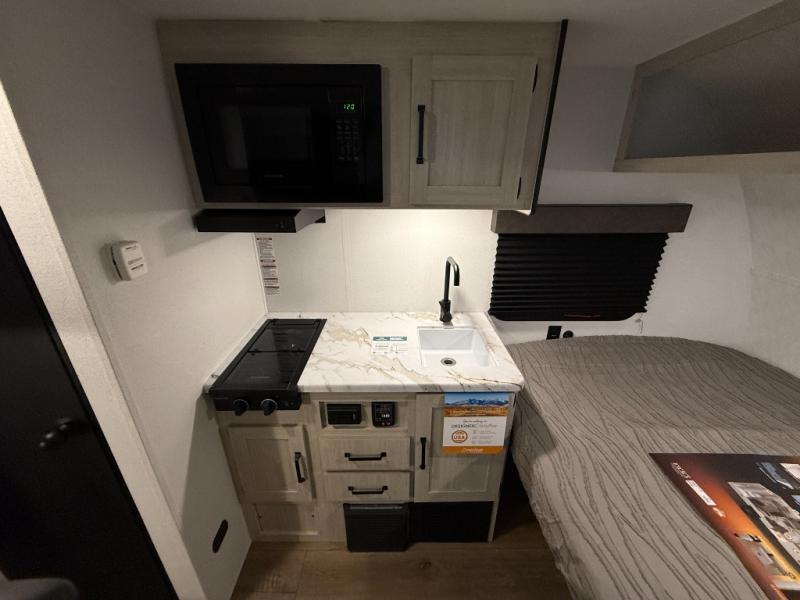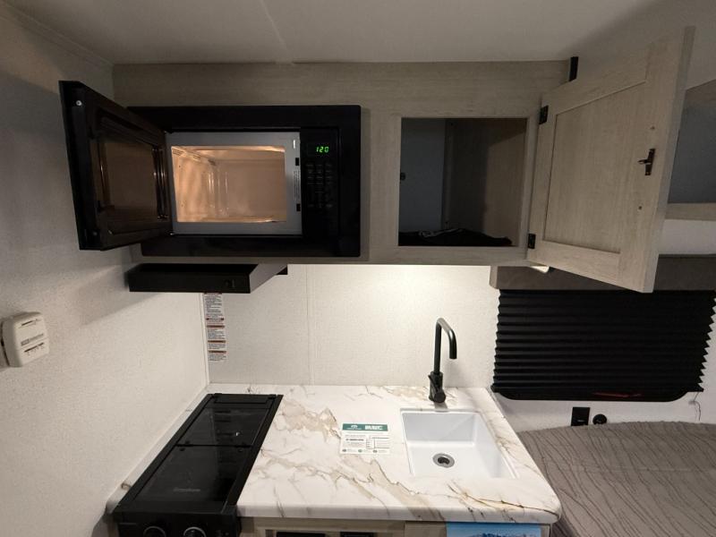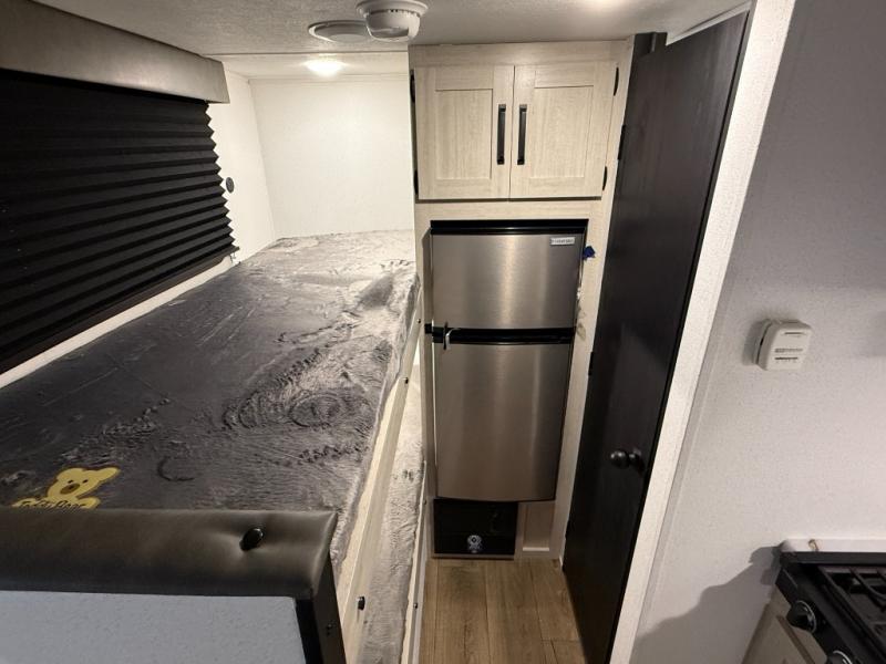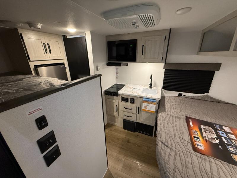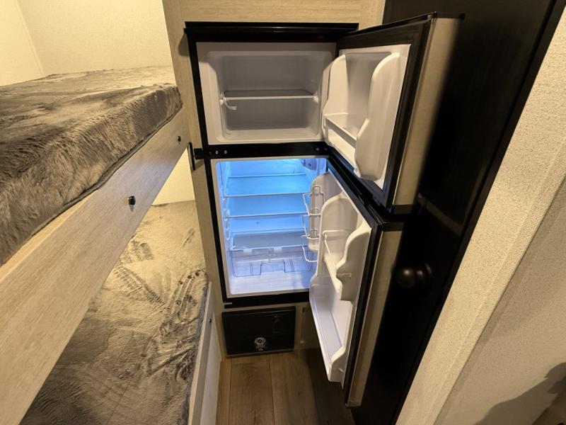 It will be so easy to enjoy camping trips in this single axle travel trailer! There is a front RV queen bed with flip-up storage at the foot of the bed for your belongings, and any additional guests can sleep on the 28" x 69" bunk beds. A full kitchen includes a two-burner cooktop and microwave to cook meals each day, and the 12V black glass refrigerator will keep your food fresh. And a private bath with a toilet and shower will let you freshen up without having to use the camp's facilities!