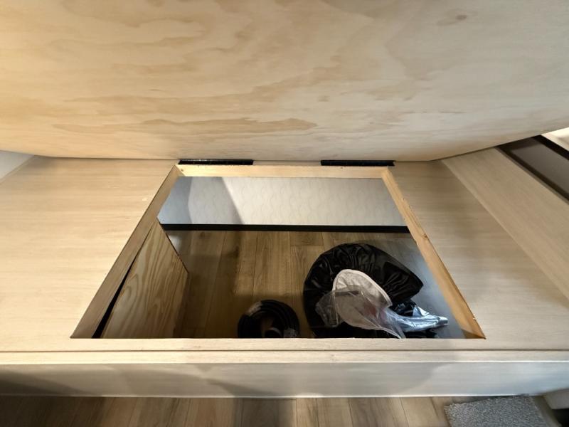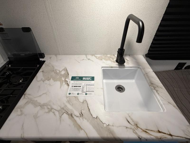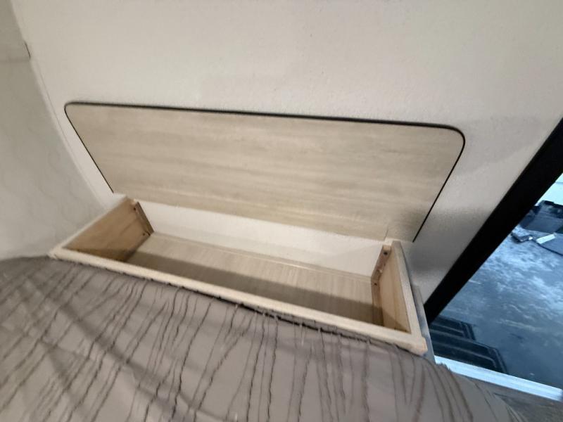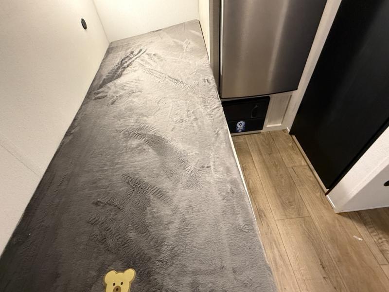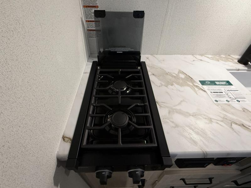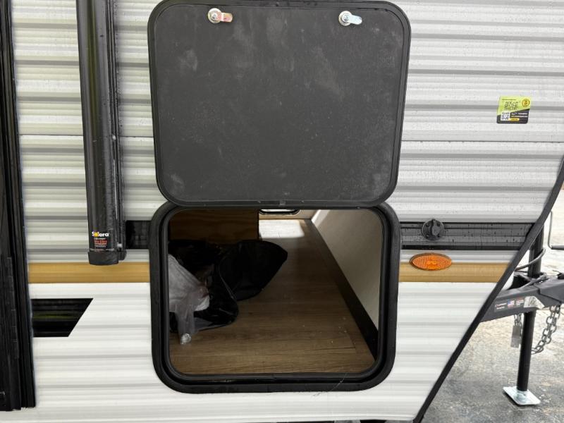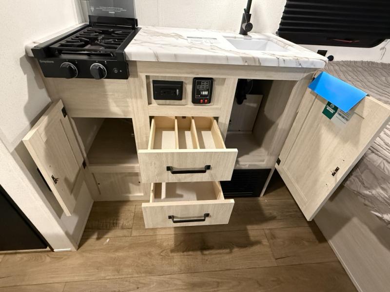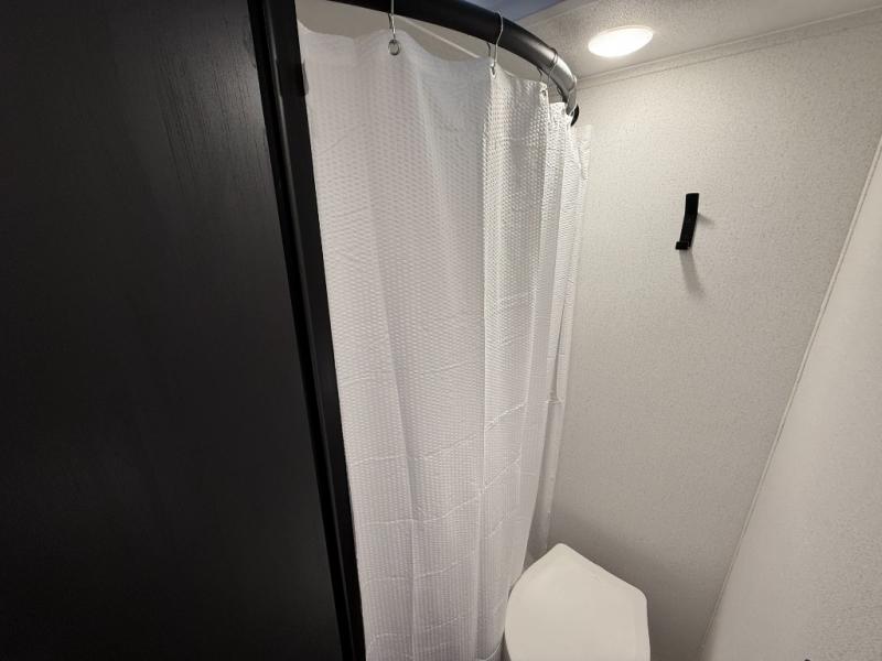 It will be so easy to enjoy camping trips in this single axle travel trailer! There is a front RV queen bed with flip-up storage at the foot of the bed for your belongings, and any additional guests can sleep on the 28" x 69" bunk beds. A full kitchen includes a two-burner cooktop and microwave to cook meals each day, and the 12V black glass refrigerator will keep your food fresh. And a private bath with a toilet and shower will let you freshen up without having to use the camp's facilities!