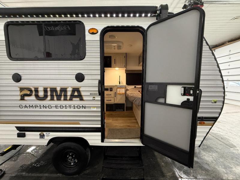 The Puma Camping Edition by Forest River offer an affordable travel trailer for rookie campers or seasoned RVers! They are built with 5/8" tongue and groove plywood flooring and a front diamond plate for added protection. There are also exterior magnetic baggage door latches, back up camera prep, a battery disconnect. Head inside to find Thermofoil countertops with a smooth drop edge, bedroom USB ports and outlets, and pleated shades in the living room.