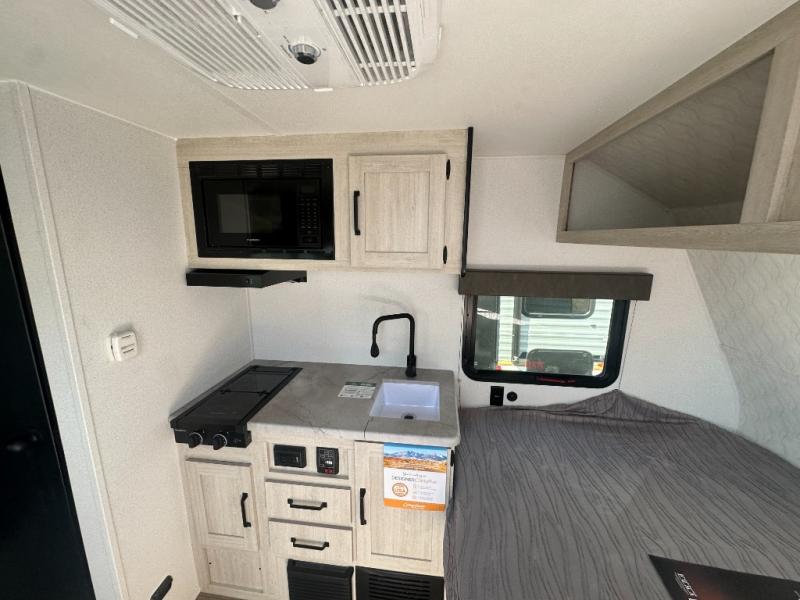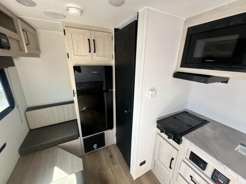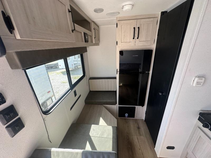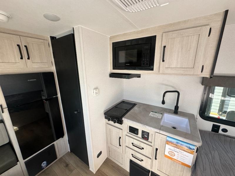 It will be so easy to enjoy camping trips in this single axle travel trailer! There is a front RV queen bed with flip-up storage at the foot of the bed for your belongings, and any additional guests can sleep on the booth dinette with an open shelf above. A full kitchen includes a stainless two burner cooktop and stainless microwave to cook meals each day, and the 4.3 cu. ft. 12V black glass refrigerator will keep your food fresh. And a private bath includes a 24" x 32" shower to clean off after a day outdoors!