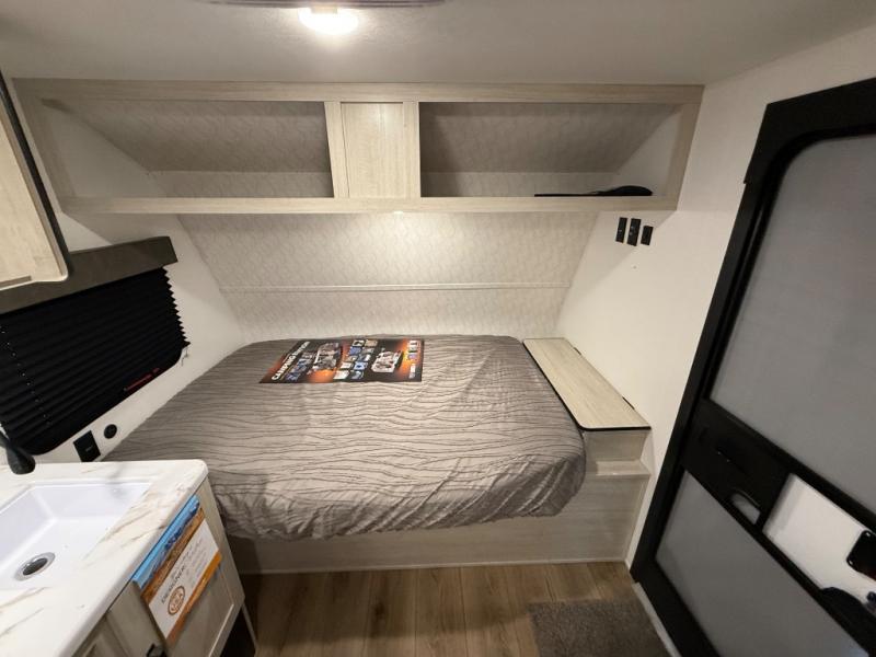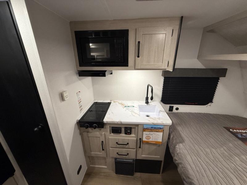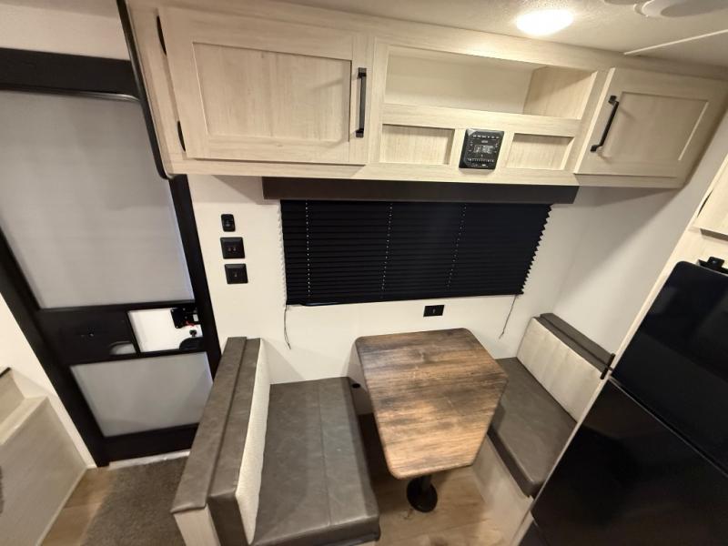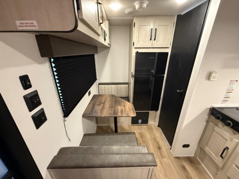 It will be so easy to enjoy camping trips in this single axle travel trailer! There is a front RV queen bed with flip-up storage at the foot of the bed for your belongings, and any additional guests can sleep on the booth dinette with an open shelf above. A full kitchen includes a stainless two burner cooktop and stainless microwave to cook meals each day, and the 4.3 cu. ft. 12V black glass refrigerator will keep your food fresh. And a private bath includes a 24" x 32" shower to clean off after a day outdoors!