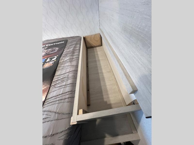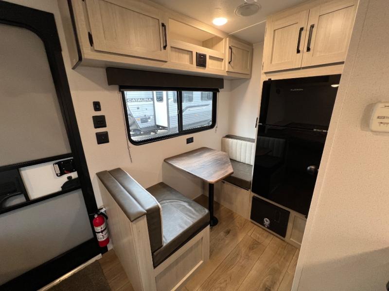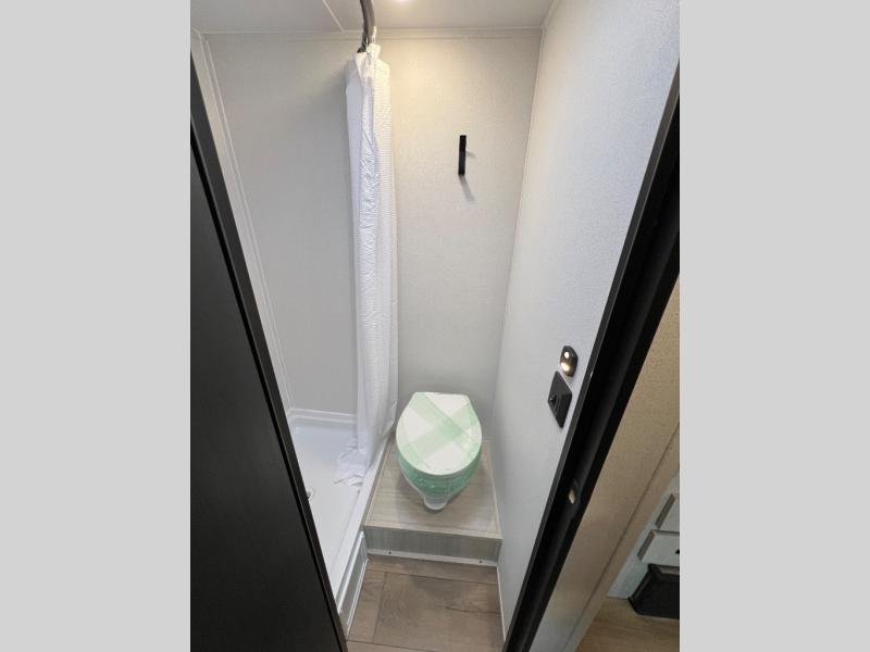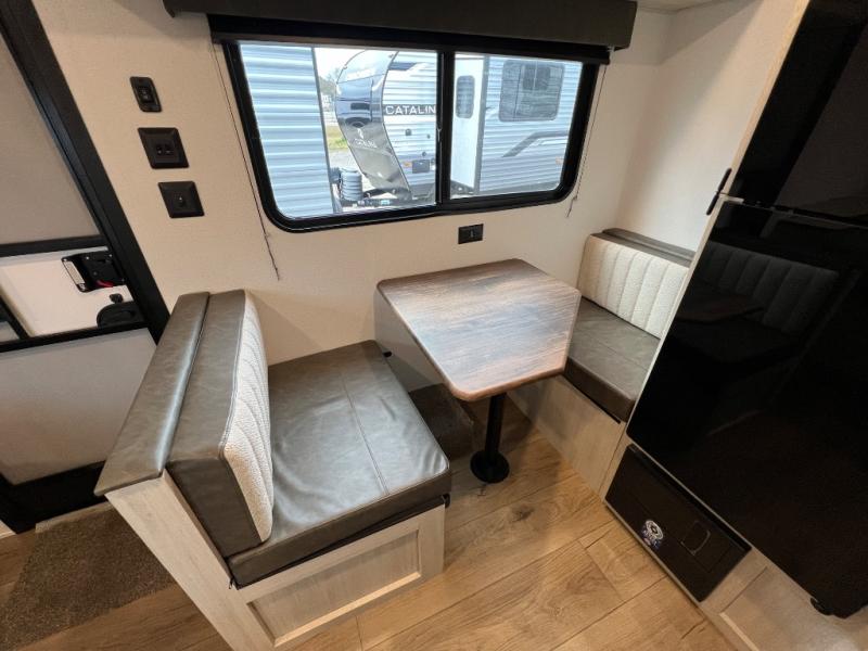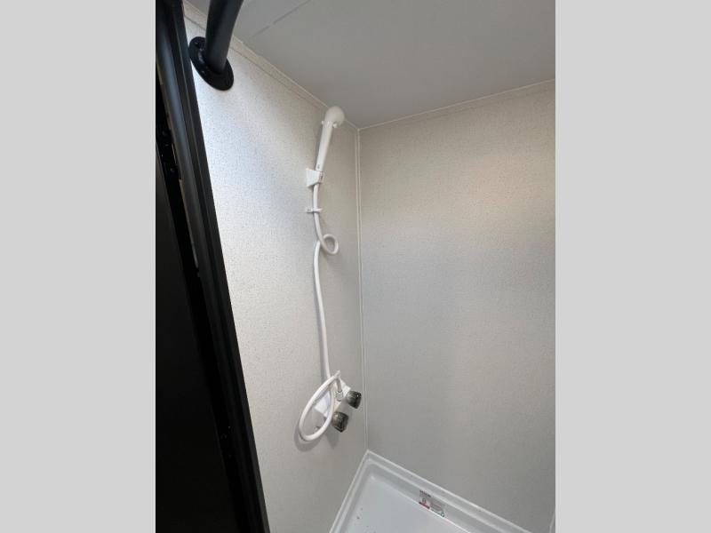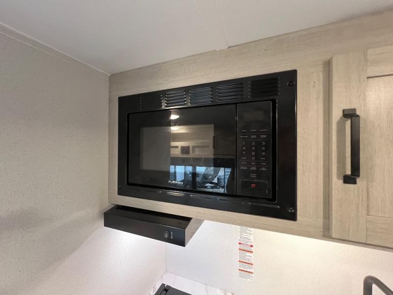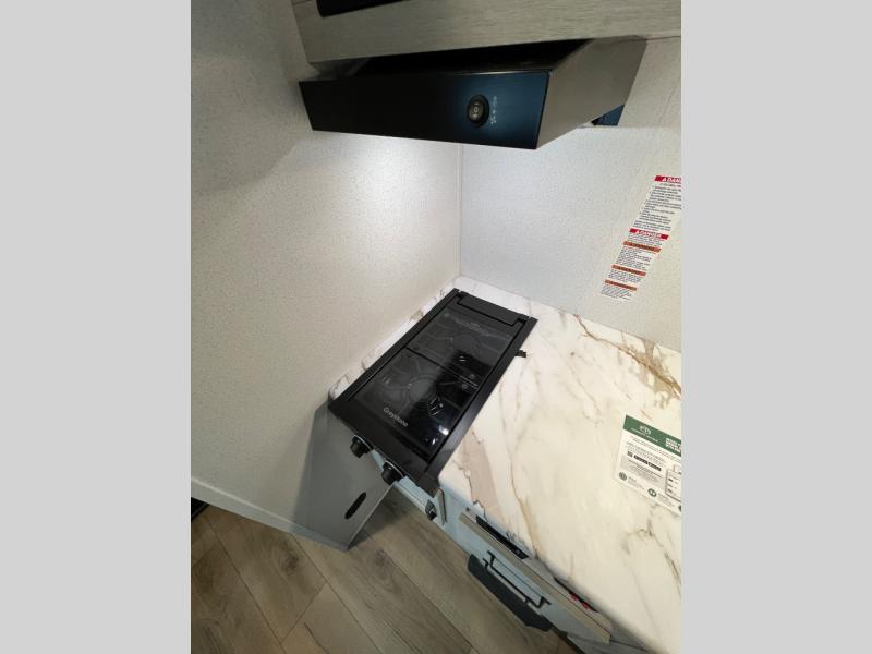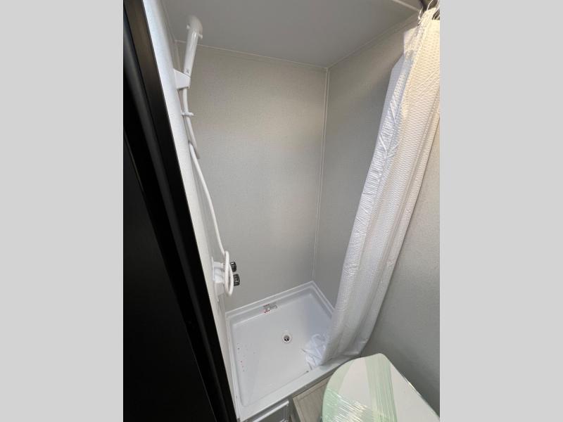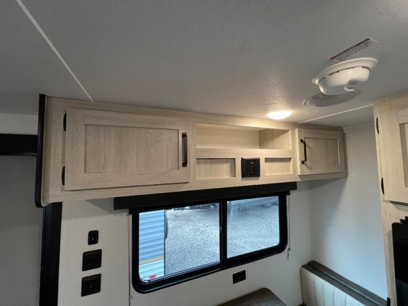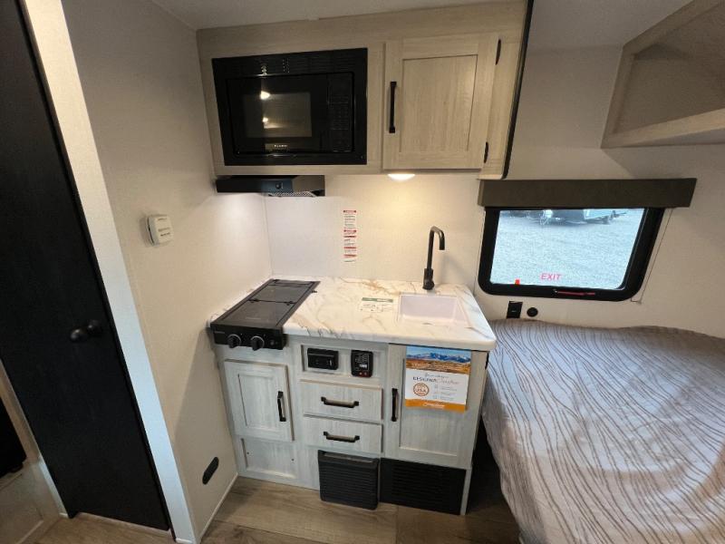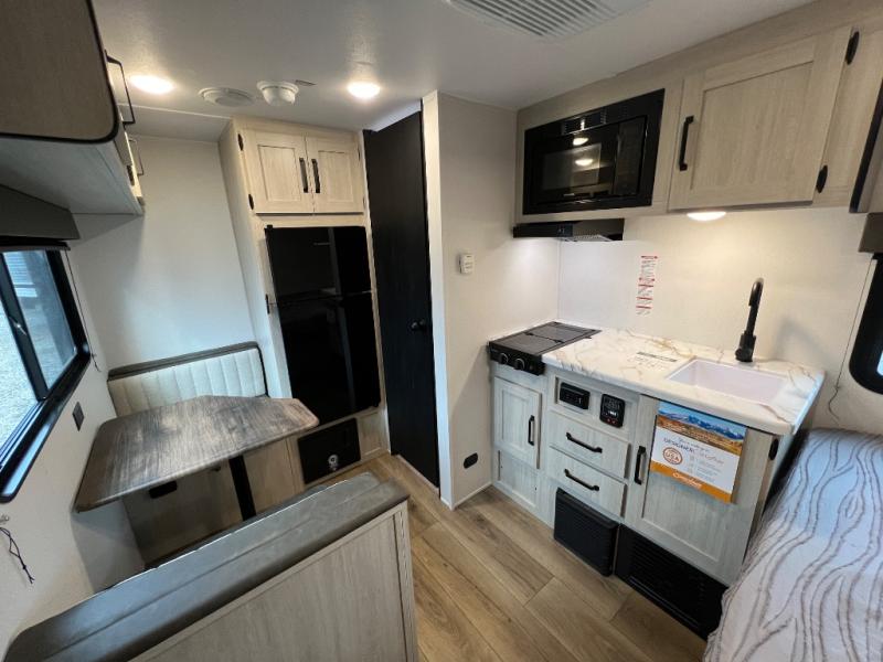 It will be so easy to enjoy camping trips in this single axle travel trailer! There is a front RV queen bed with flip-up storage at the foot of the bed for your belongings, and any additional guests can sleep on the booth dinette with an open shelf above. A full kitchen includes a stainless two burner cooktop and stainless microwave to cook meals each day, and the 4.3 cu. ft. 12V black glass refrigerator will keep your food fresh. And a private bath includes a 24" x 32" shower to clean off after a day outdoors!