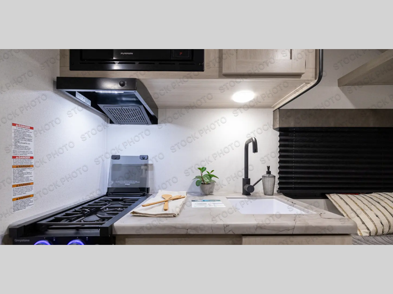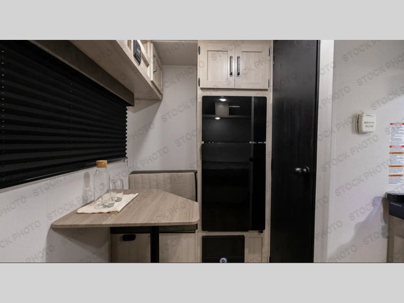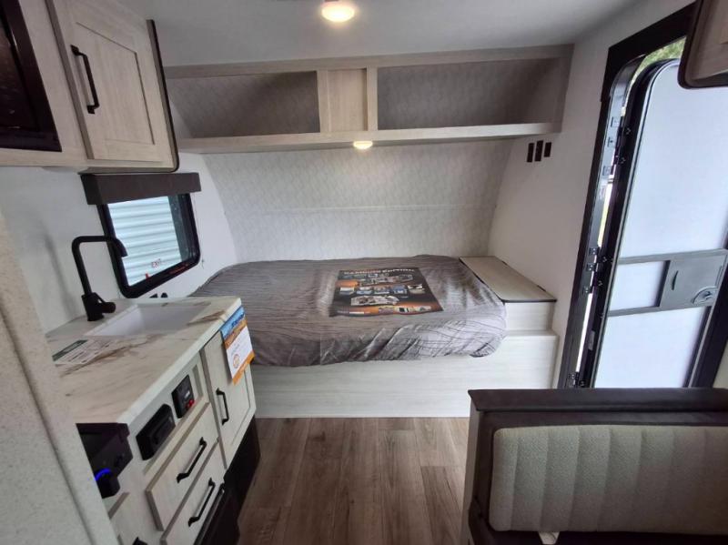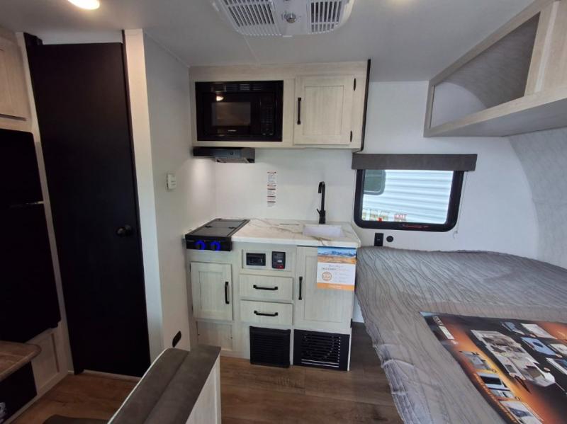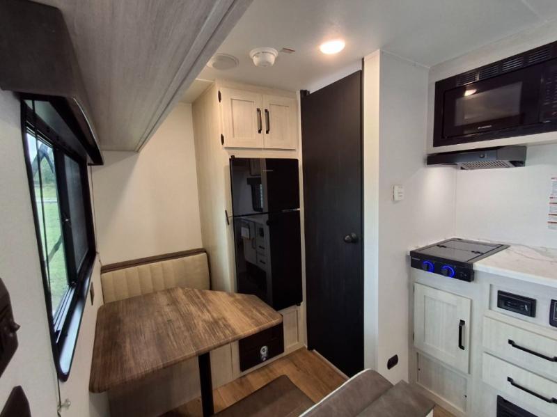 It will be so easy to enjoy camping trips in this single axle travel trailer! There is a front RV queen bed with flip-up storage at the foot of the bed for your belongings, and any additional guests can sleep on the booth dinette with an open shelf above. A full kitchen includes a stainless two burner cooktop and stainless microwave to cook meals each day, and the 4.3 cu. ft. 12V black glass refrigerator will keep your food fresh. And a private bath includes a 24" x 32" shower to clean off after a day outdoors!
