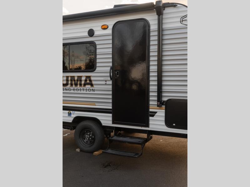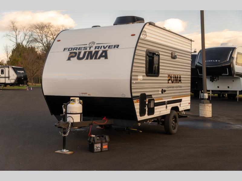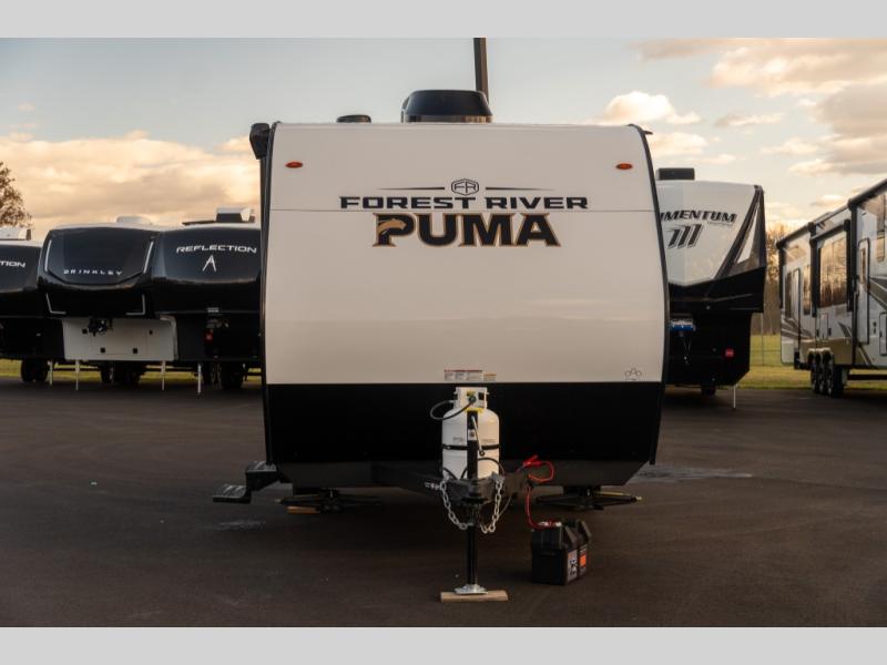 The Puma Camping Edition by Forest River offer an affordable travel trailer for rookie campers or seasoned RVers! They are built with 5/8" tongue and groove plywood flooring and a front diamond plate for added protection. There are also exterior magnetic baggage door latches, back up camera prep, a battery disconnect. Head inside to find Thermofoil countertops with a smooth drop edge, bedroom USB ports and outlets, and pleated shades in the living room.