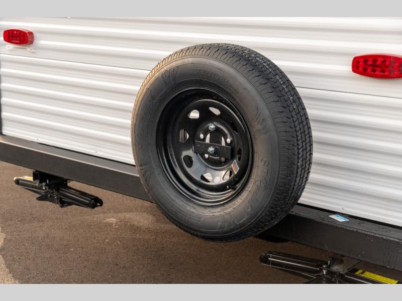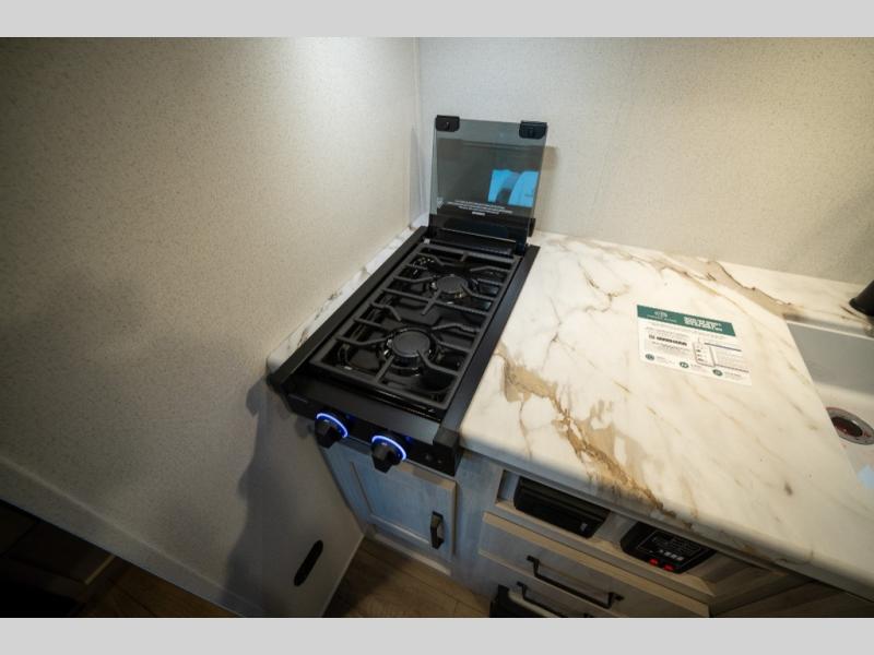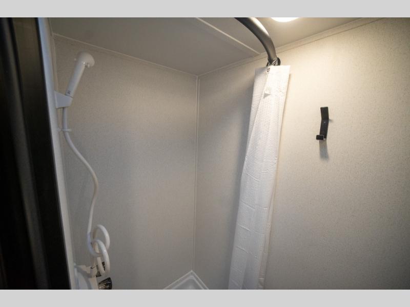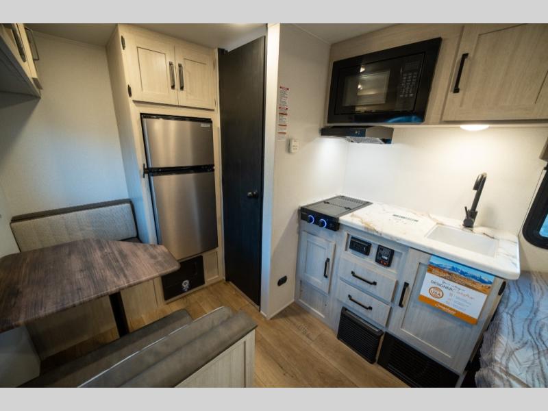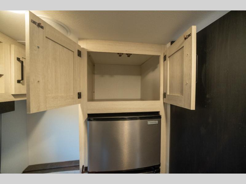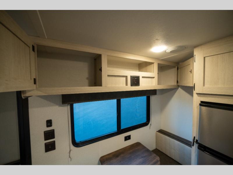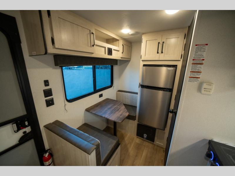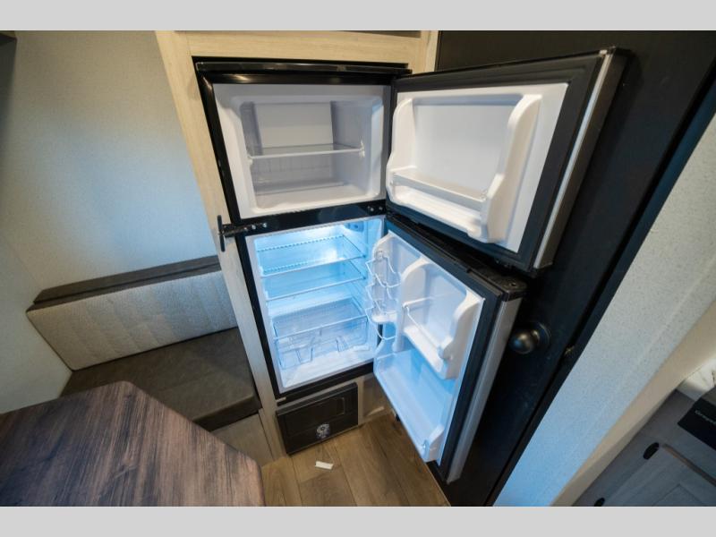 It will be so easy to enjoy camping trips in this single axle travel trailer! There is a front RV queen bed with flip-up storage at the foot of the bed for your belongings, and any additional guests can sleep on the booth dinette with an open shelf above. A full kitchen includes a two-burner cooktop and microwave to cook meals each day, and the 12V black glass refrigerator will keep your food fresh. And a private bath includes a 24" x 32" shower to clean off after a day outdoors!