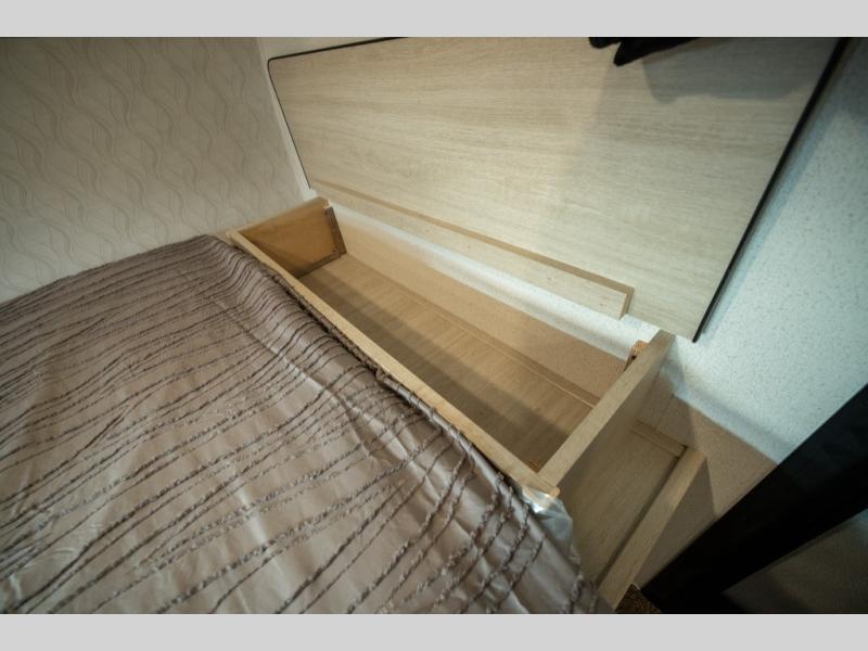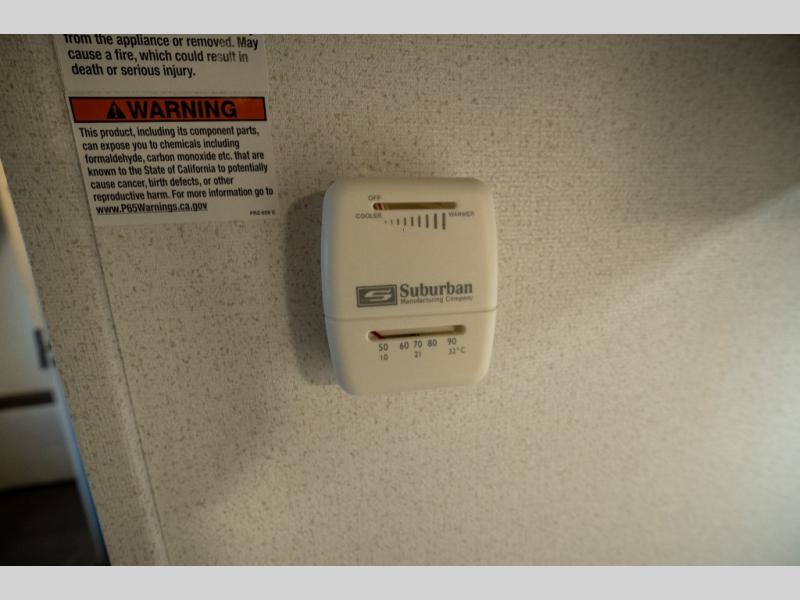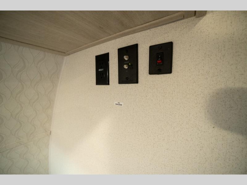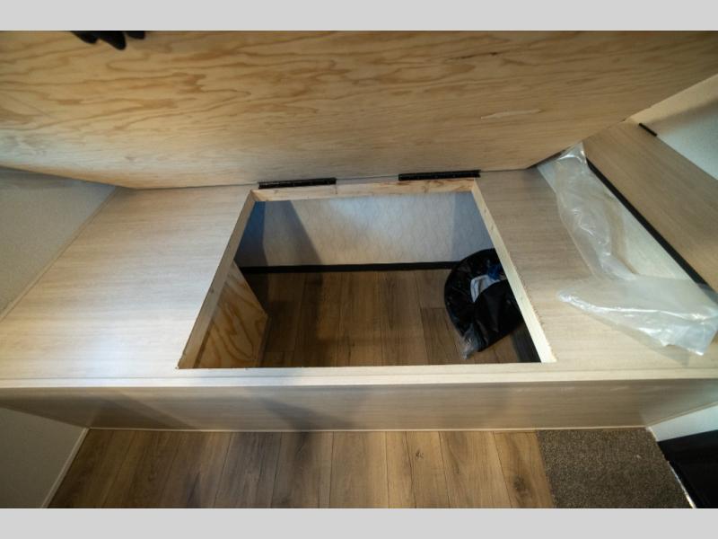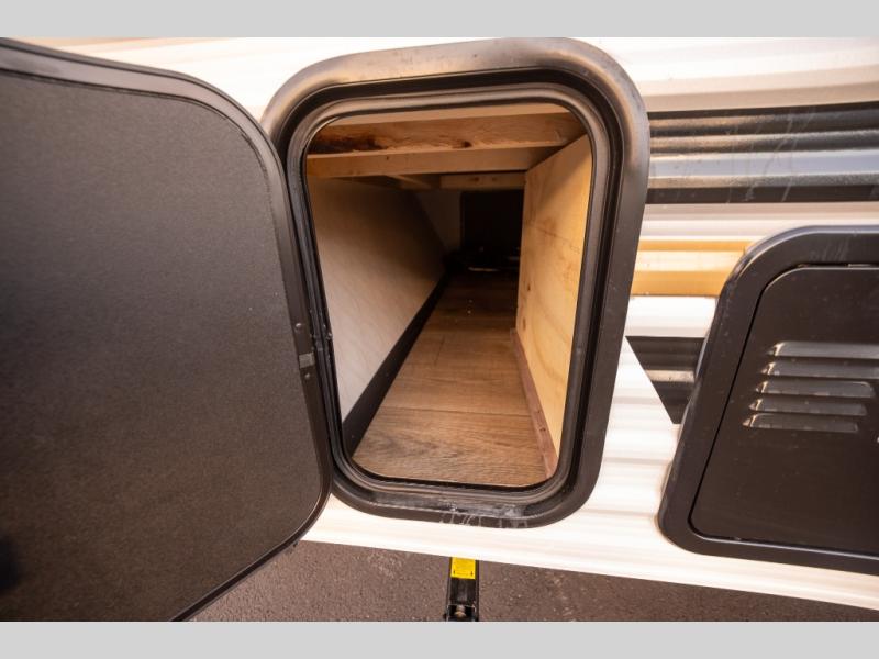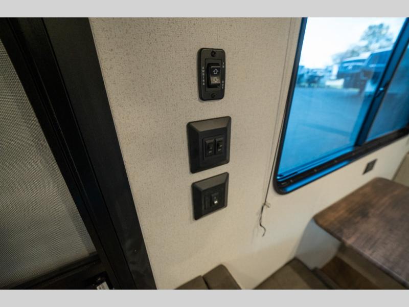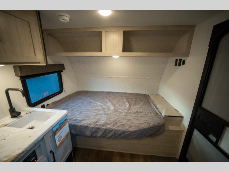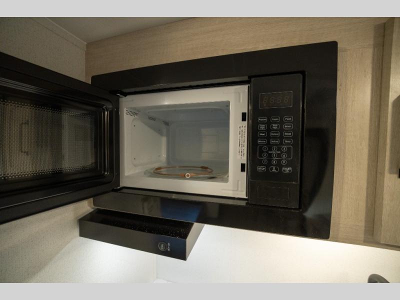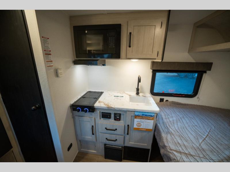 It will be so easy to enjoy camping trips in this single axle travel trailer! There is a front RV queen bed with flip-up storage at the foot of the bed for your belongings, and any additional guests can sleep on the booth dinette with an open shelf above. A full kitchen includes a two-burner cooktop and microwave to cook meals each day, and the 12V black glass refrigerator will keep your food fresh. And a private bath includes a 24" x 32" shower to clean off after a day outdoors!