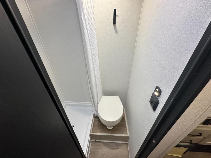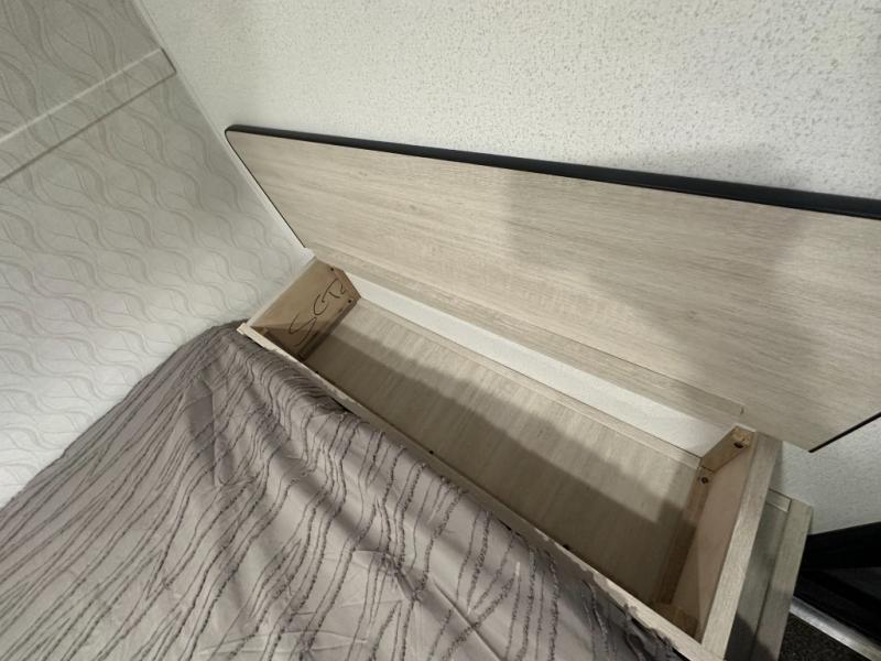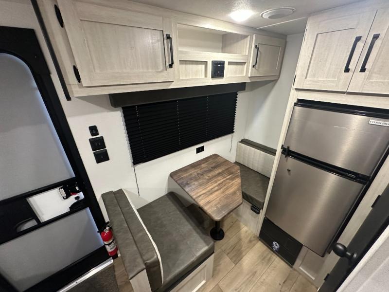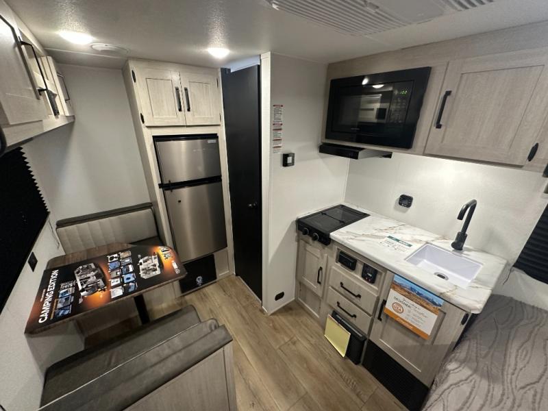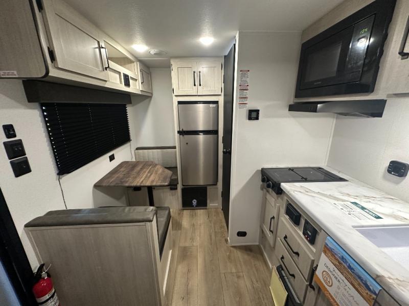 It will be so easy to enjoy camping trips in this single axle travel trailer! There is a front RV queen bed with flip-up storage at the foot of the bed for your belongings, and any additional guests can sleep on the booth dinette with an open shelf above. A full kitchen includes a two-burner cooktop and microwave to cook meals each day, and the 12V black glass refrigerator will keep your food fresh. And a private bath includes a 24" x 32" shower to clean off after a day outdoors!