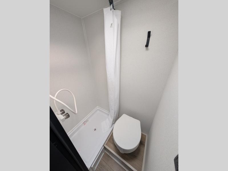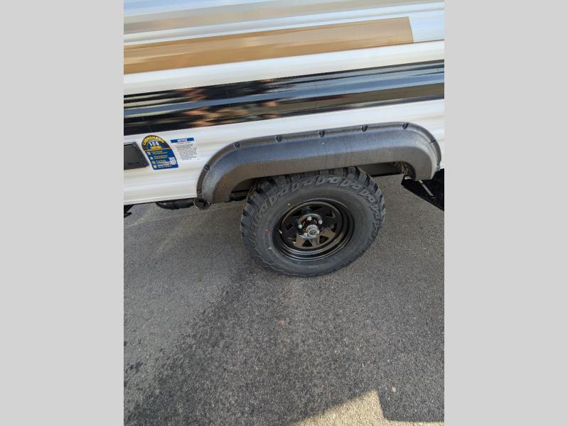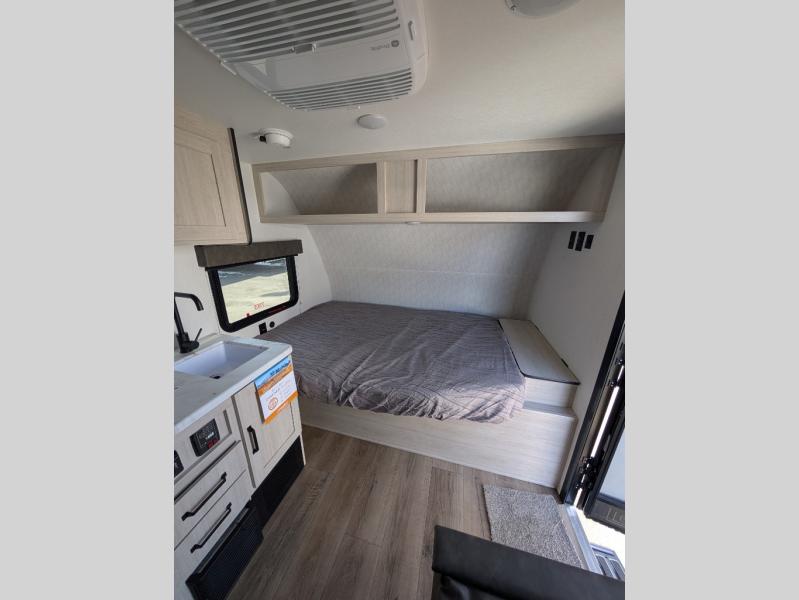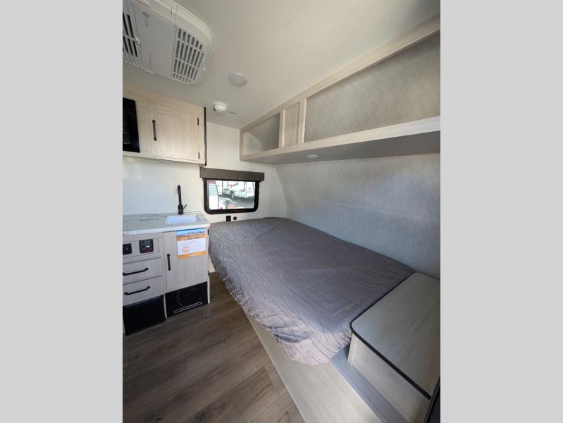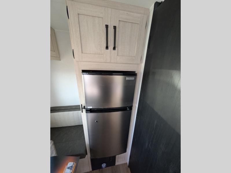 It will be so easy to enjoy camping trips in this single axle travel trailer! There is a front RV queen bed with flip-up storage at the foot of the bed for your belongings, and any additional guests can sleep on the booth dinette with an open shelf above. A full kitchen includes a two-burner cooktop and microwave to cook meals each day, and the 12V black glass refrigerator will keep your food fresh. And a private bath includes a 24" x 32" shower to clean off after a day outdoors!