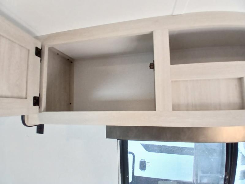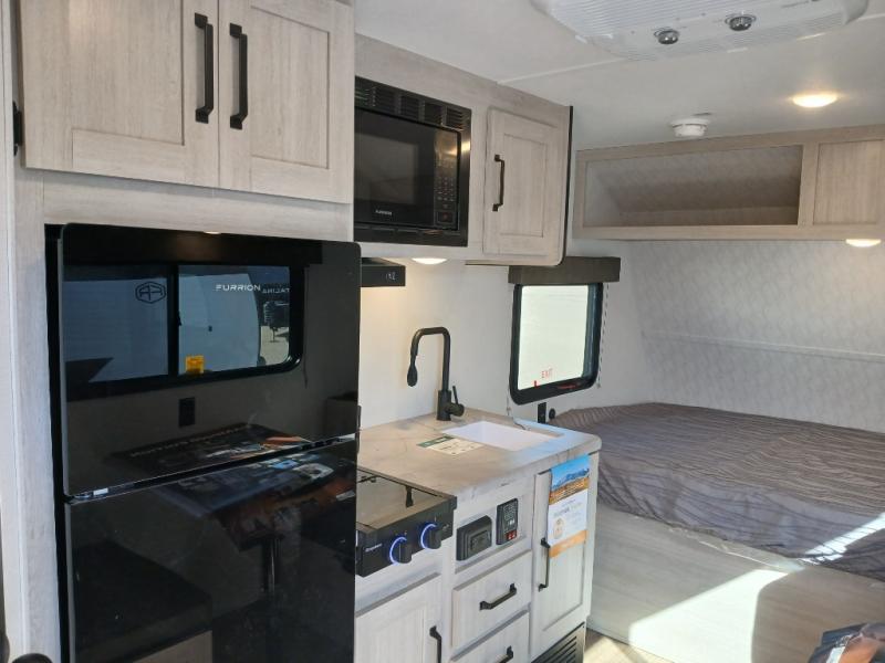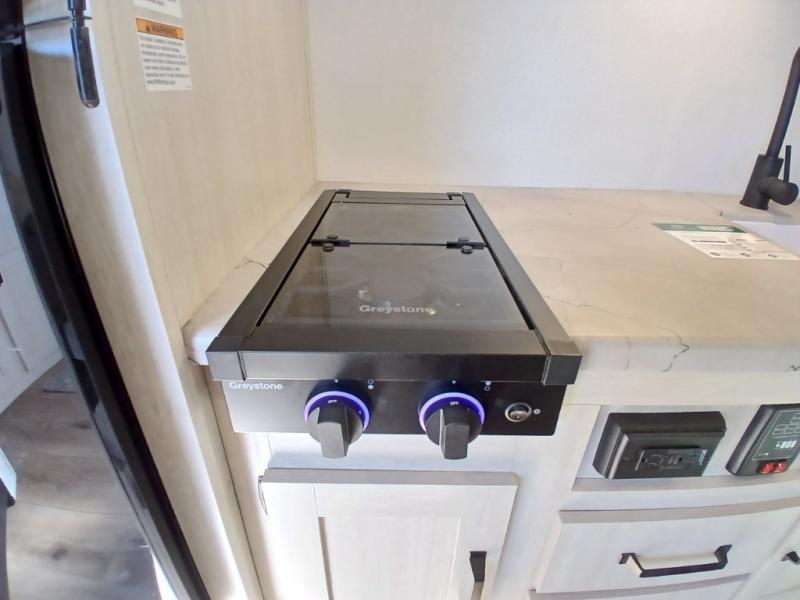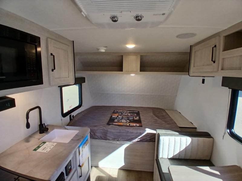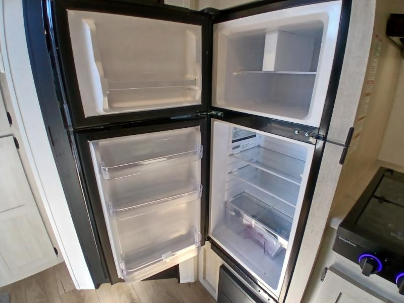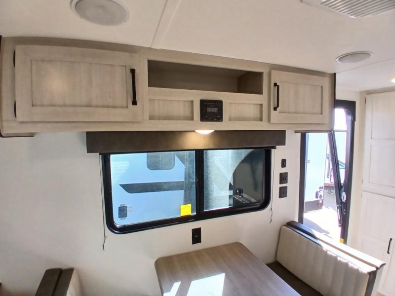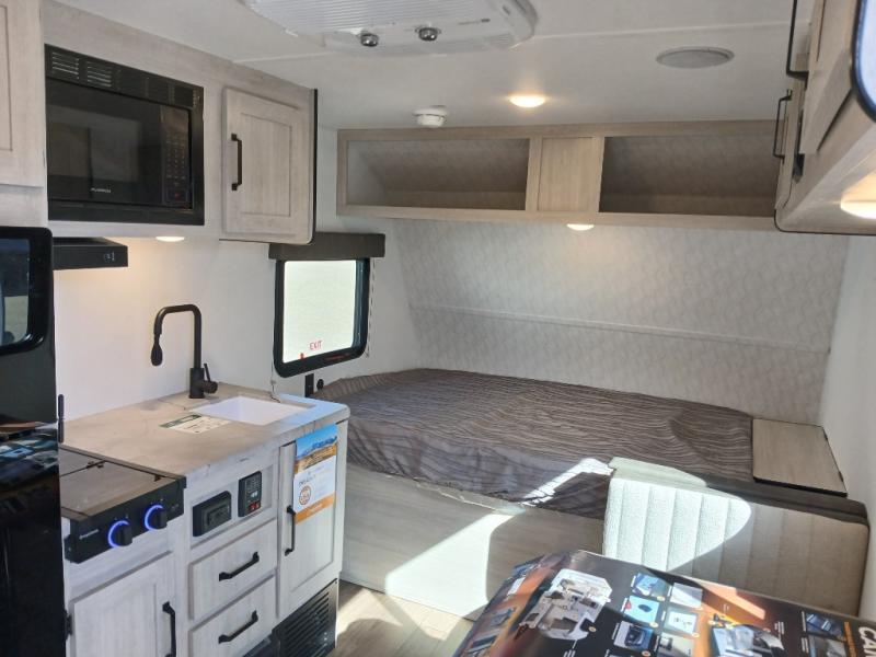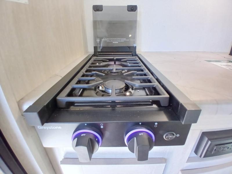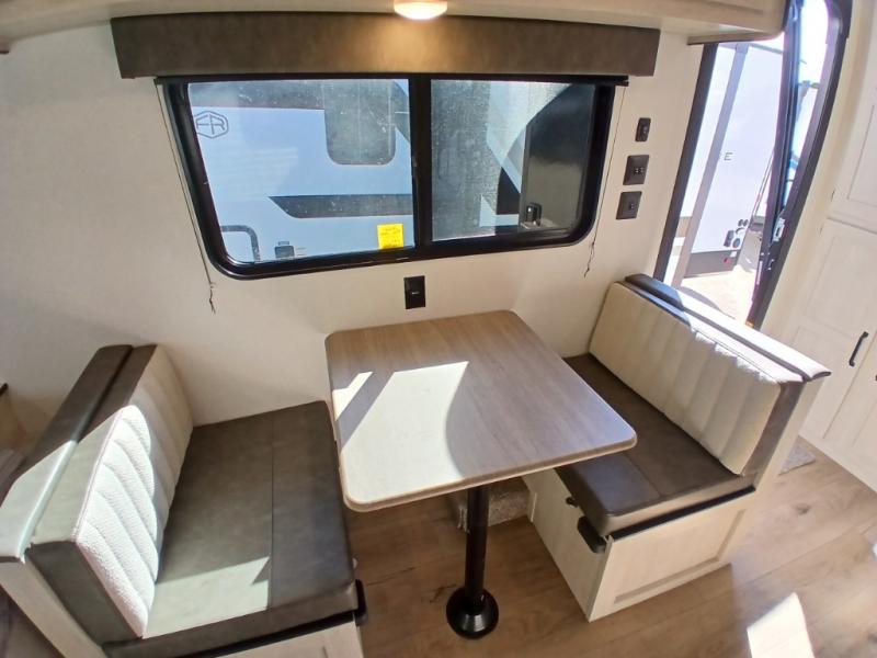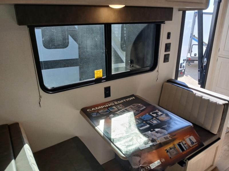 It will be so easy to enjoy camping trips in this single axle travel trailer! There is a front RV queen bed with flip-up storage at the foot of the bed for your belongings, and an additional guest or two little ones can sleep on the booth dinette when it's not being used to dine at. A full kitchen includes a stainless two burner cooktop and stainless microwave to cook meals each day, and the 4.3 cu. ft. 12V black glass refrigerator will keep your food fresh. And a private bath with a toilet and shower will let you freshen up without having to use the camp's facilities!