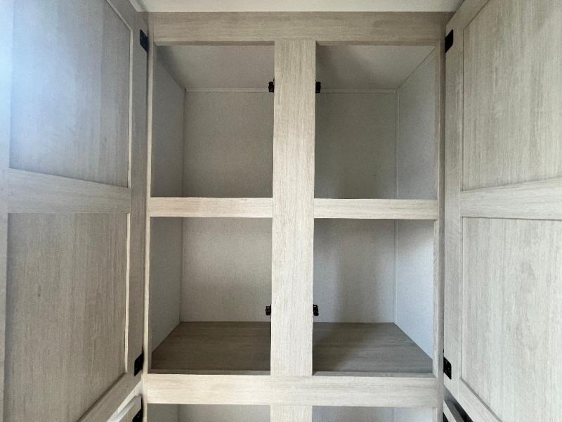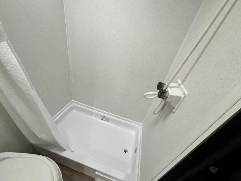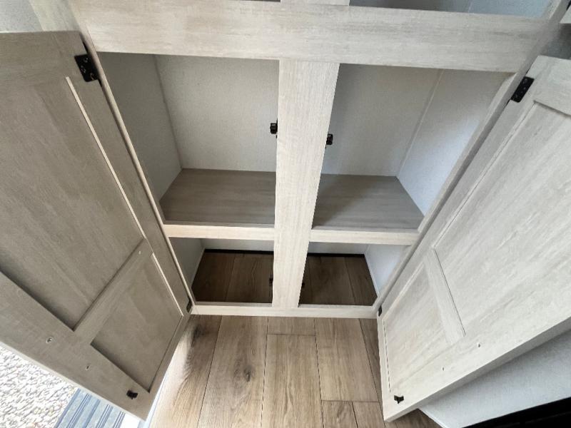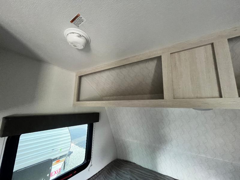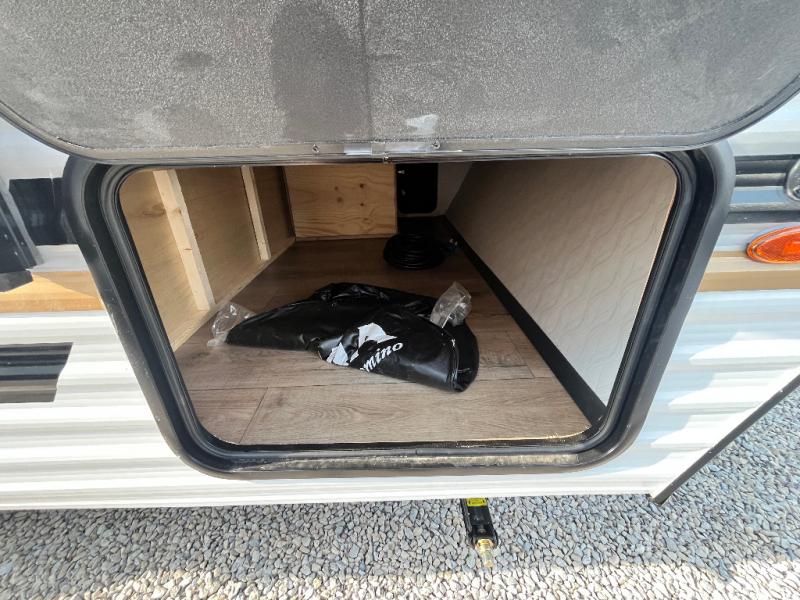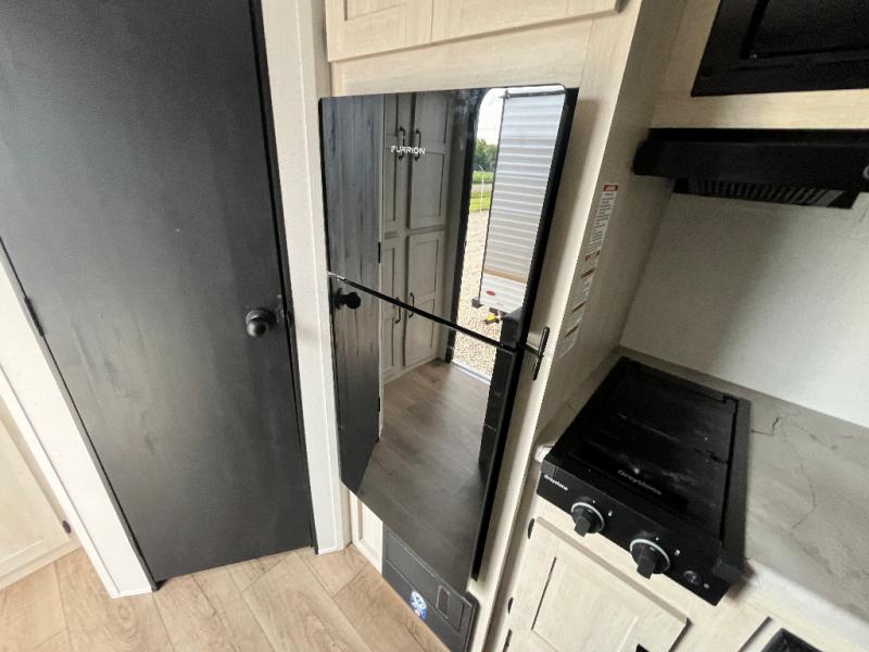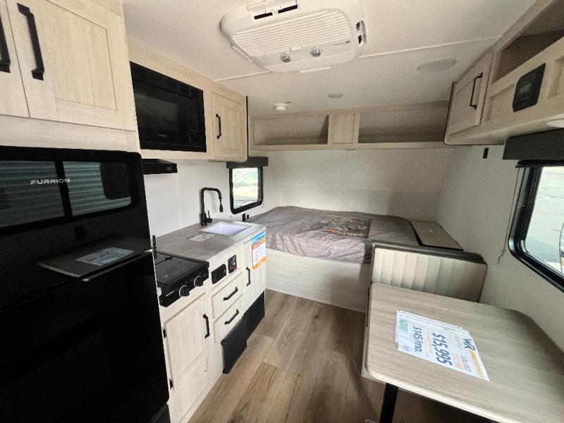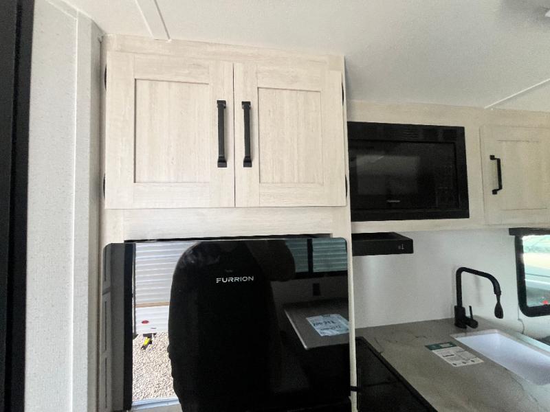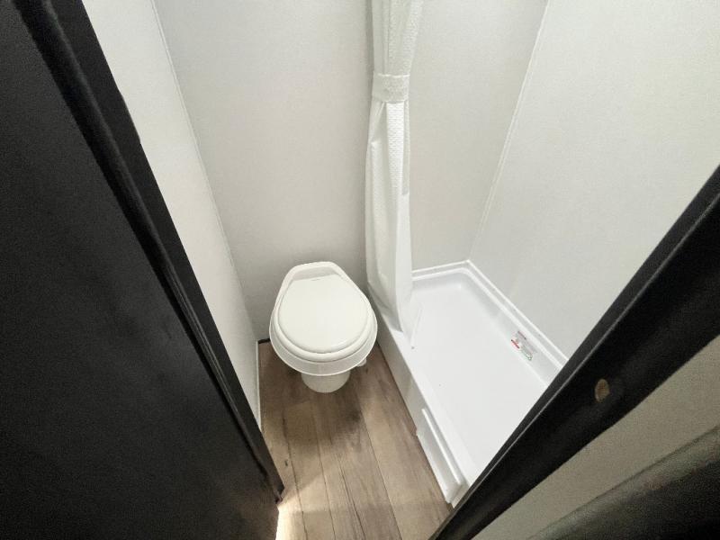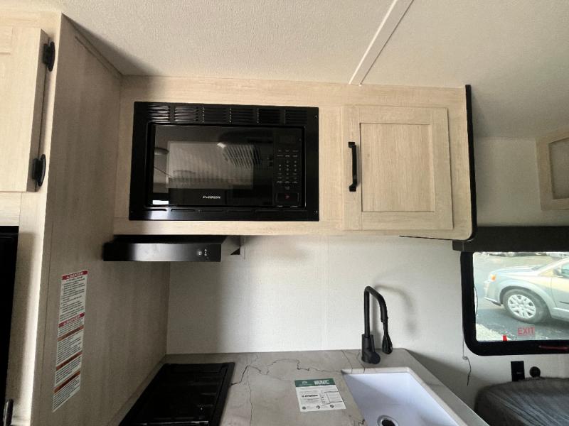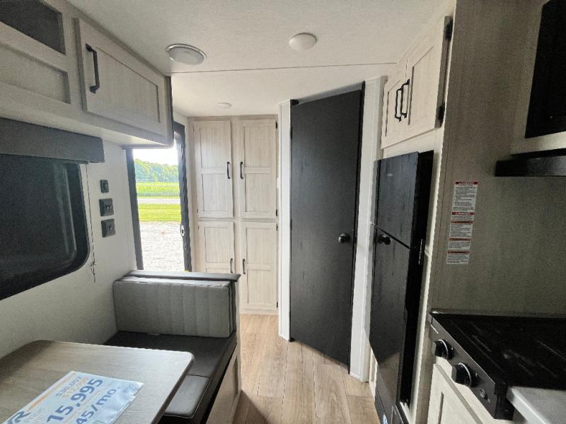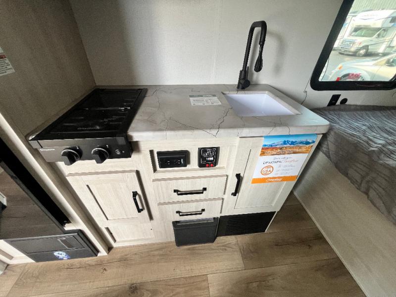 It will be so easy to enjoy camping trips in this single axle travel trailer! There is a front RV queen bed with flip-up storage at the foot of the bed for your belongings, and an additional guest or two little ones can sleep on the booth dinette when it's not being used to dine at. A full kitchen includes a stainless two burner cooktop and stainless microwave to cook meals each day, and the 4.3 cu. ft. 12V black glass refrigerator will keep your food fresh. And a private bath with a toilet and shower will let you freshen up without having to use the camp's facilities!