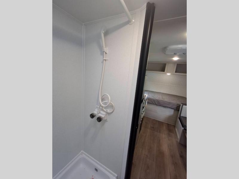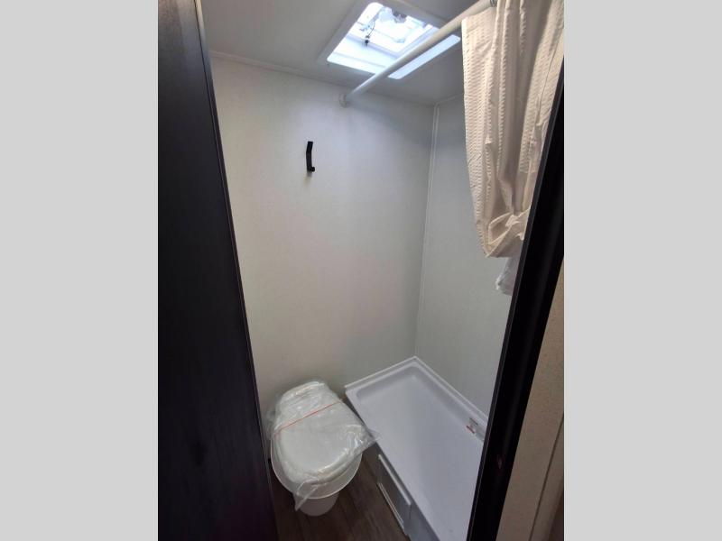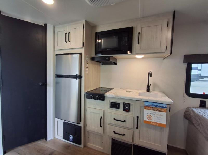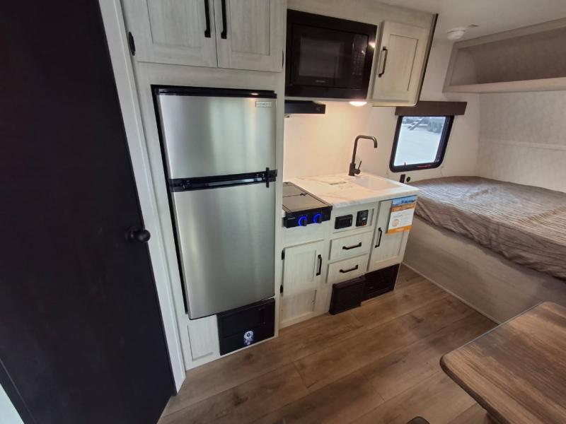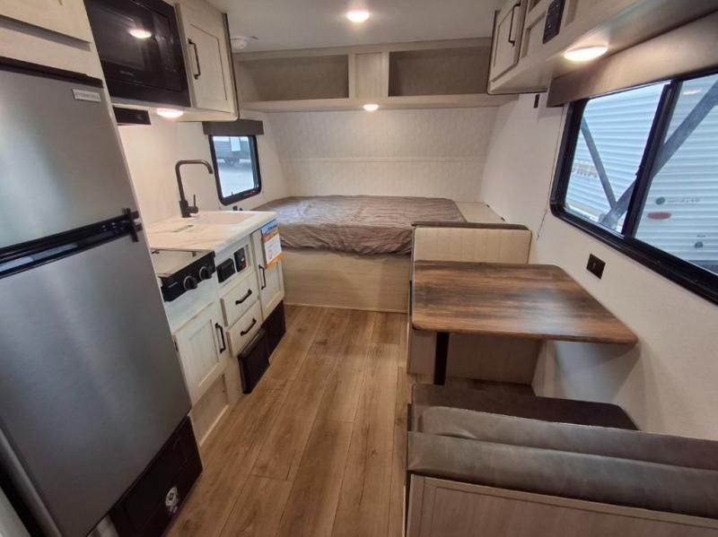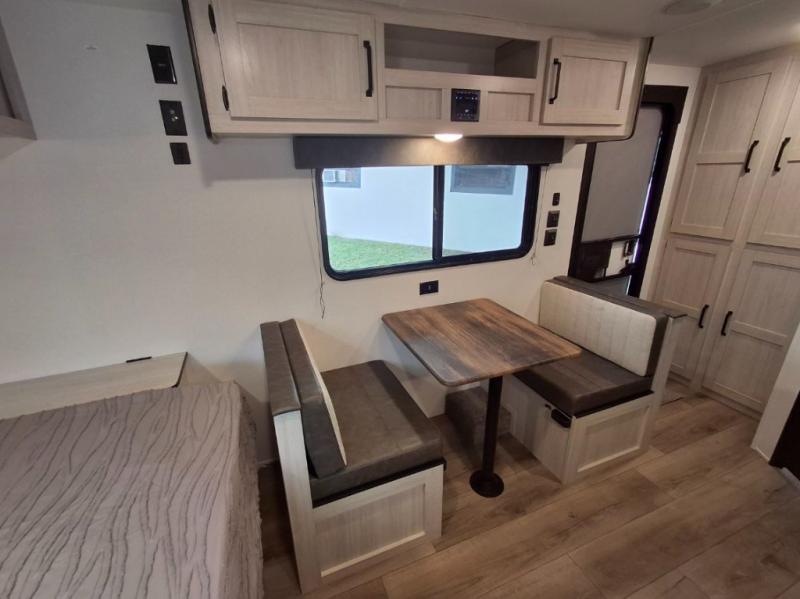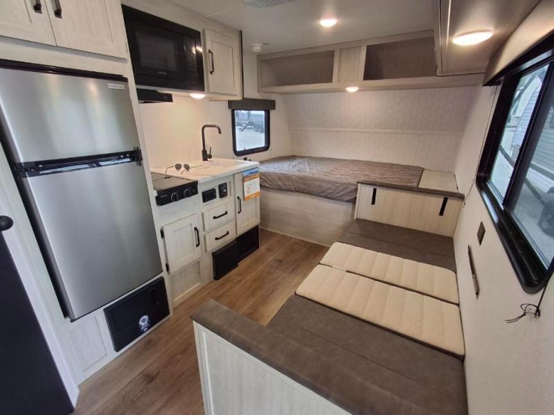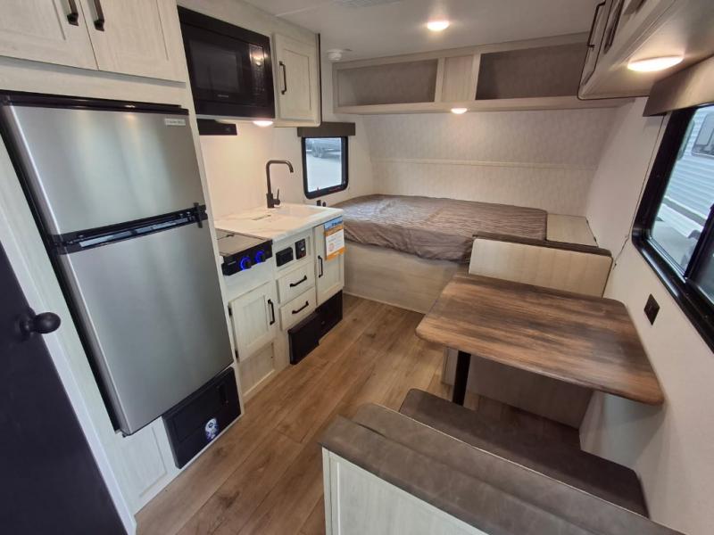 It will be so easy to enjoy camping trips in this single axle travel trailer! There is a front RV queen bed with flip-up storage at the foot of the bed for your belongings, and an additional guest or two little ones can sleep on the booth dinette when it's not being used to dine at. A full kitchen includes a two-burner cooktop and microwave to cook meals each day, and the 12V black glass refrigerator will keep your food fresh. And a private bath with a toilet and shower will let you freshen up without having to use the camp's facilities!