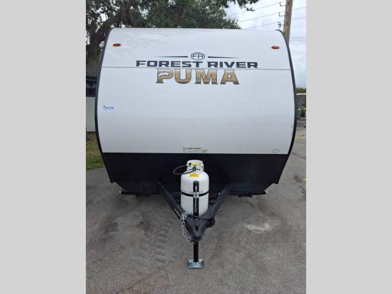 The Puma Camping Edition by Forest River offer an affordable travel trailer for rookie campers or seasoned RVers! They are built with 5/8" tongue and groove plywood flooring and a front diamond plate for added protection. There are also exterior magnetic baggage door latches, back up camera prep, a battery disconnect. Head inside to find Thermofoil countertops with a smooth drop edge, bedroom USB ports and outlets, and pleated shades in the living room.