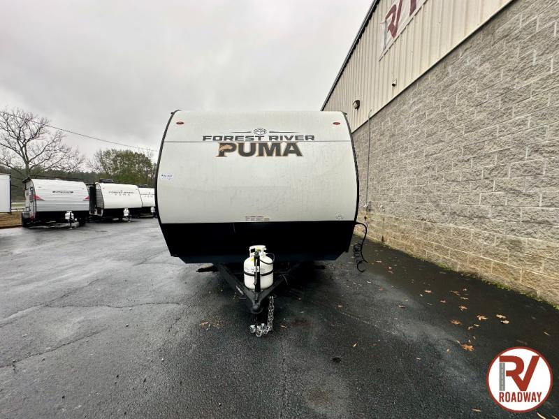The Puma Camping Edition by Palomino offer an affordable toy hauler for rookie campers or seasoned RVers! They are built with 5/8" tongue and groove plywood flooring and a front diamond plate for added protection. There are also exterior magnetic baggage door latches, back up camera prep, a battery disconnect. Head inside to find Thermofoil countertops with a smooth drop edge, bedroom USB ports and outlets, and pleated shades in the living room.