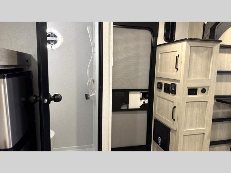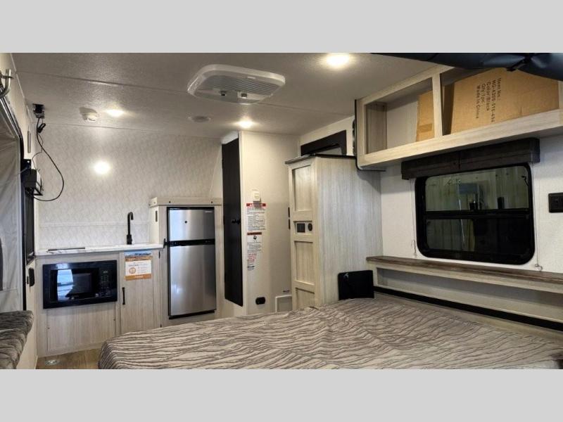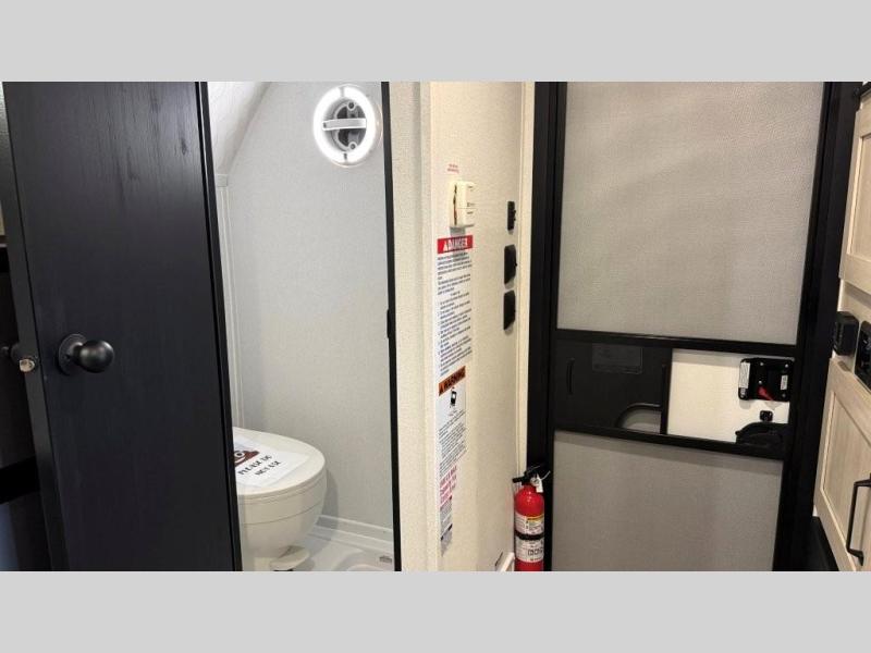 The outdoor enthusiast has met their match with this lightweight toy hauler. Once you've unloaded your bikes or kayaks using the ramp door, you can take a rest on the 54" x 74" Murphy bed, make lunch in the front corner kitchen, or freshen up in the 23" x 38" shower combo! And an optional fold-out tent bed is available if you're needing additional sleeping space!