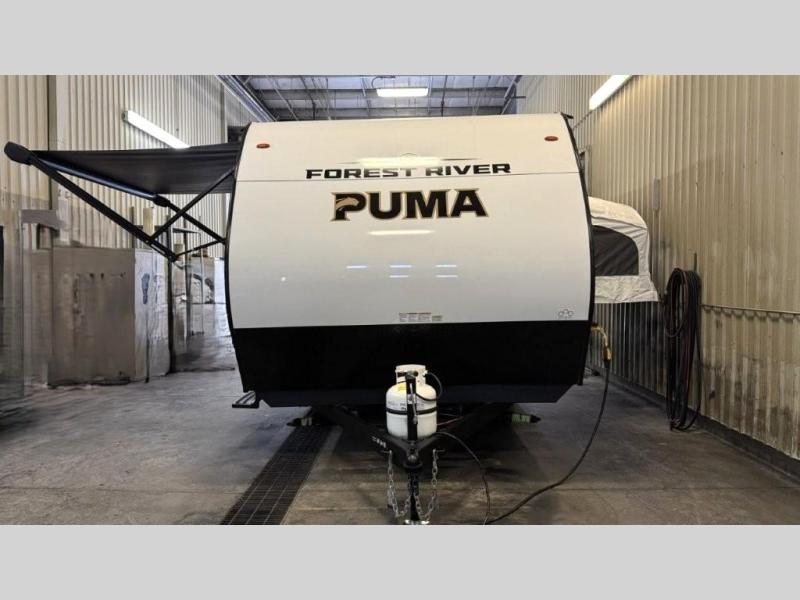 The Puma Camping Edition by Palomino offer an affordable toy hauler for rookie campers or seasoned RVers! They are built with 5/8" tongue and groove plywood flooring and a front diamond plate for added protection. There are also exterior magnetic baggage door latches, back up camera prep, a battery disconnect. Head inside to find Thermofoil countertops with a smooth drop edge, bedroom USB ports and outlets, and pleated shades in the living room.
