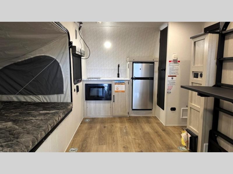 The outdoor enthusiast has met their match with this lightweight toy hauler. Once you've unloaded your bikes or kayaks using the ramp door, you can take a rest on the 54" x 74" Murphy bed, make lunch in the front corner kitchen, or freshen up in the 23" x 38" shower combo! And an optional fold-out tent bed is available if you're needing additional sleeping space!