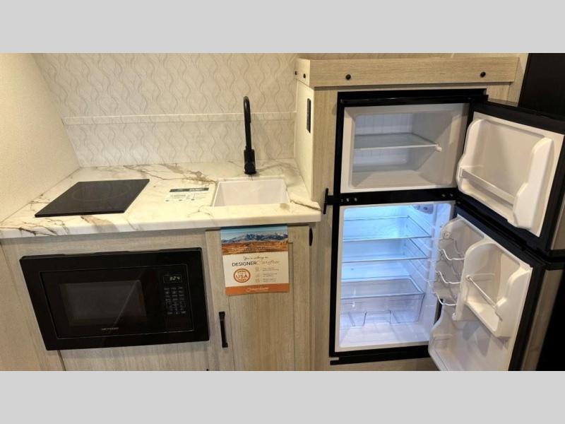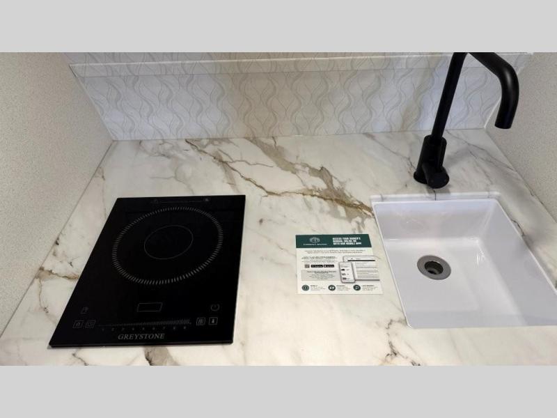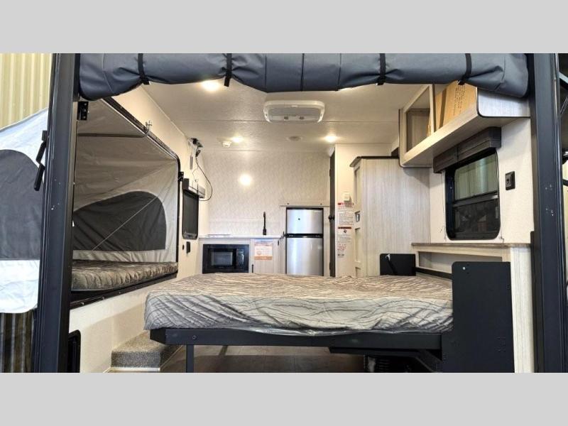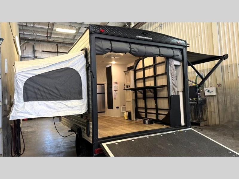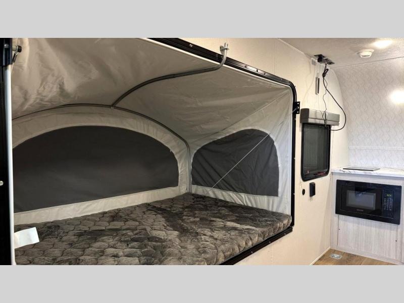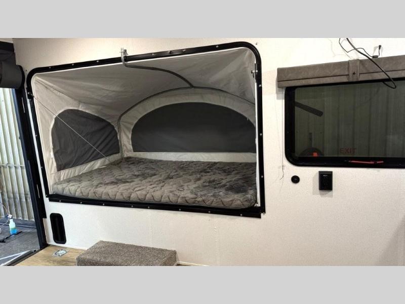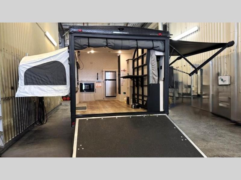 The outdoor enthusiast has met their match with this lightweight toy hauler. Once you've unloaded your bikes or kayaks using the ramp door, you can take a rest on the 54" x 74" Murphy bed, make lunch in the front corner kitchen, or freshen up in the 23" x 38" shower combo! And an optional fold-out tent bed is available if you're needing additional sleeping space!