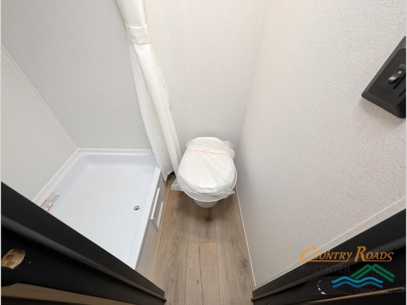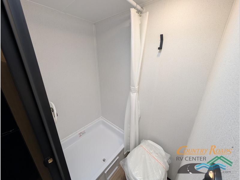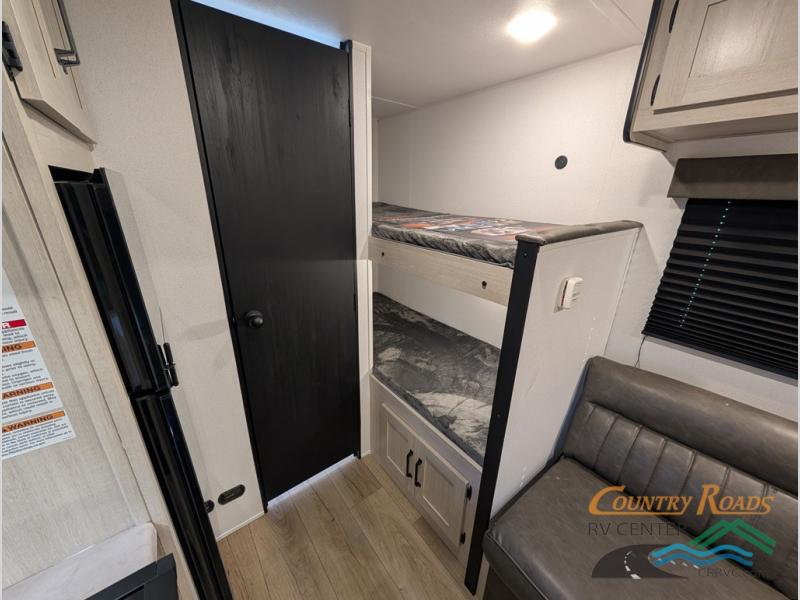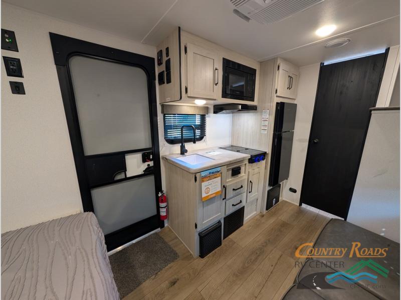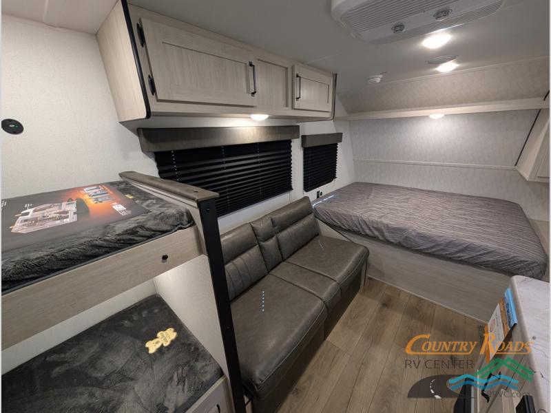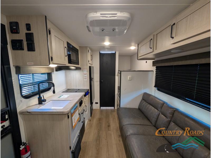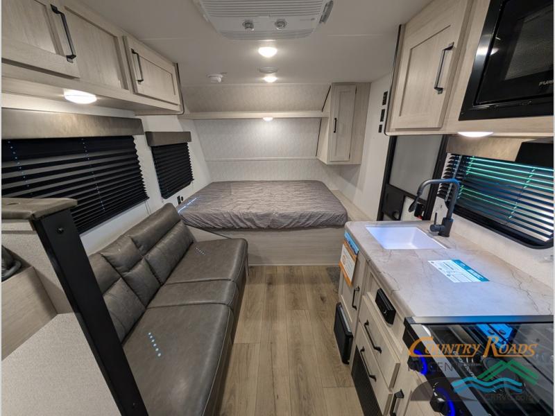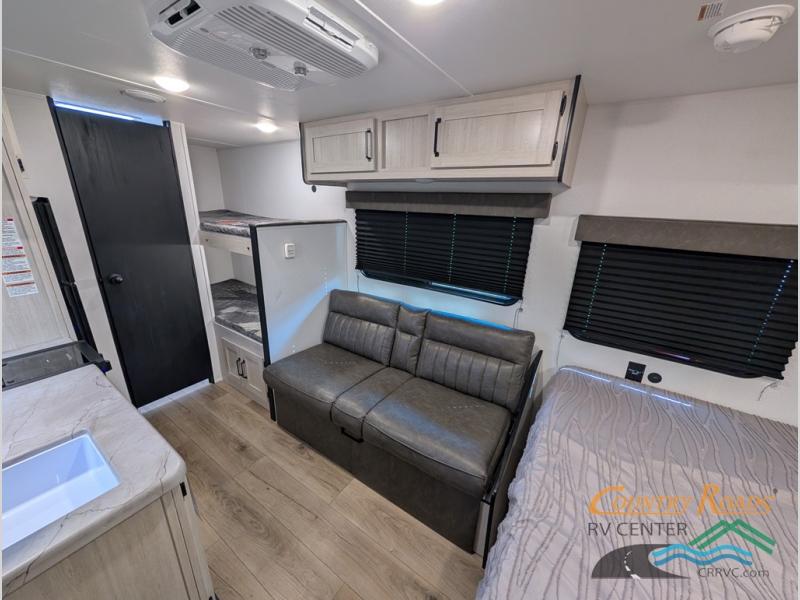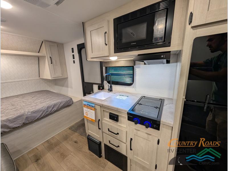 It will be so easy to enjoy camping trips in this single axle travel trailer! There is a front RV queen bed with flip-up storage at the foot of the bed for your belongings, and any additional guests can sleep on the bunk beds and sofa. A full kitchen includes a stainless two burner cooktop and stainless microwave to cook meals each day, and the 4.3 cu. ft. 12V black glass refrigerator will keep your food fresh. And a private bath with a toilet and shower will let you freshen up without having to use the camp's facilities!