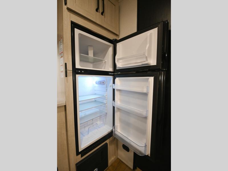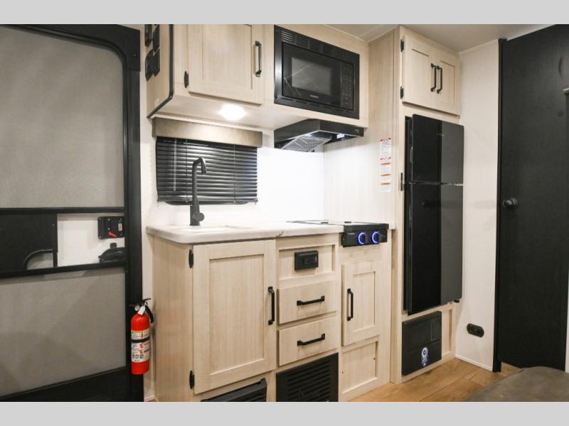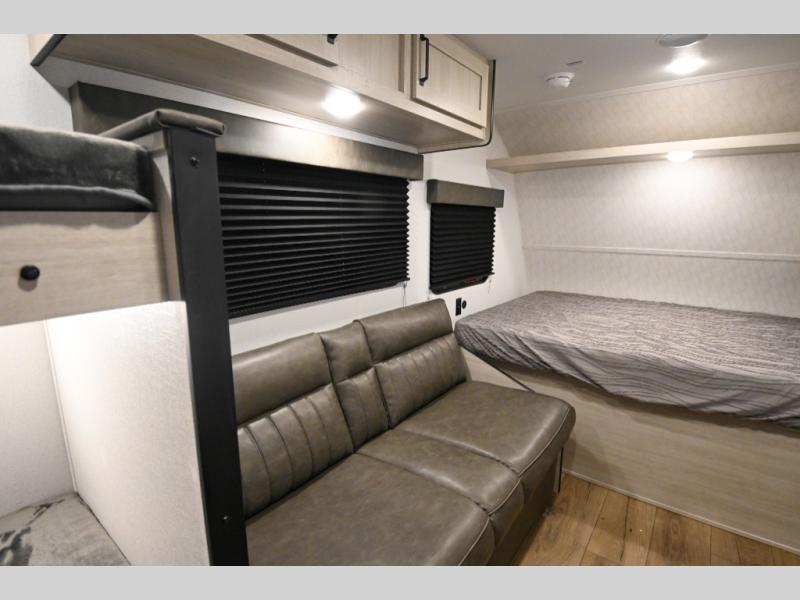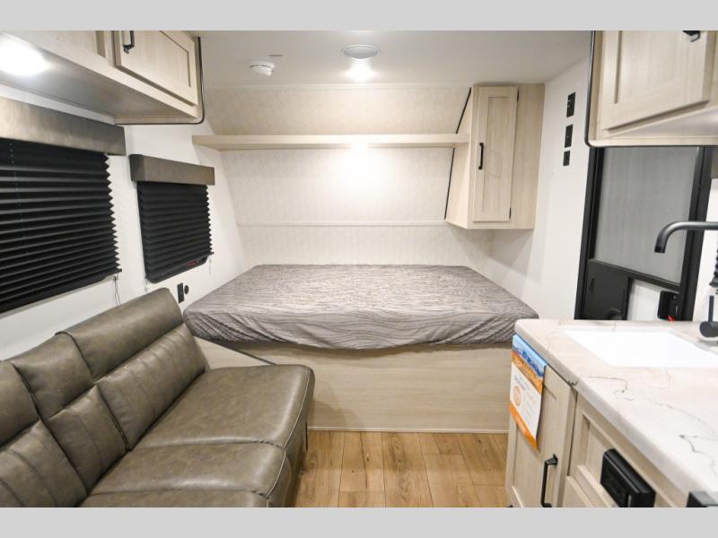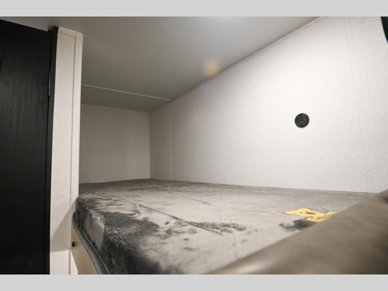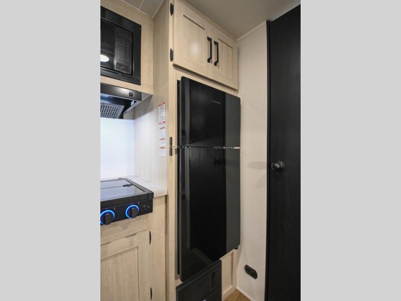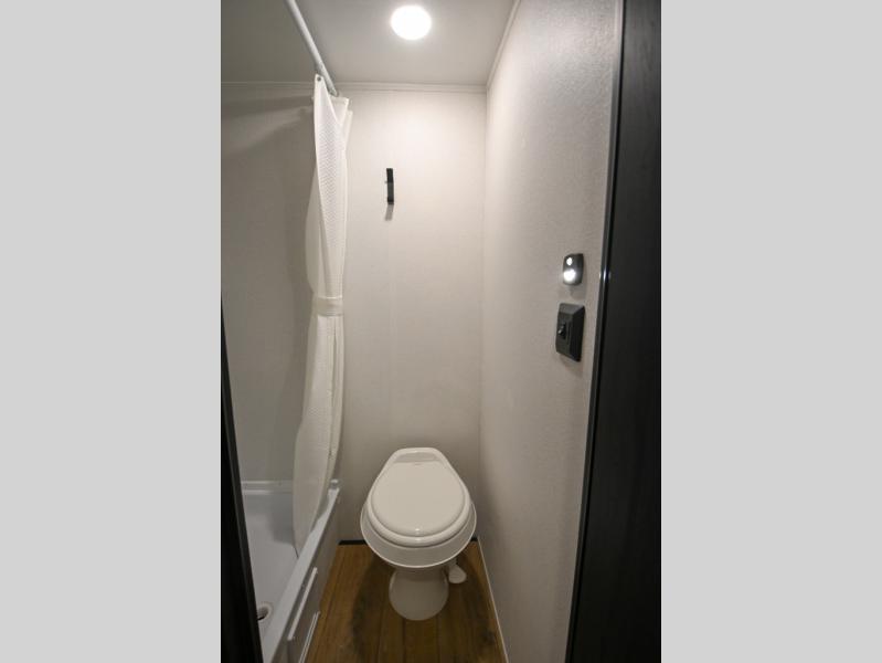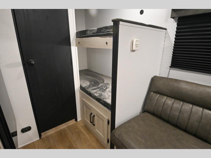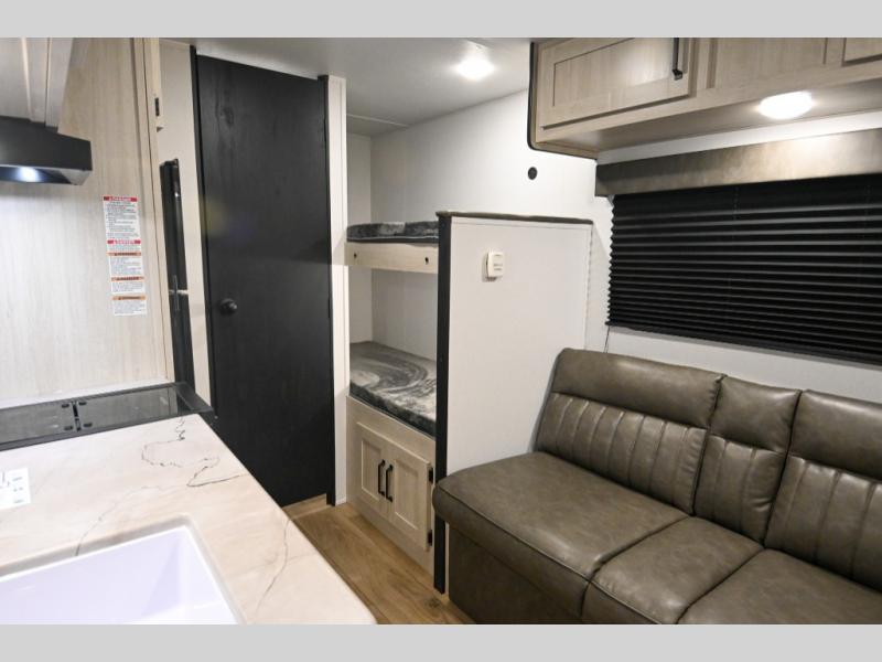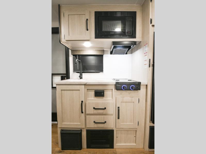 It will be so easy to enjoy camping trips in this single axle travel trailer! There is a front RV queen bed with flip-up storage at the foot of the bed for your belongings, and any additional guests can sleep on the bunk beds and sofa. A full kitchen includes a stainless two burner cooktop and stainless microwave to cook meals each day, and the 4.3 cu. ft. 12V black glass refrigerator will keep your food fresh. And a private bath with a toilet and shower will let you freshen up without having to use the camp's facilities!
