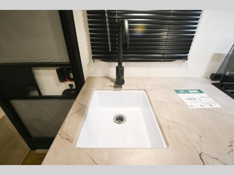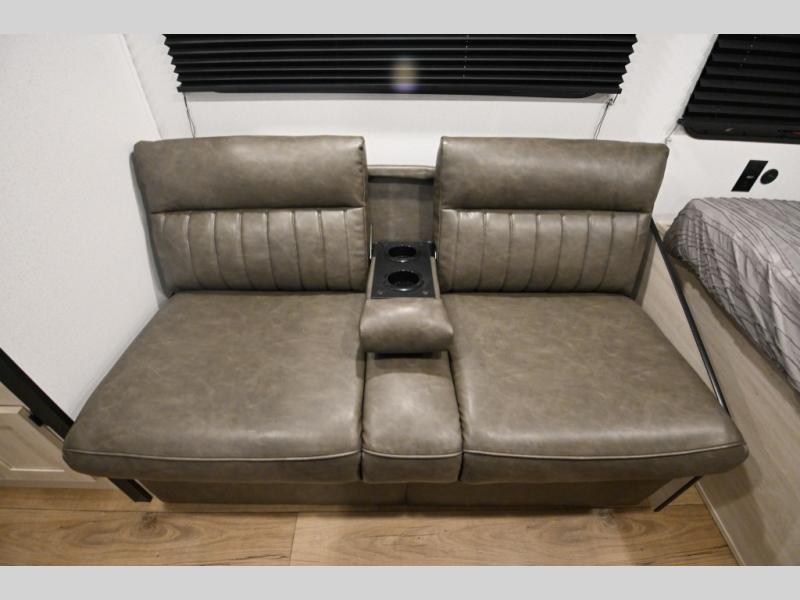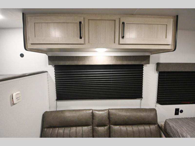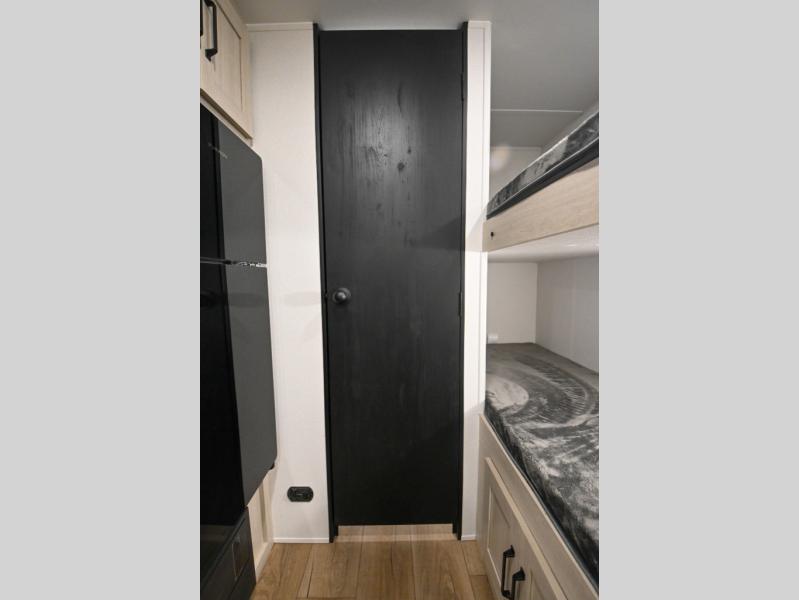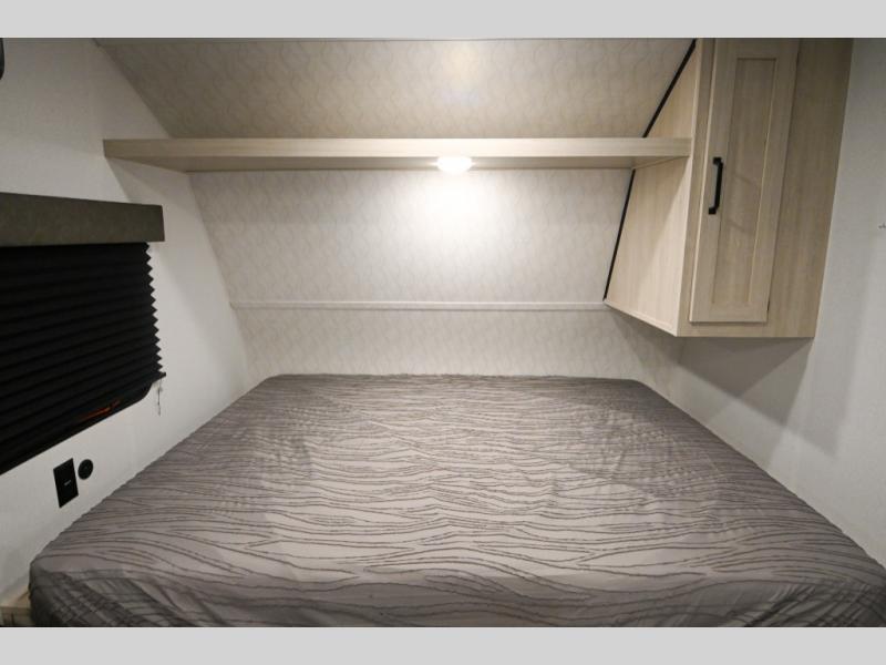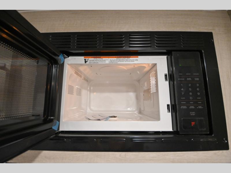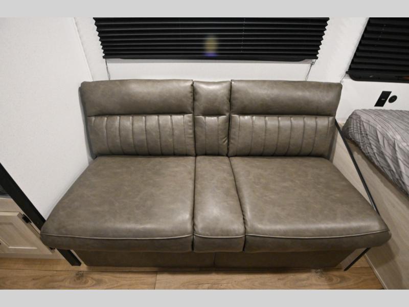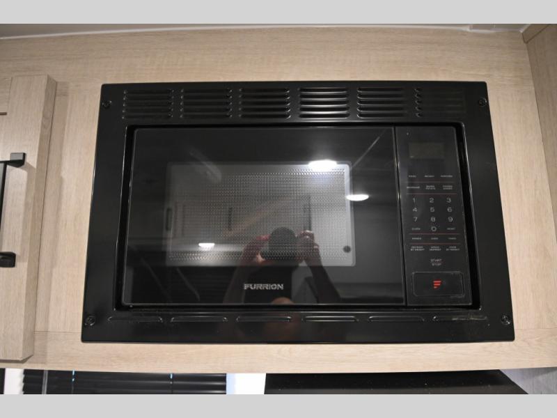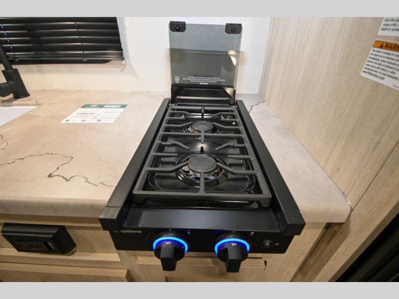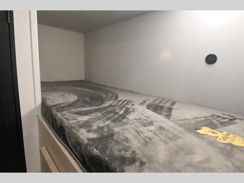 It will be so easy to enjoy camping trips in this single axle travel trailer! There is a front RV queen bed with flip-up storage at the foot of the bed for your belongings, and any additional guests can sleep on the bunk beds and sofa. A full kitchen includes a stainless two burner cooktop and stainless microwave to cook meals each day, and the 4.3 cu. ft. 12V black glass refrigerator will keep your food fresh. And a private bath with a toilet and shower will let you freshen up without having to use the camp's facilities!