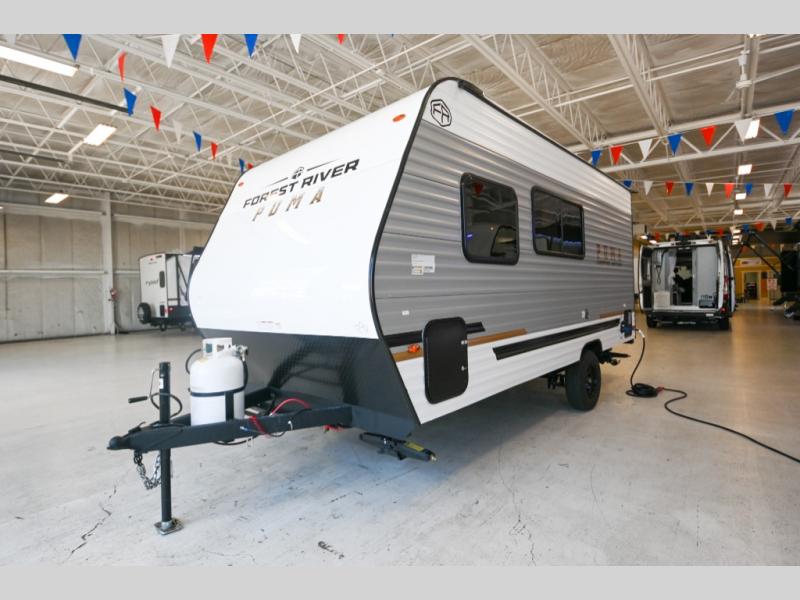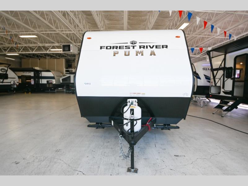 The Puma Camping Edition by Palomino offer an affordable travel trailer for rookie campers or seasoned RVers! They are built with 5/8" tongue and groove plywood flooring and a front diamond plate for added protection. There are also exterior clamp style door latches, back up camera prep, and 20 lb. LP bottles. Head inside to find Thermofoil countertops with a smooth drop edge, bedroom USB ports and outlets, and a GE appliance and kitchen package.