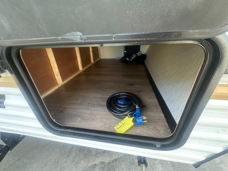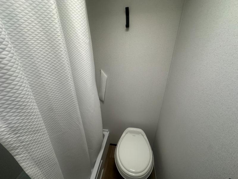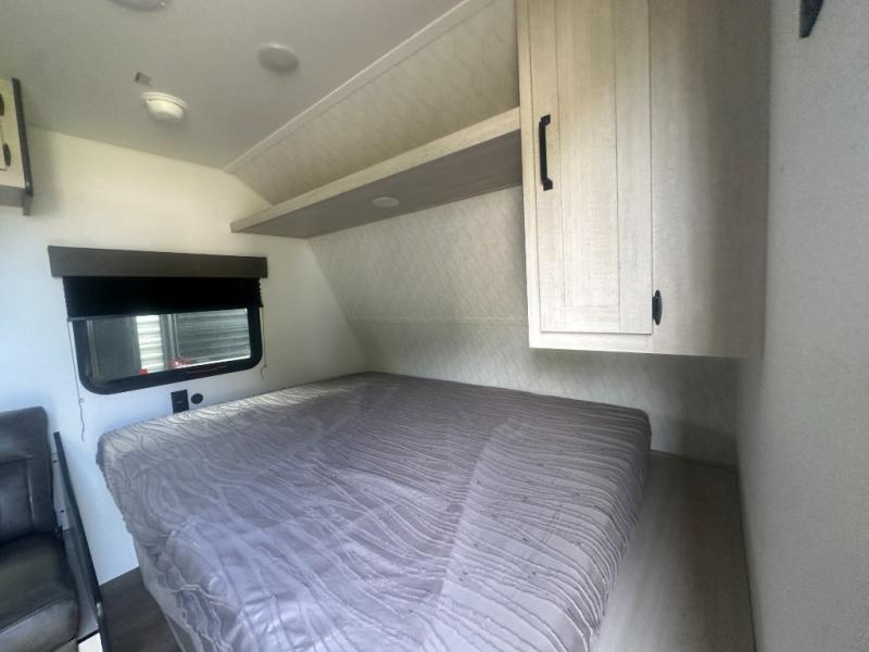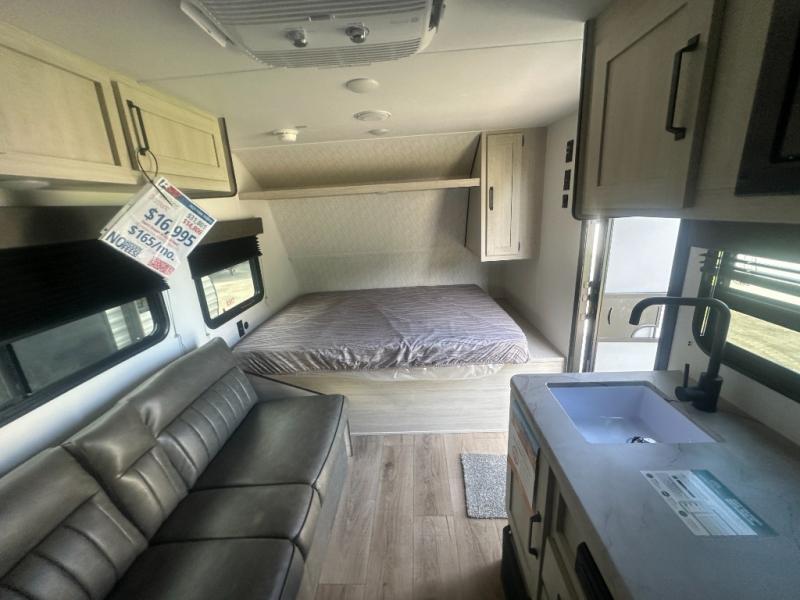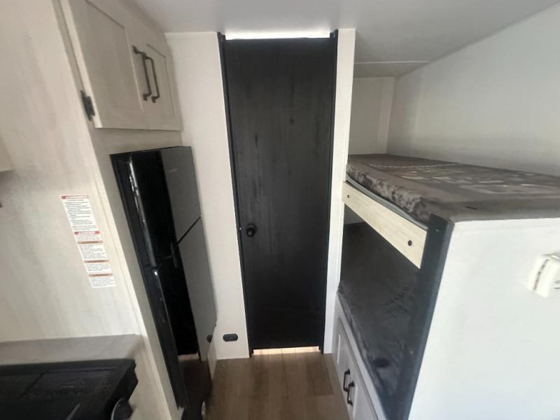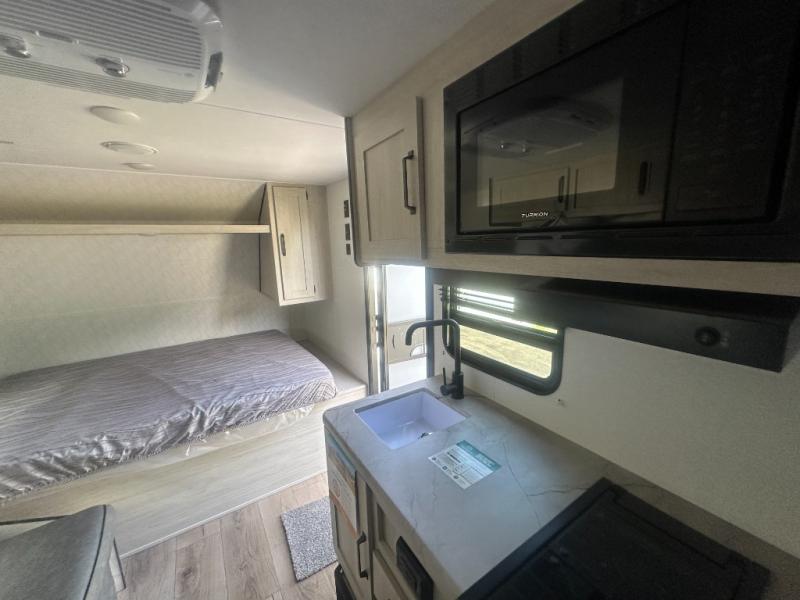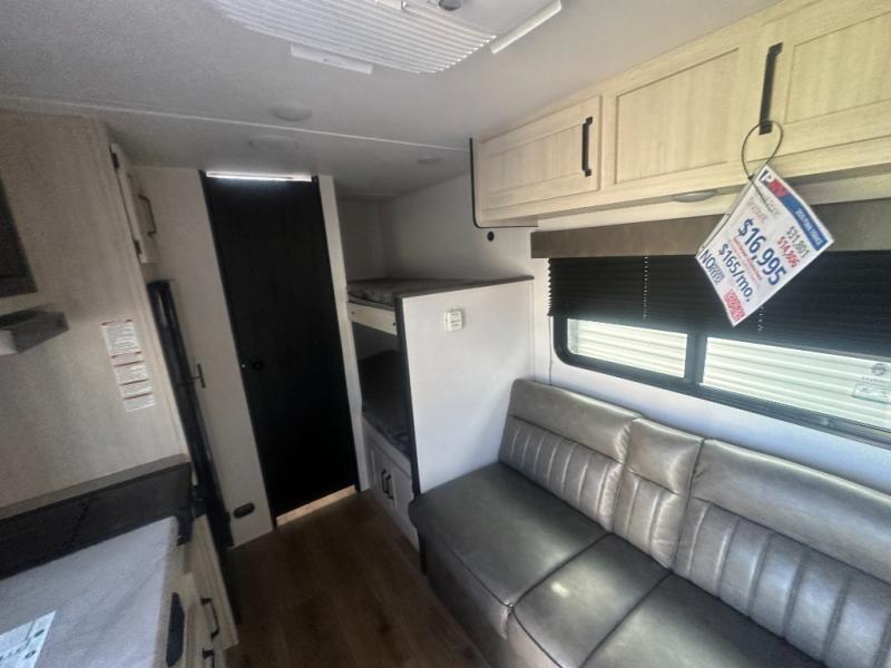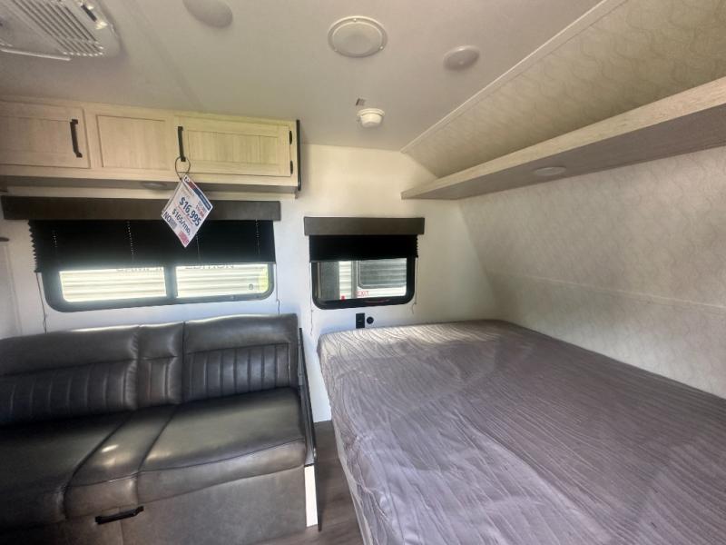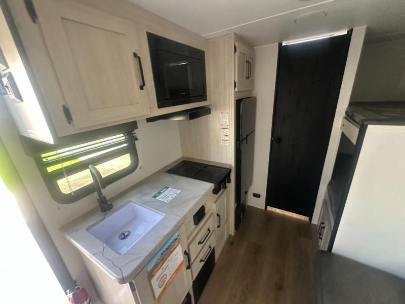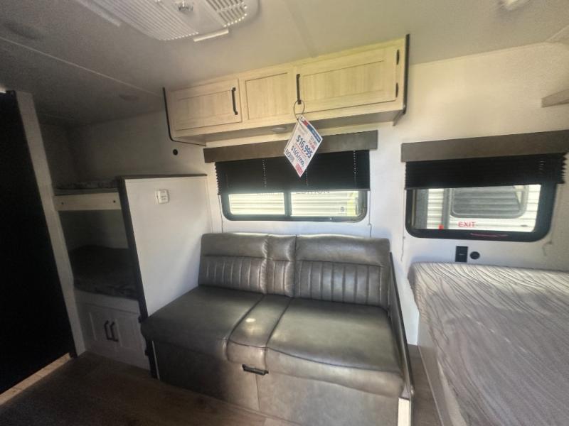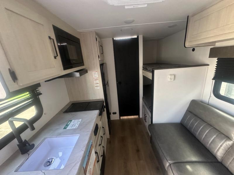 It will be so easy to enjoy camping trips in this single axle travel trailer! There is a front RV queen bed with flip-up storage at the foot of the bed for your belongings, and any additional guests can sleep on the bunk beds and sofa. A full kitchen includes a stainless two burner cooktop and stainless microwave to cook meals each day, and the 4.3 cu. ft. 12V black glass refrigerator will keep your food fresh. And a private bath with a toilet and shower will let you freshen up without having to use the camp's facilities!