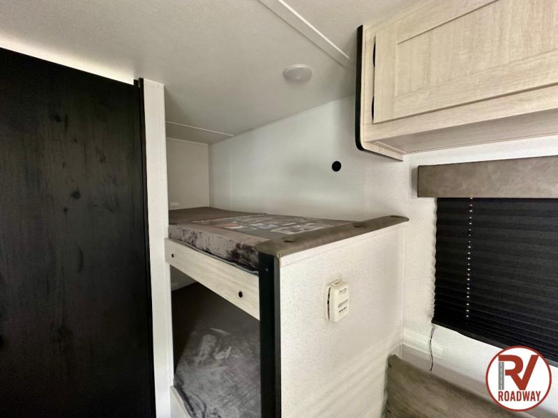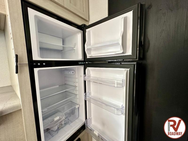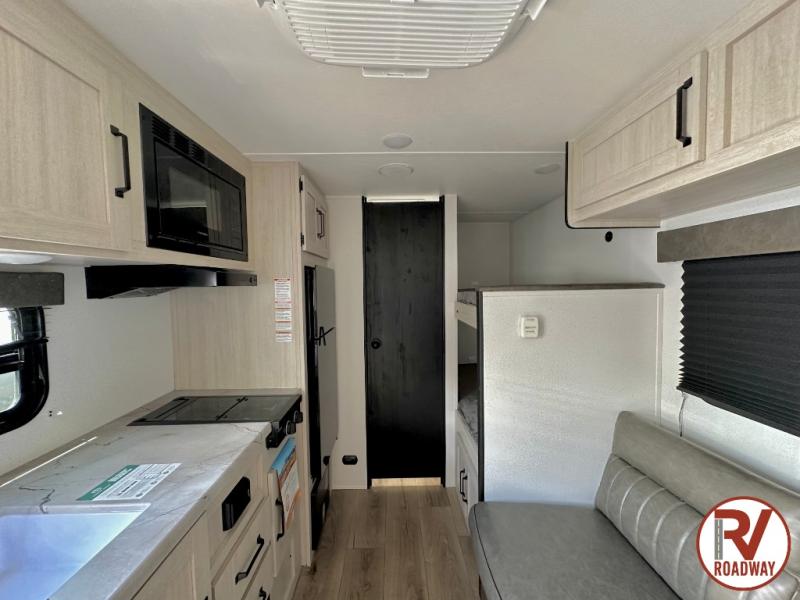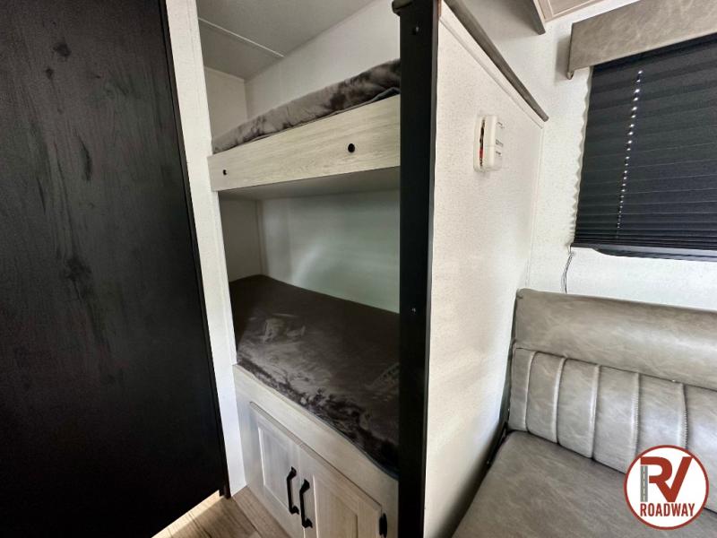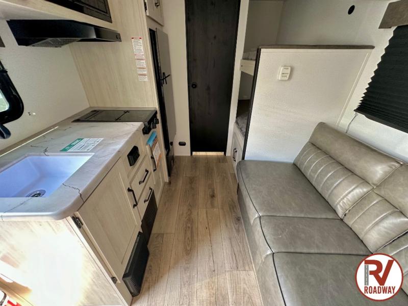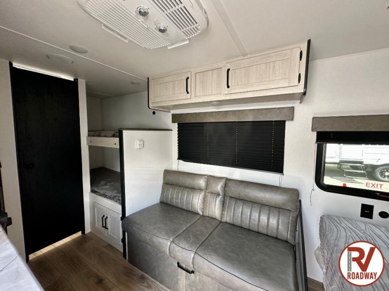 It will be so easy to enjoy camping trips in this single axle travel trailer! There is a front RV queen bed with flip-up storage at the foot of the bed for your belongings, and any additional guests can sleep on the bunk beds and sofa. A full kitchen includes a stainless two burner cooktop and stainless microwave to cook meals each day, and the 4.3 cu. ft. 12V black glass refrigerator will keep your food fresh. And a private bath with a toilet and shower will let you freshen up without having to use the camp's facilities!